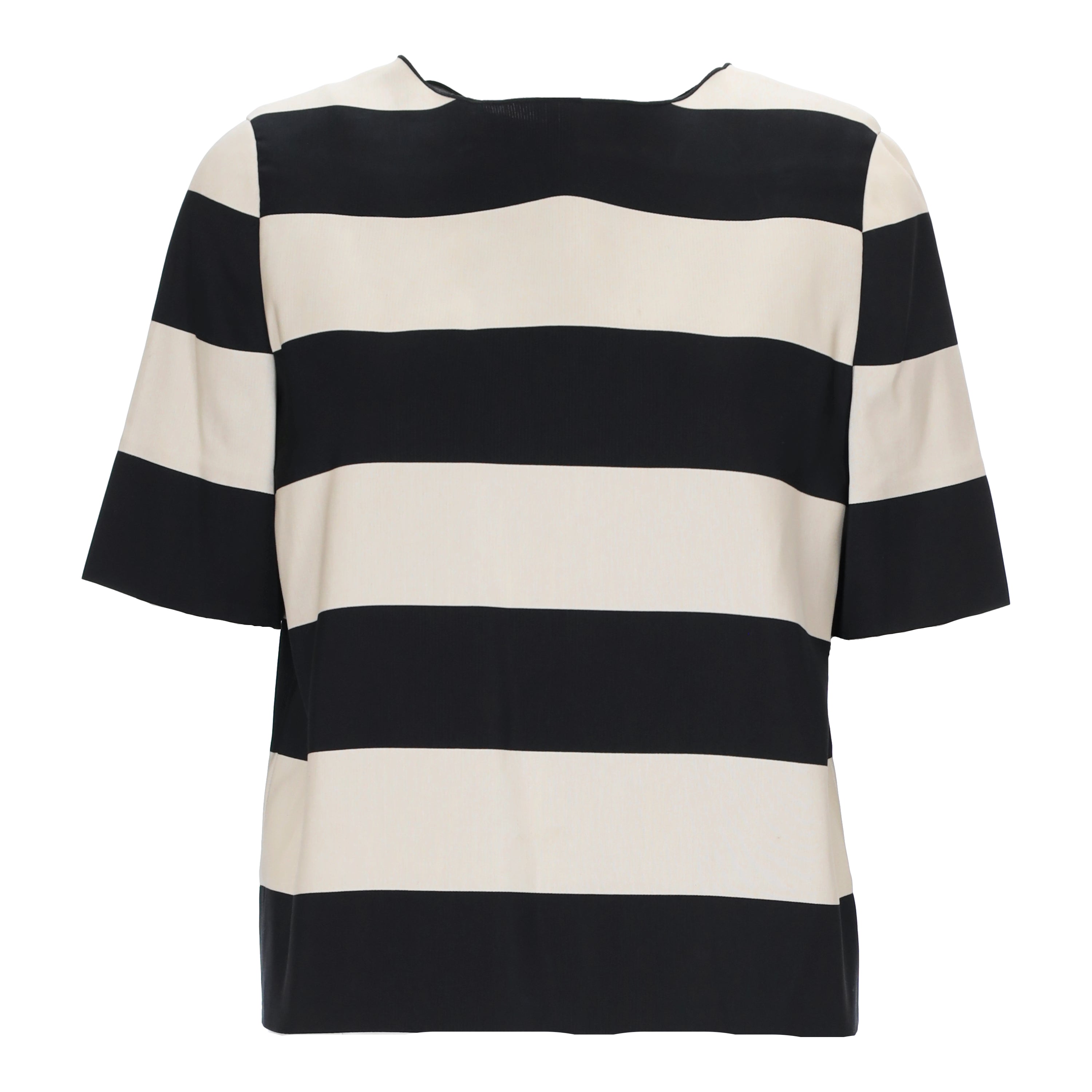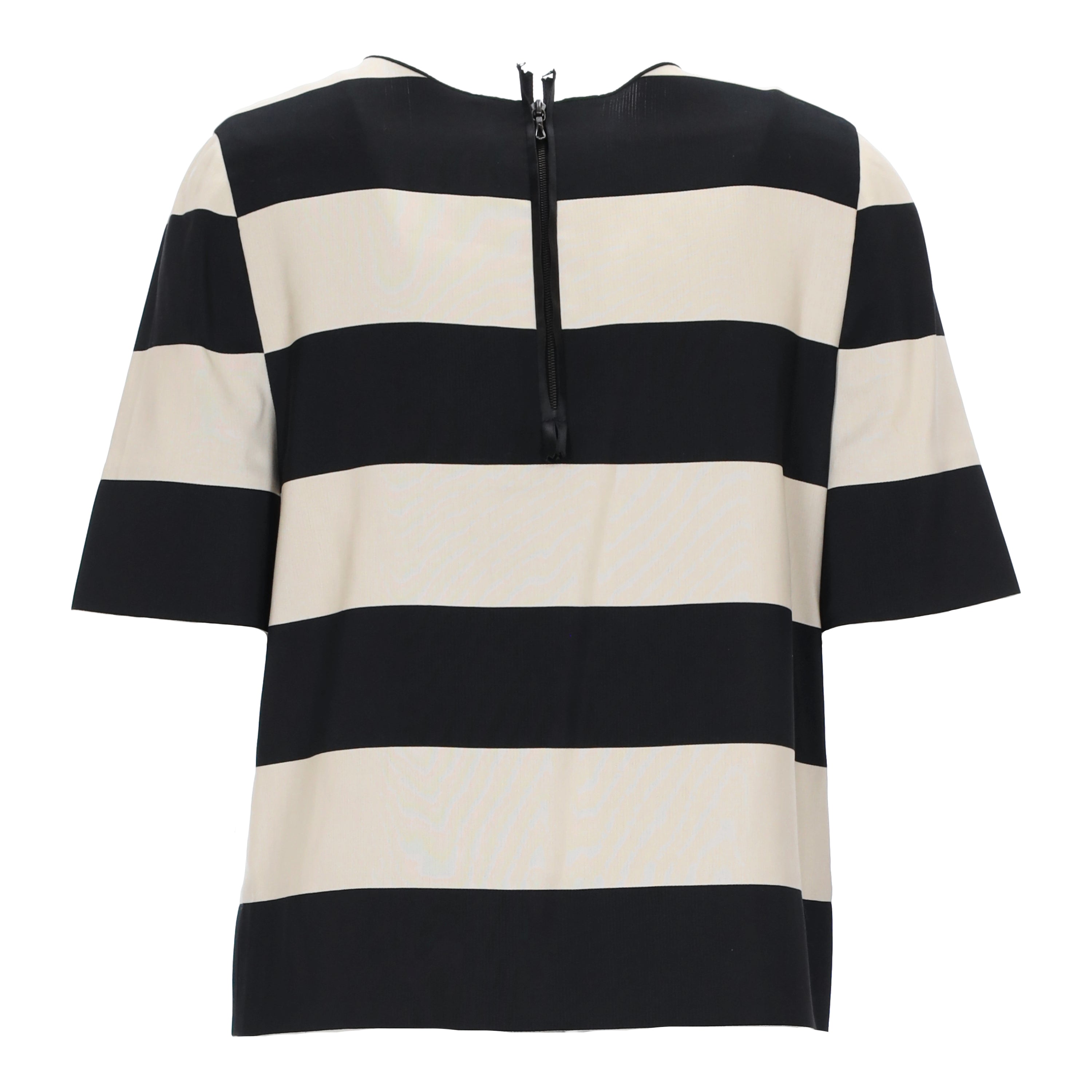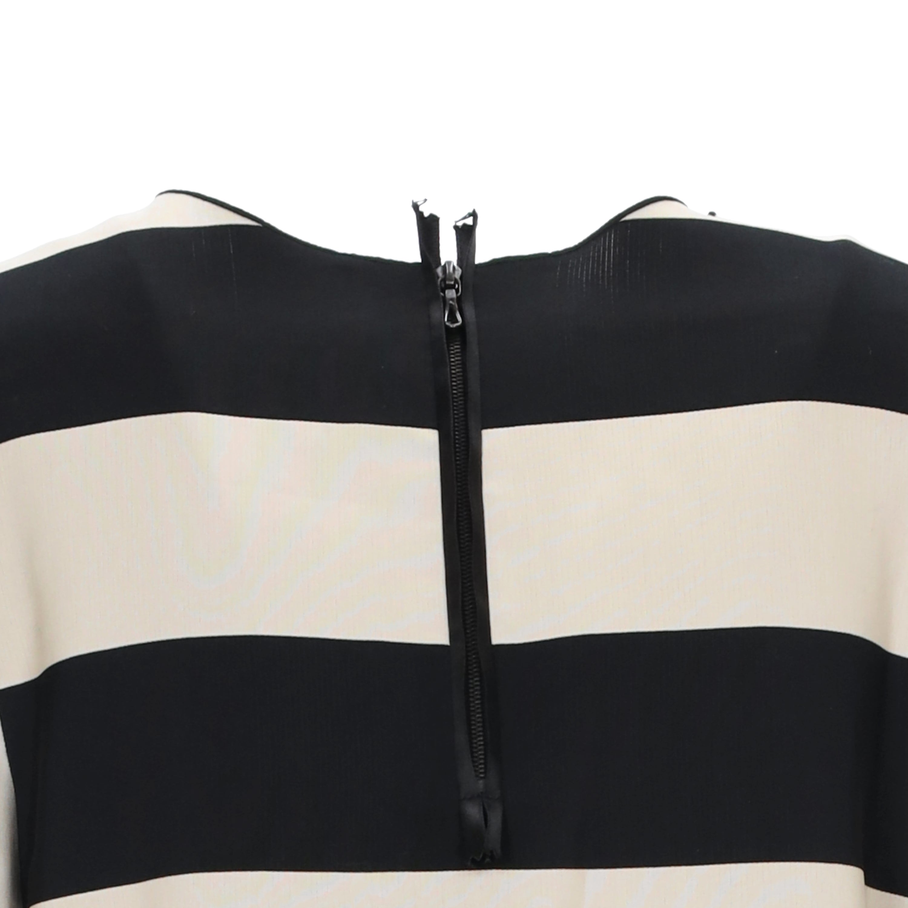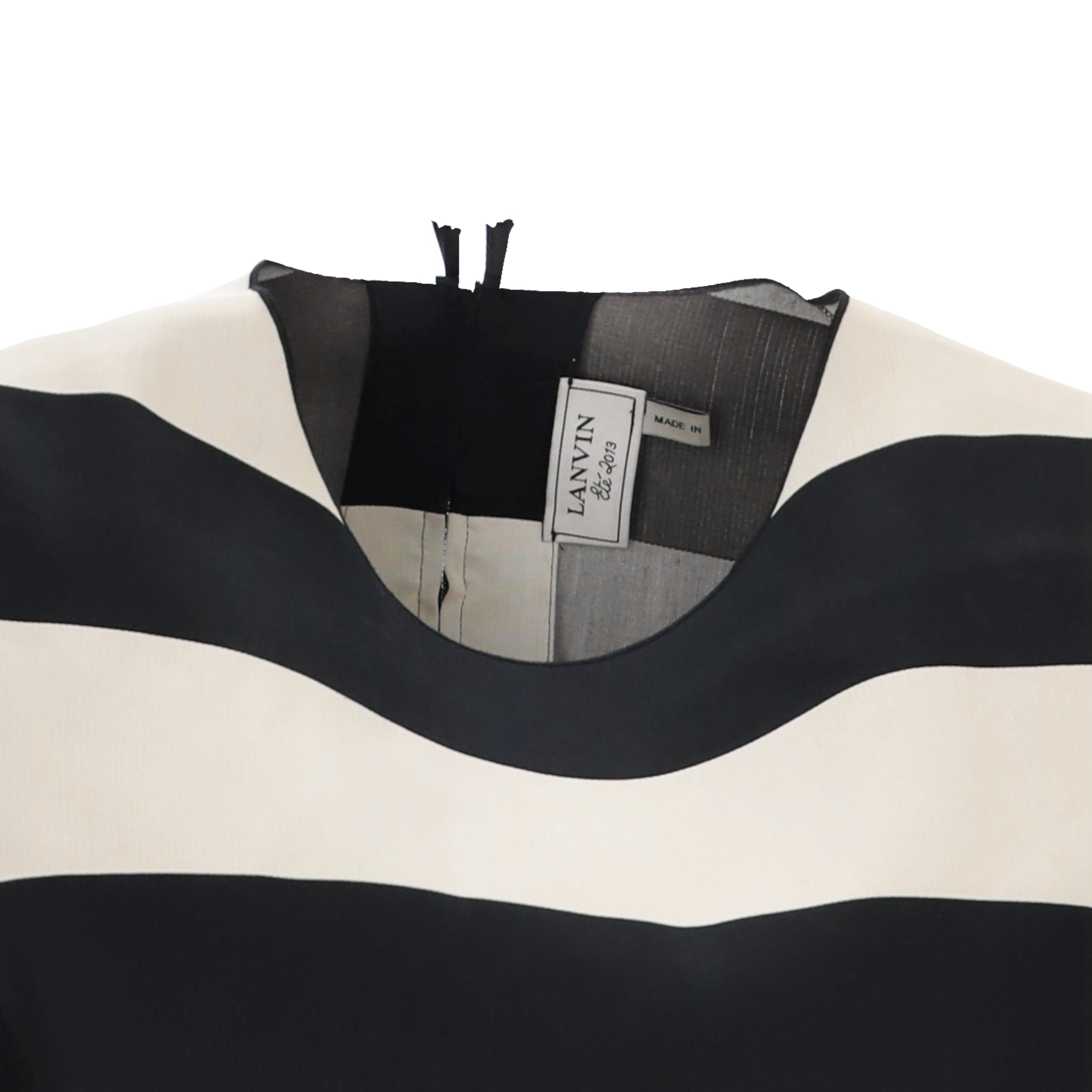 This Lanvin top is a classic French style from the Summer 2013 collection. Featuring sleek black and white horizontal stripes, a round neckline and a back zipper that stands out, this chic short sleeve top will become a staple item in your wardrobe.