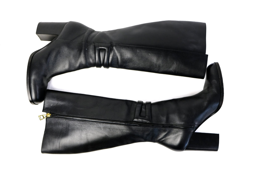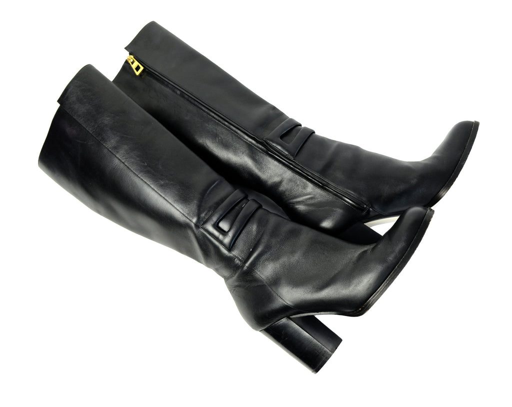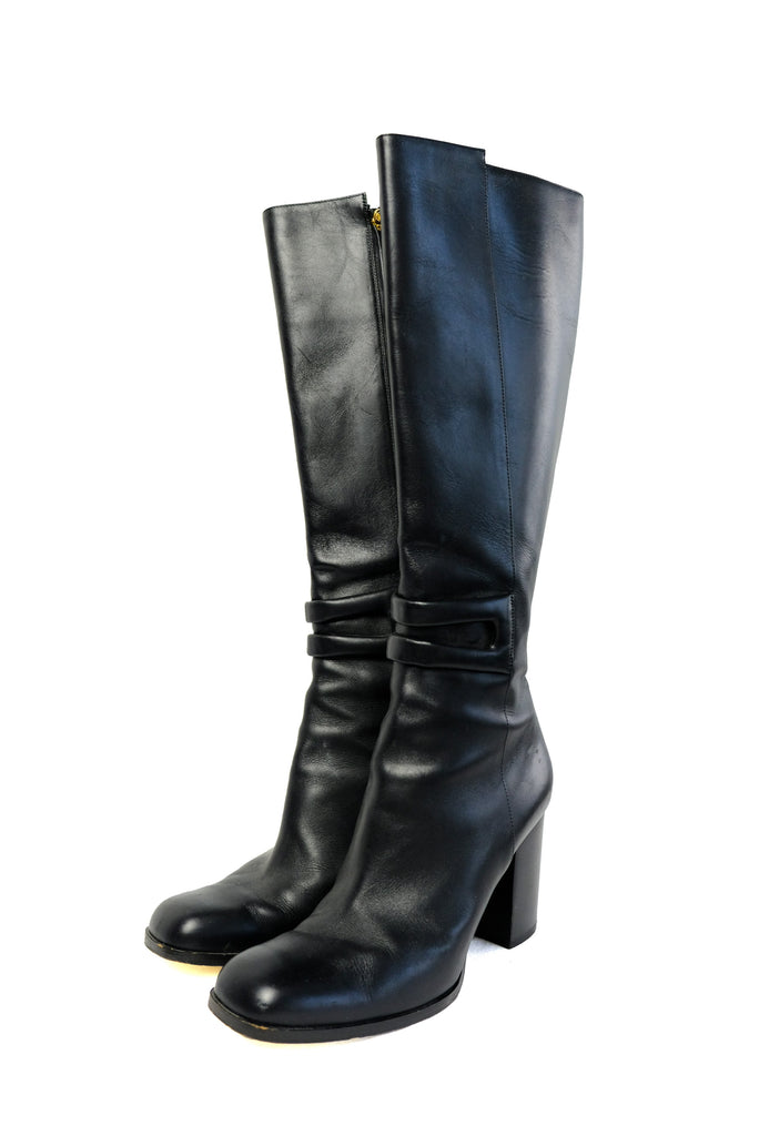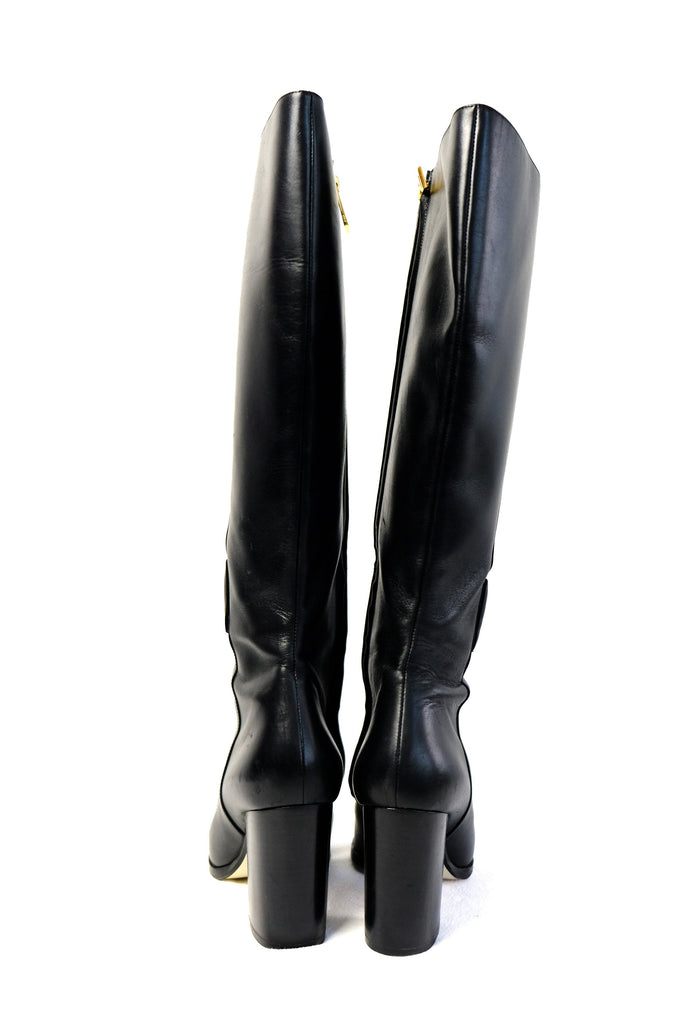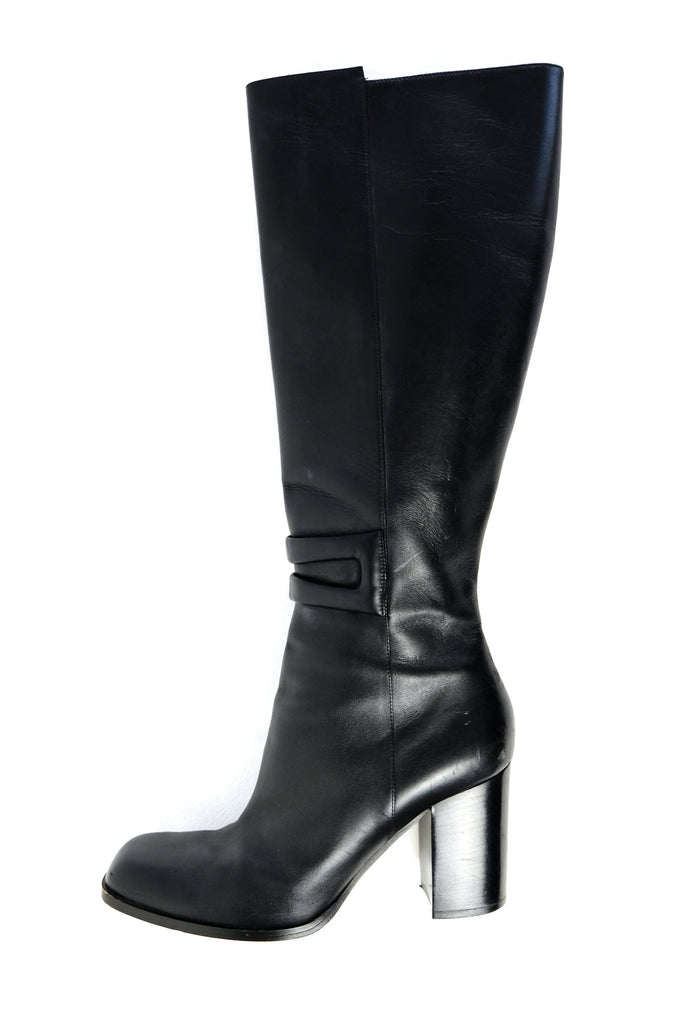 An incredible pair of knee boots by Loewe, in beautiful black leather. High block heel, squared off toes, inseam zip. Leather rectangular buckle at the front of the ankle.
