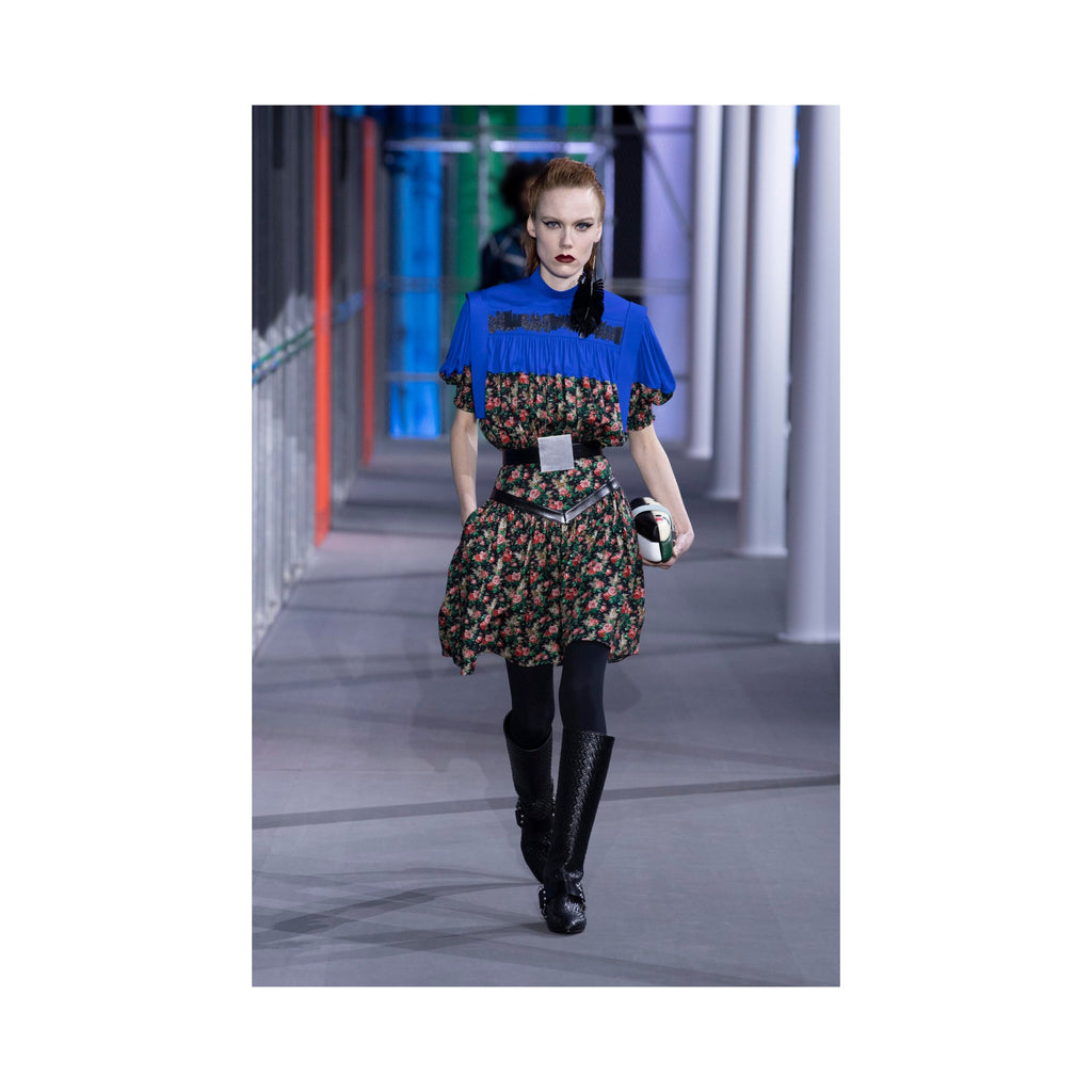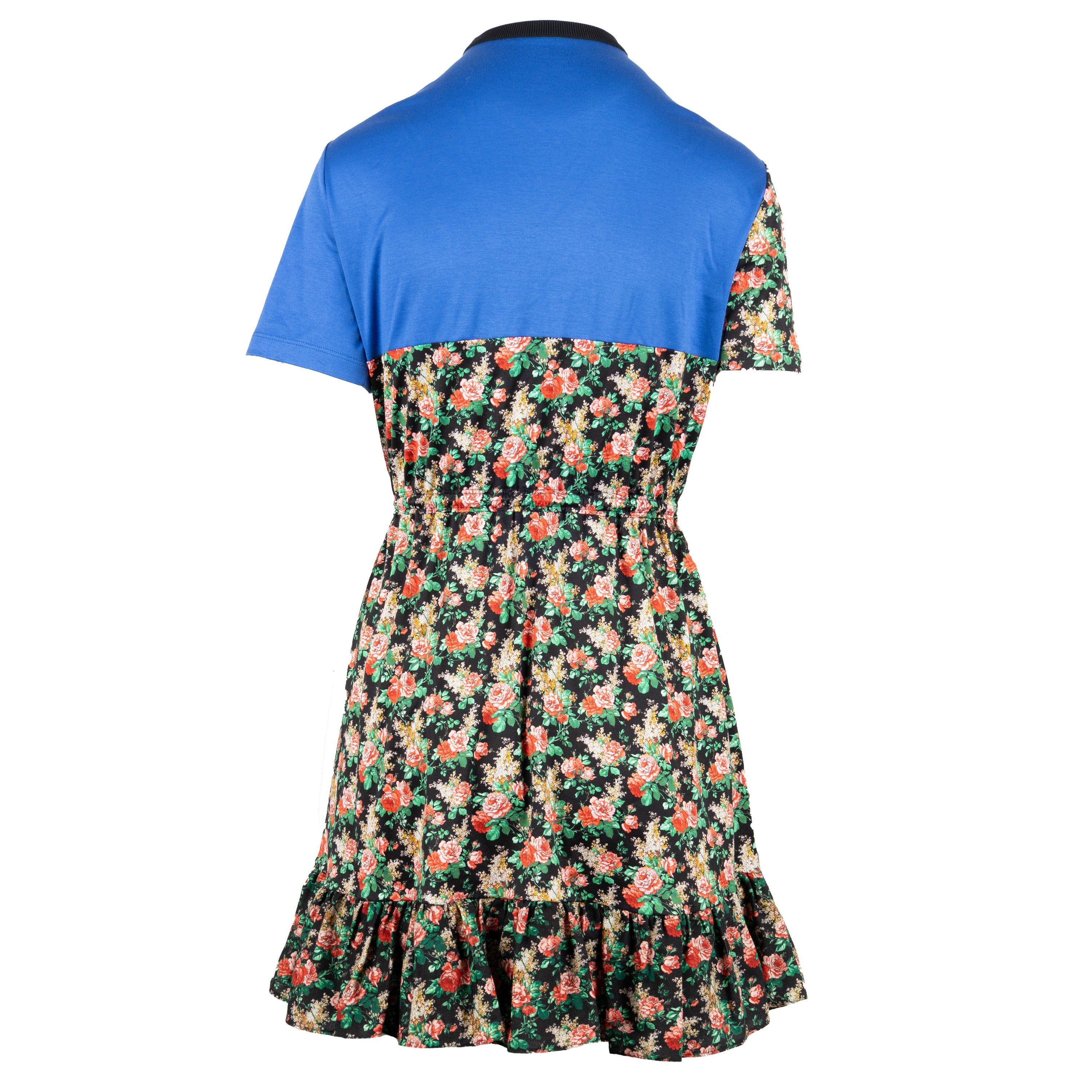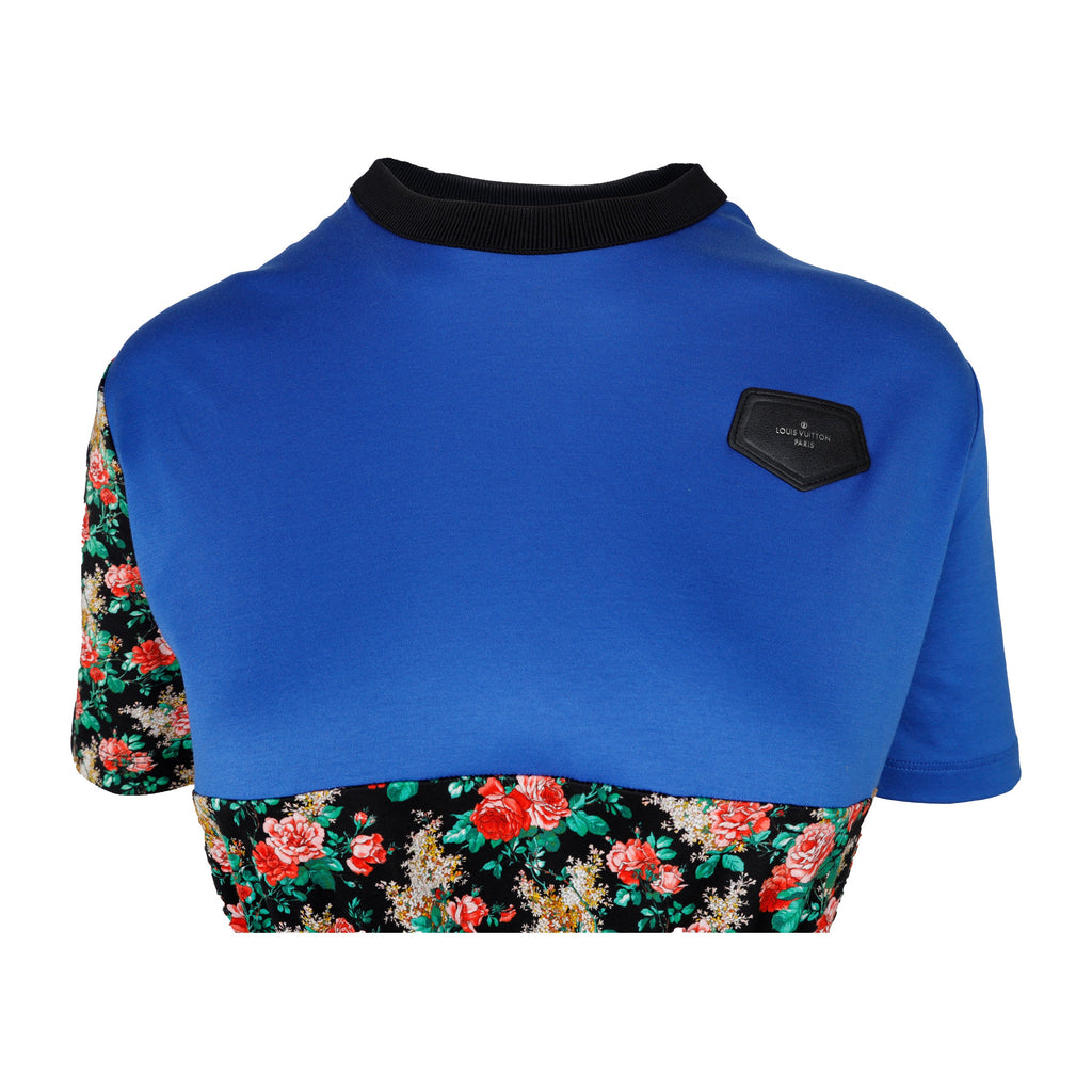 This Louis Vuitton t-shirt dress is crafted with 100% cotton and ribbed crew neckline for ultimate comfort. Featured in the Fall 2019 collection, it boasts a stunning colorblock design with a rose floral print and blue base. A waist-cinching elastized tie-knot provides a flattering silhouette to complete the look.
