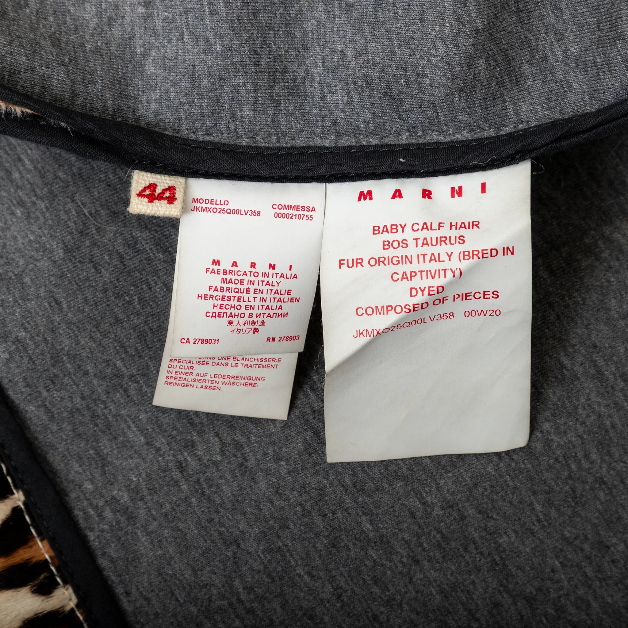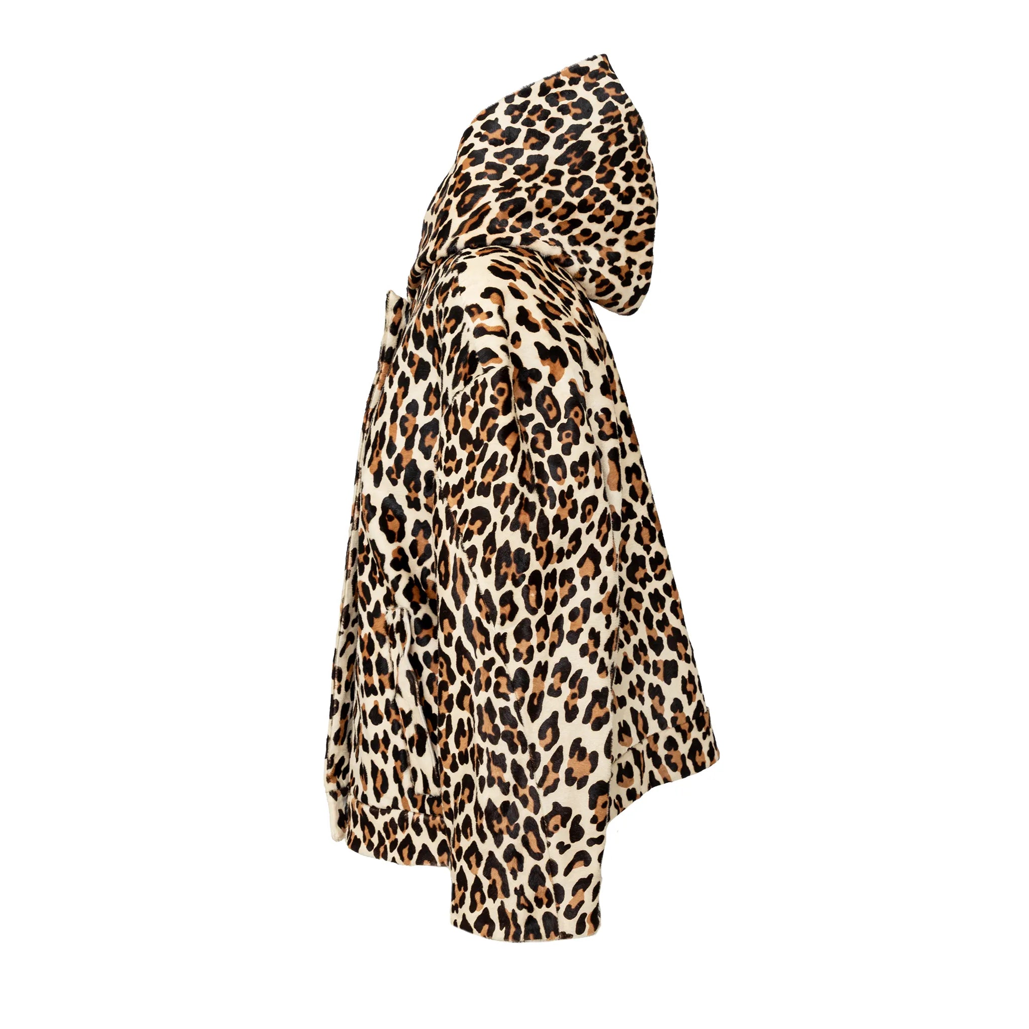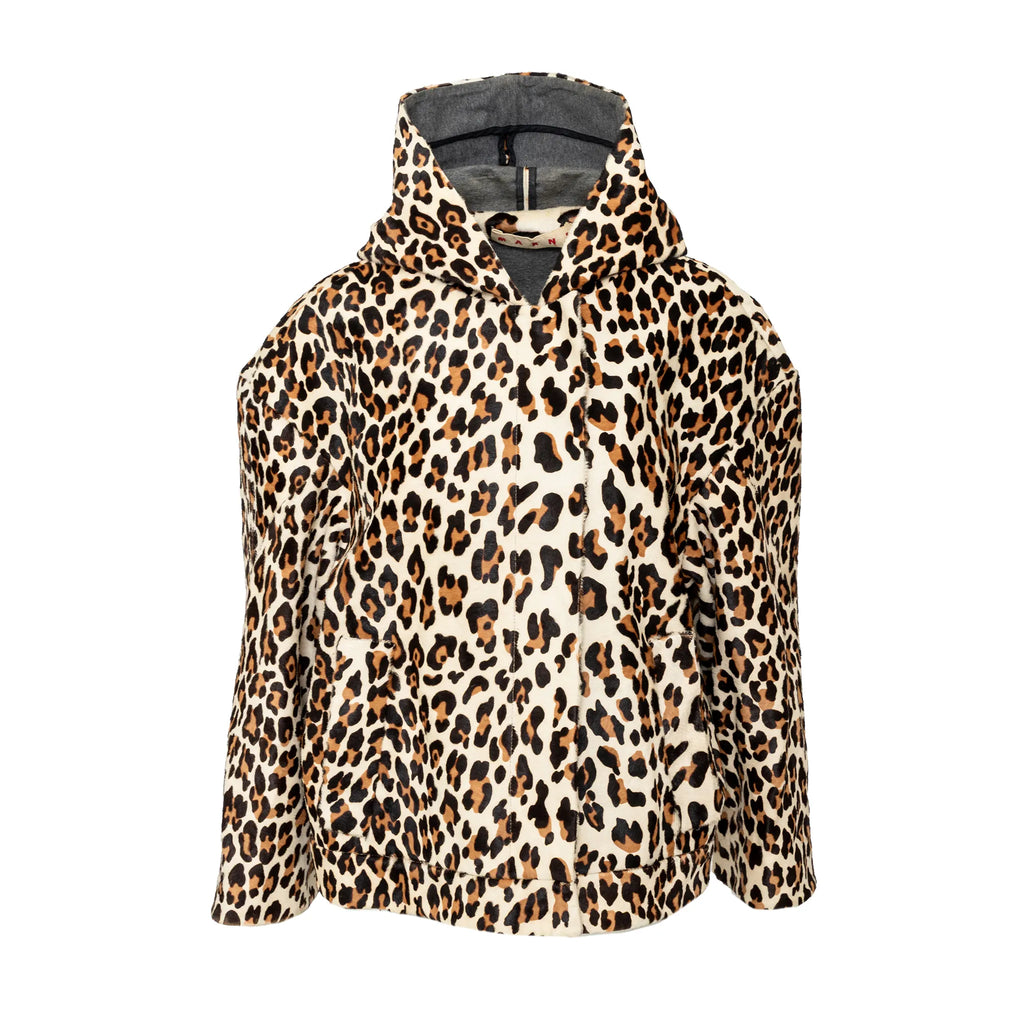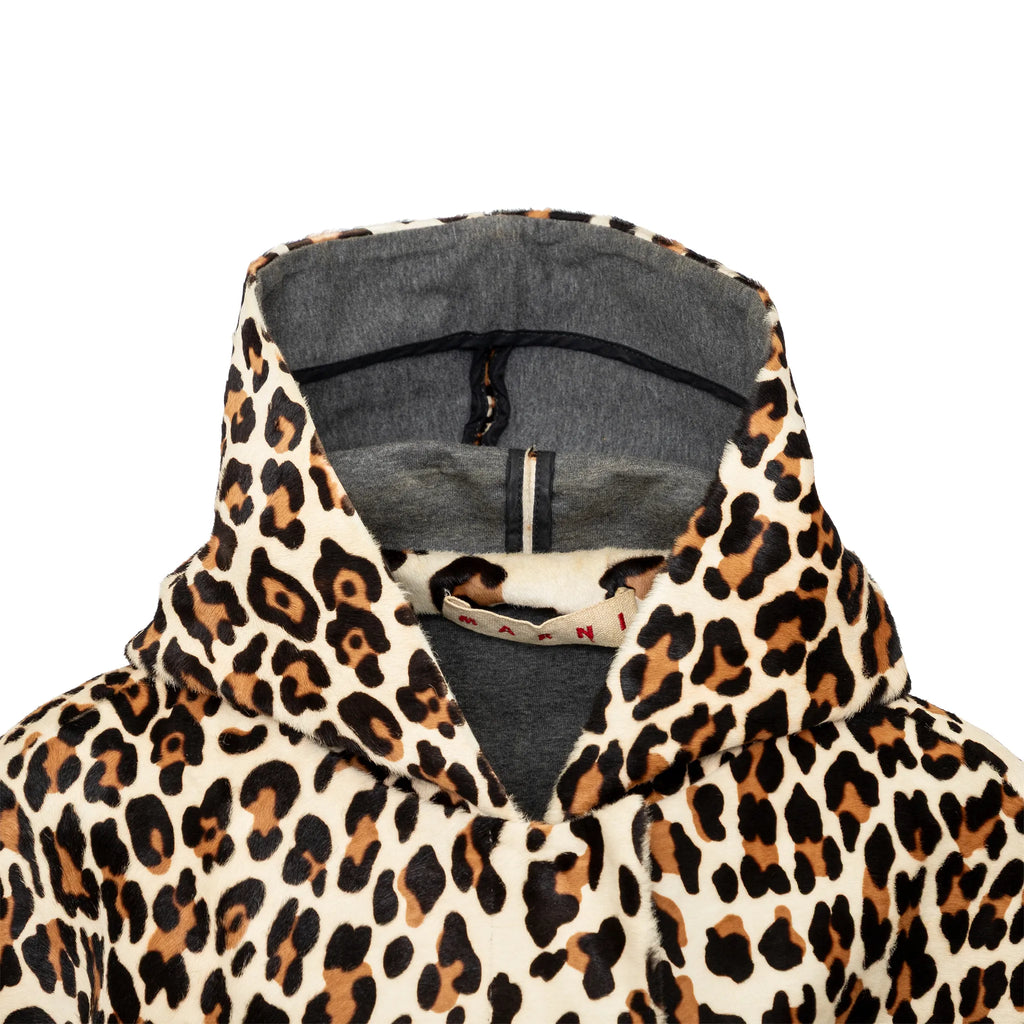 Marni calf-hair jacket in printed leopard, featuring a hood, snap button closure, and soft cotton lining for a bold yet comfortable statement piece.