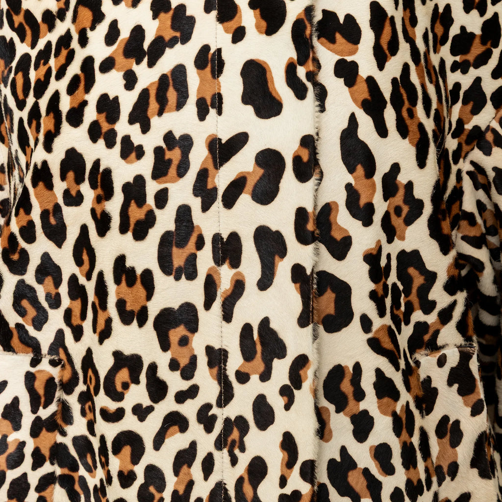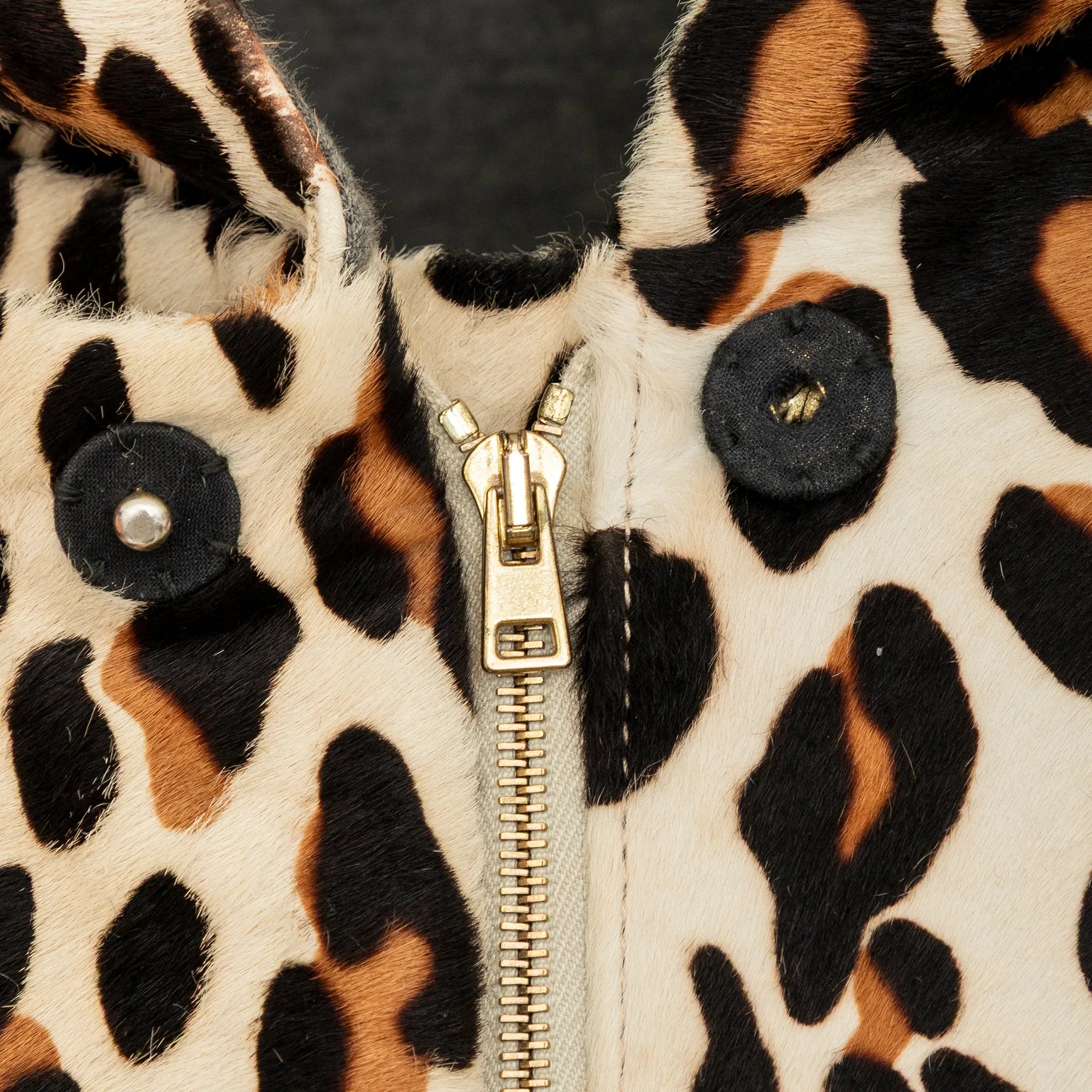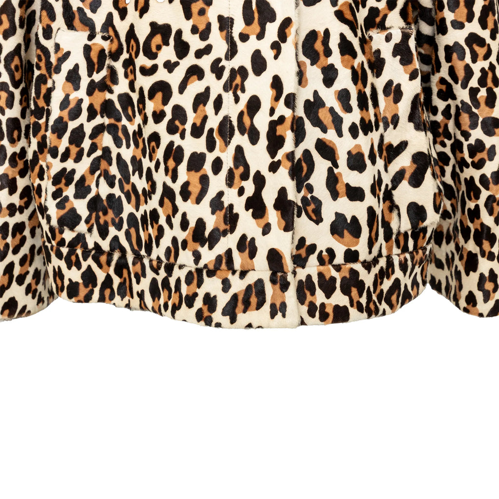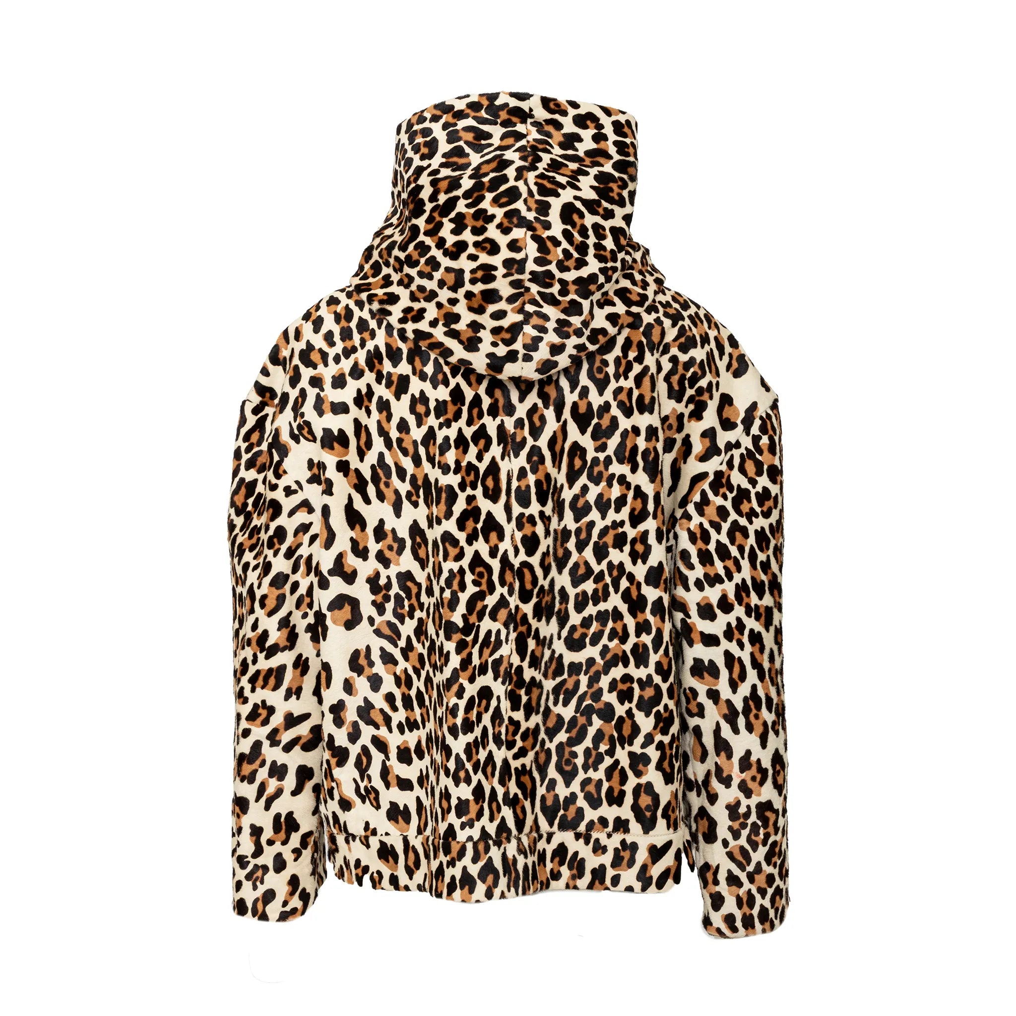 Marni calf-hair jacket in printed leopard, featuring a hood, snap button closure, and soft cotton lining for a bold yet comfortable statement piece.