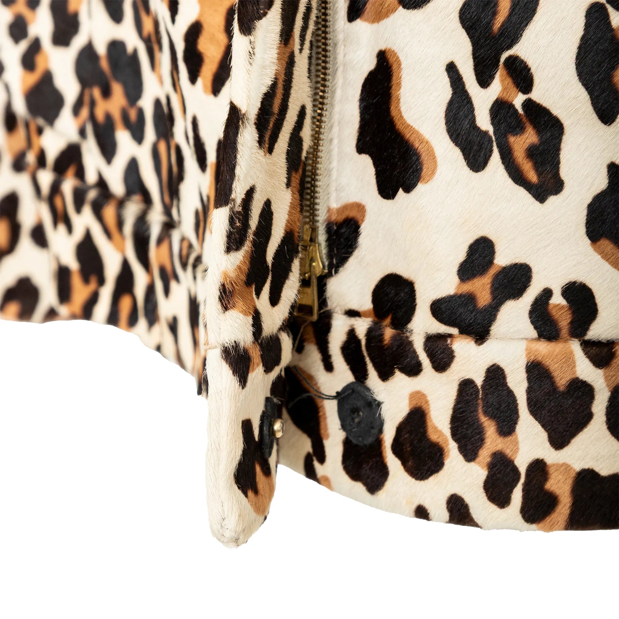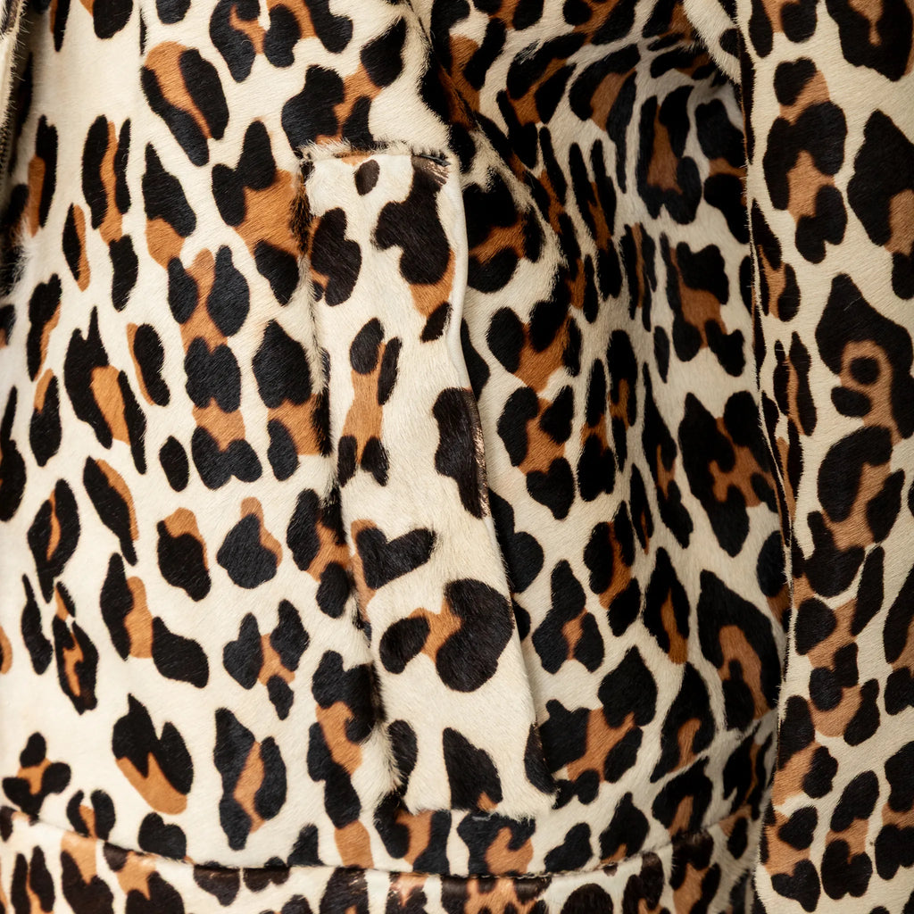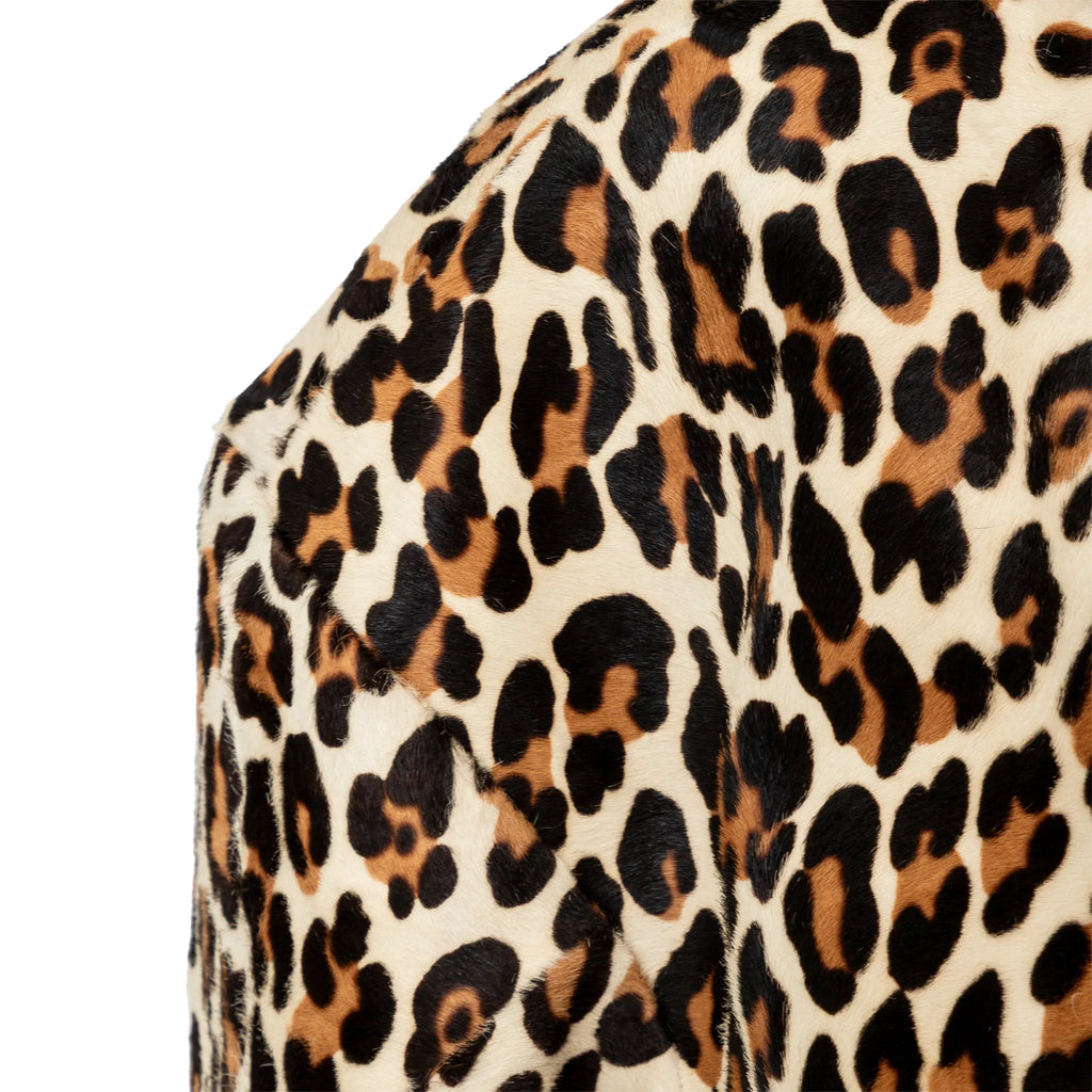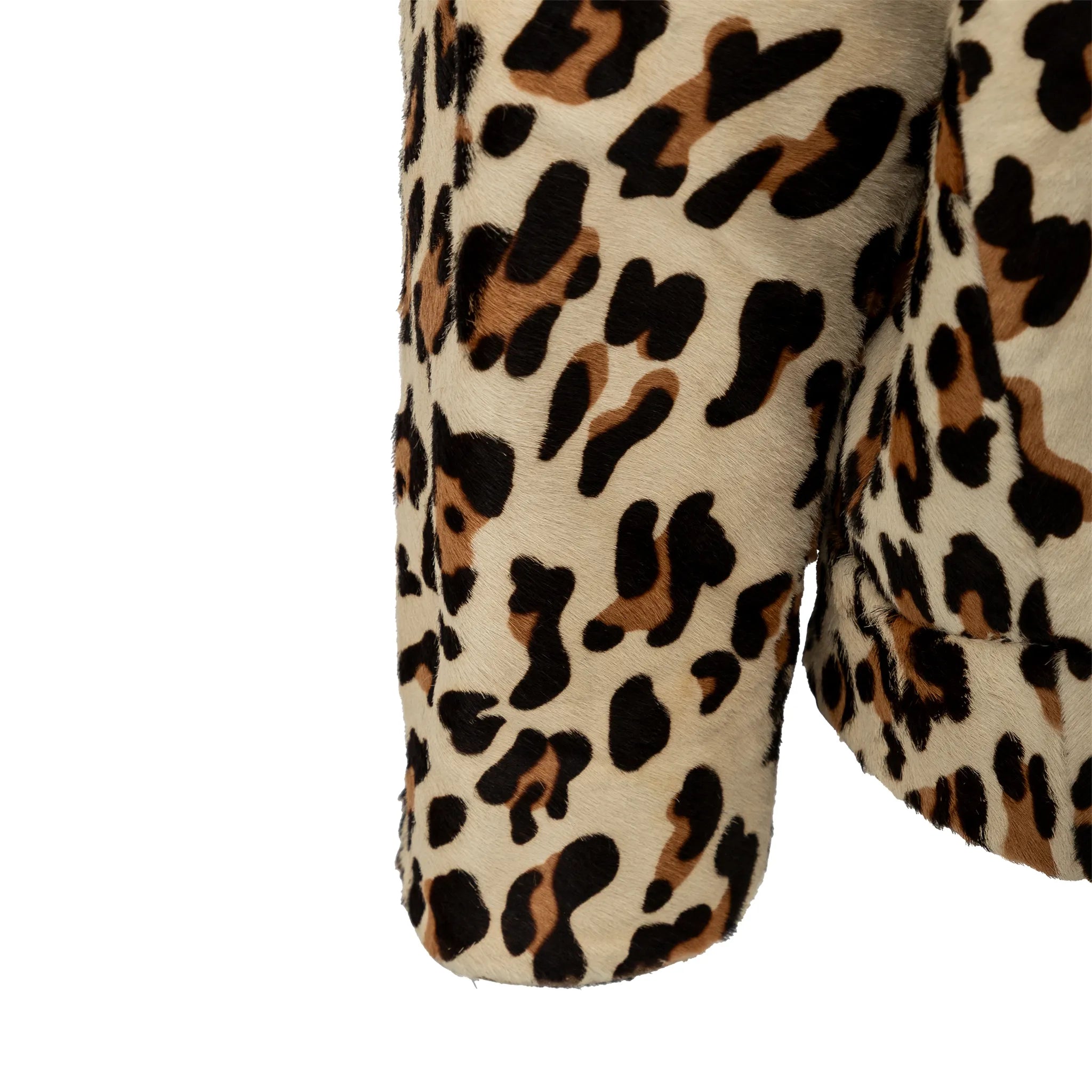 Marni calf-hair jacket in printed leopard, featuring a hood, snap button closure, and soft cotton lining for a bold yet comfortable statement piece.