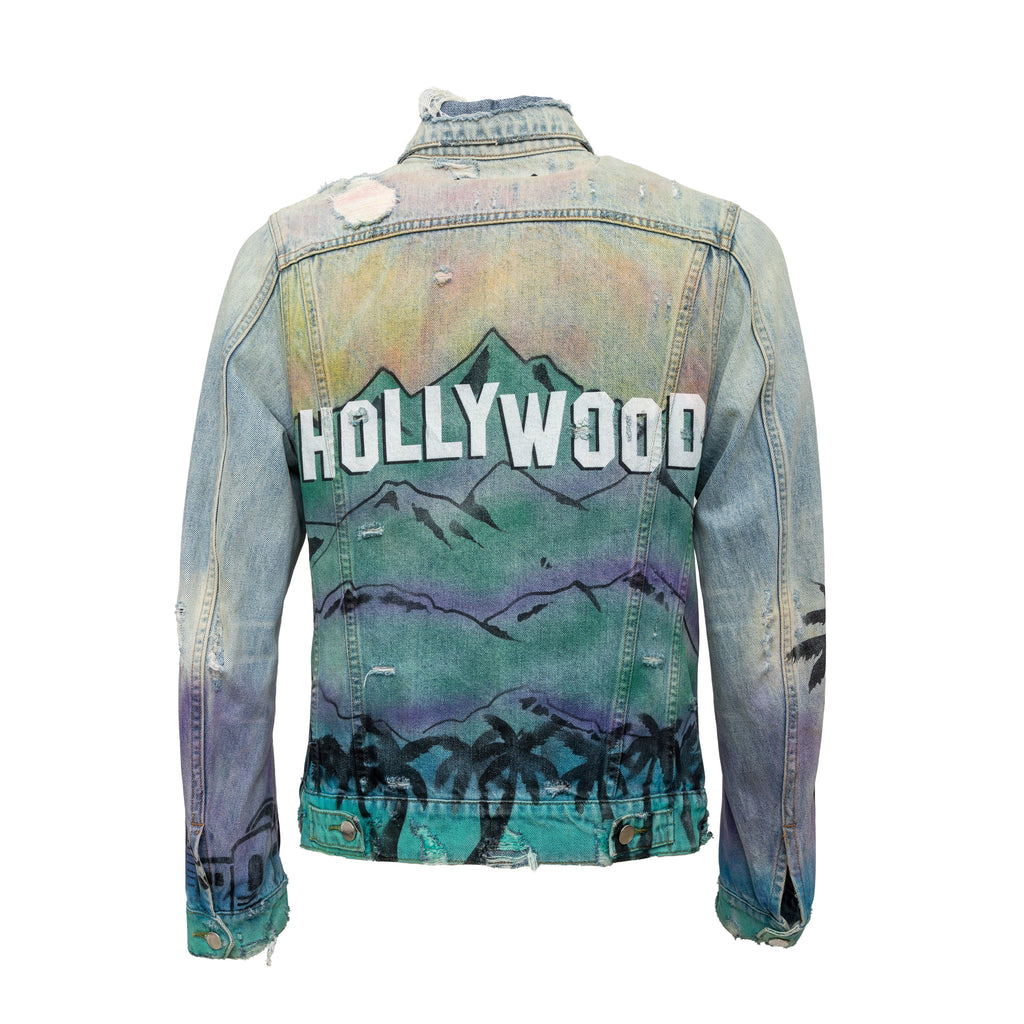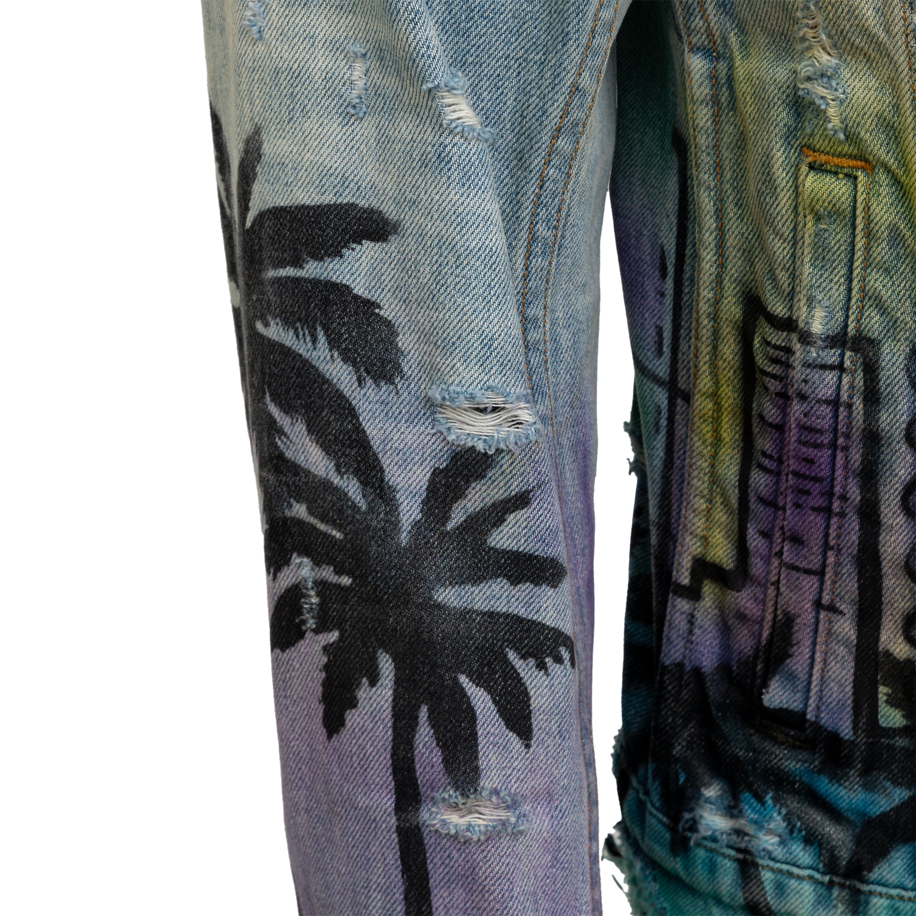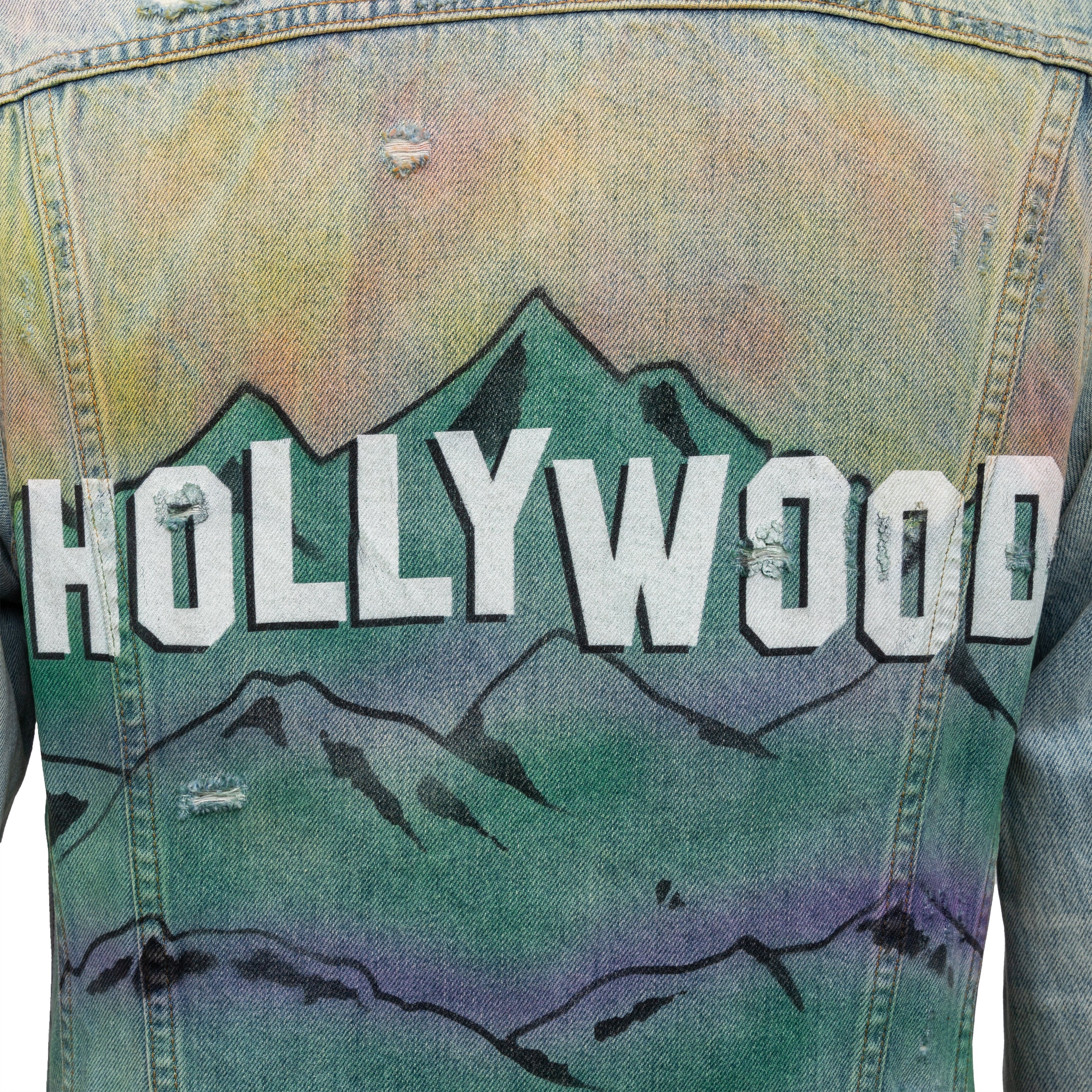 Experience West Coast cool with Amiri's SS19 Distressed 'Hollywood' Denim Jacket. Made with cotton denim, this jacket features a unique city silhouette and Hollywood hills print. Distressed for added edge, it's the perfect addition to any streetwear look.