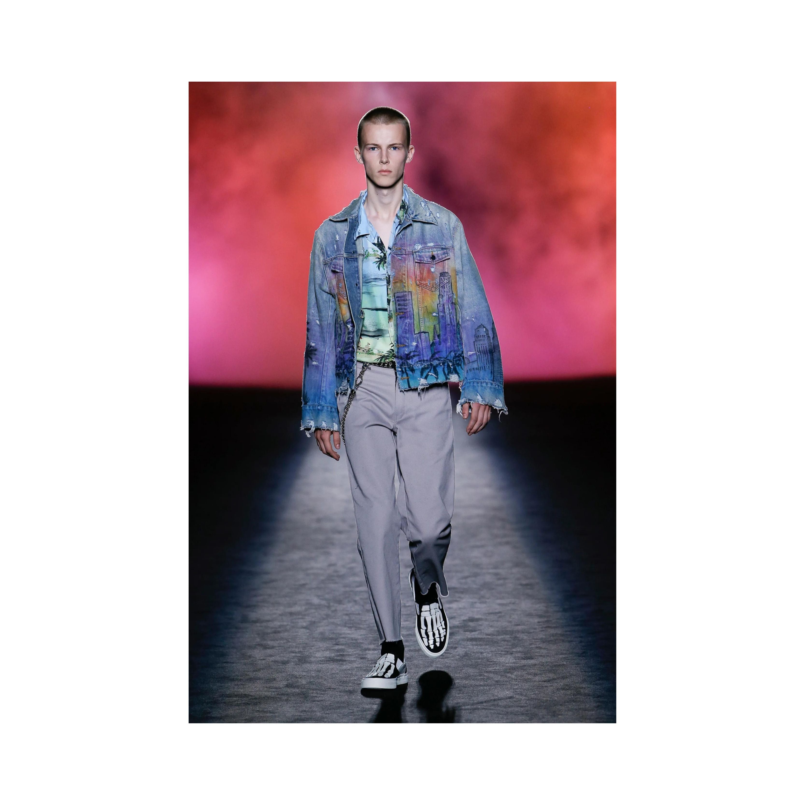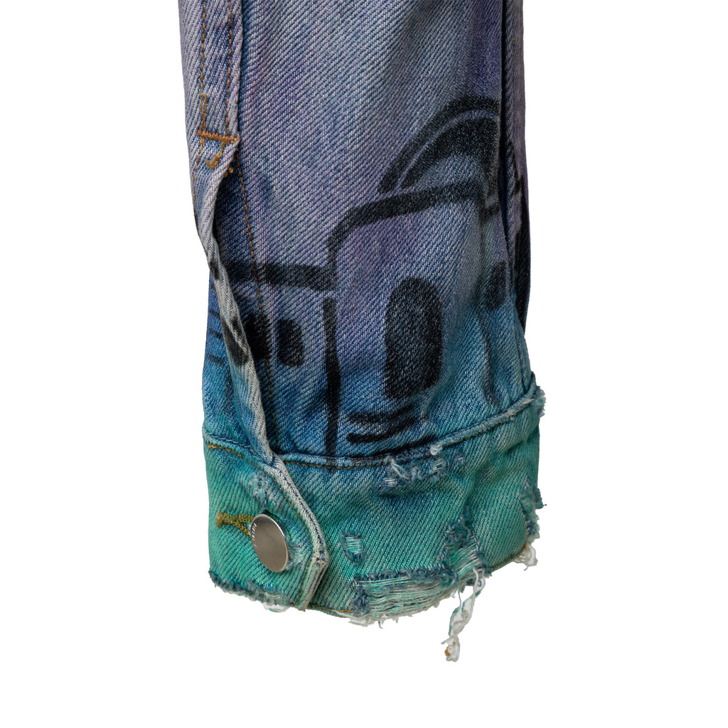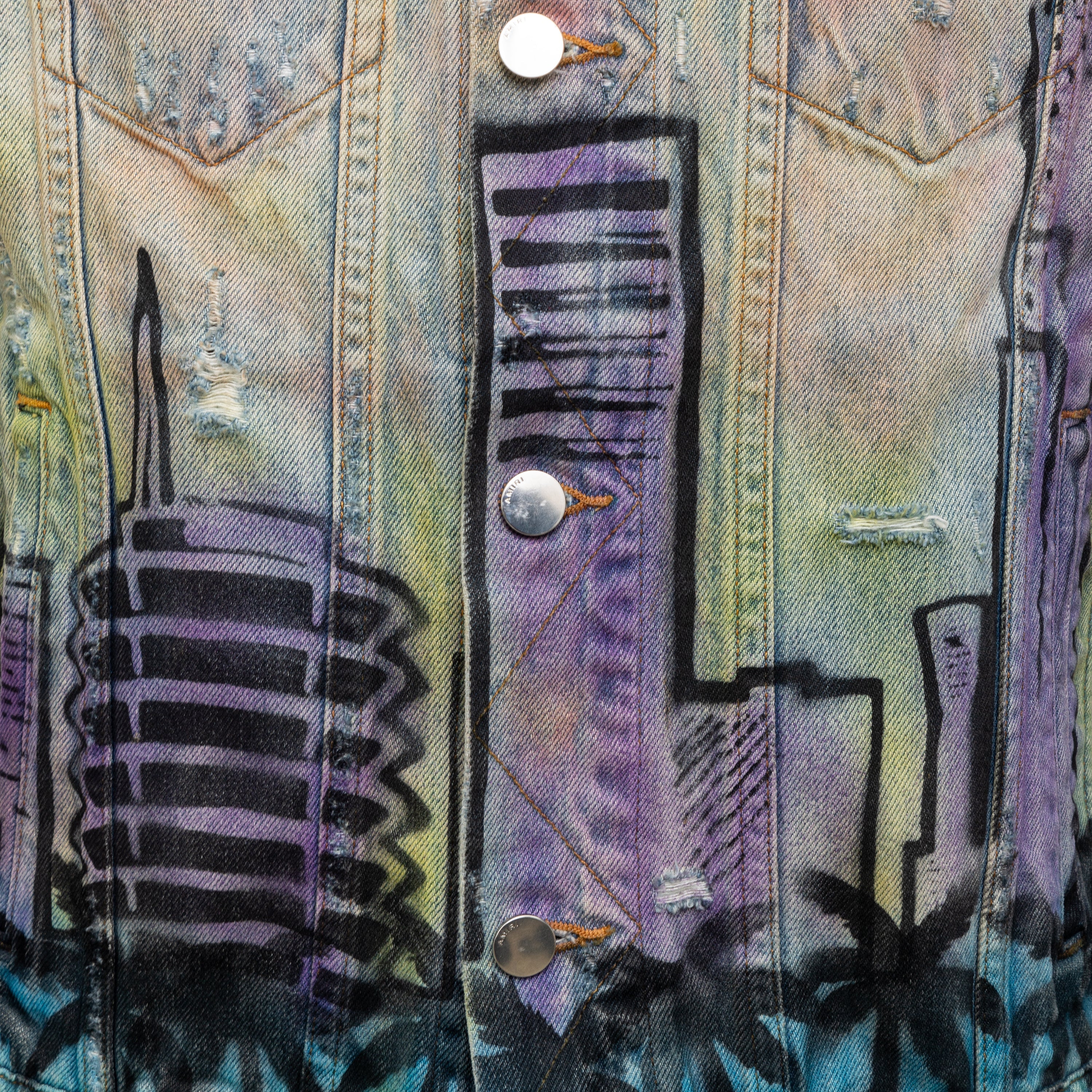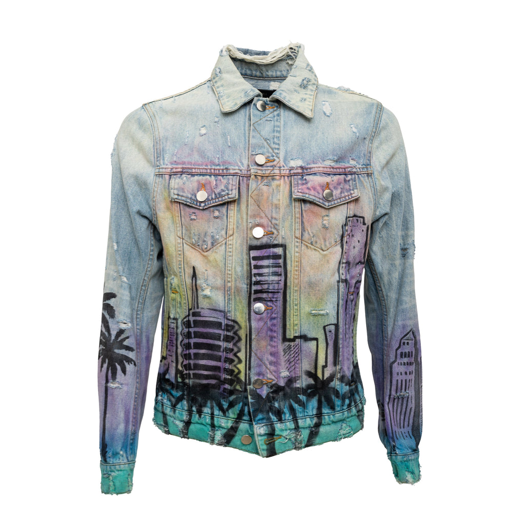 Experience West Coast cool with Amiri's SS19 Distressed 'Hollywood' Denim Jacket. Made with cotton denim, this jacket features a unique city silhouette and Hollywood hills print. Distressed for added edge, it's the perfect addition to any streetwear look.