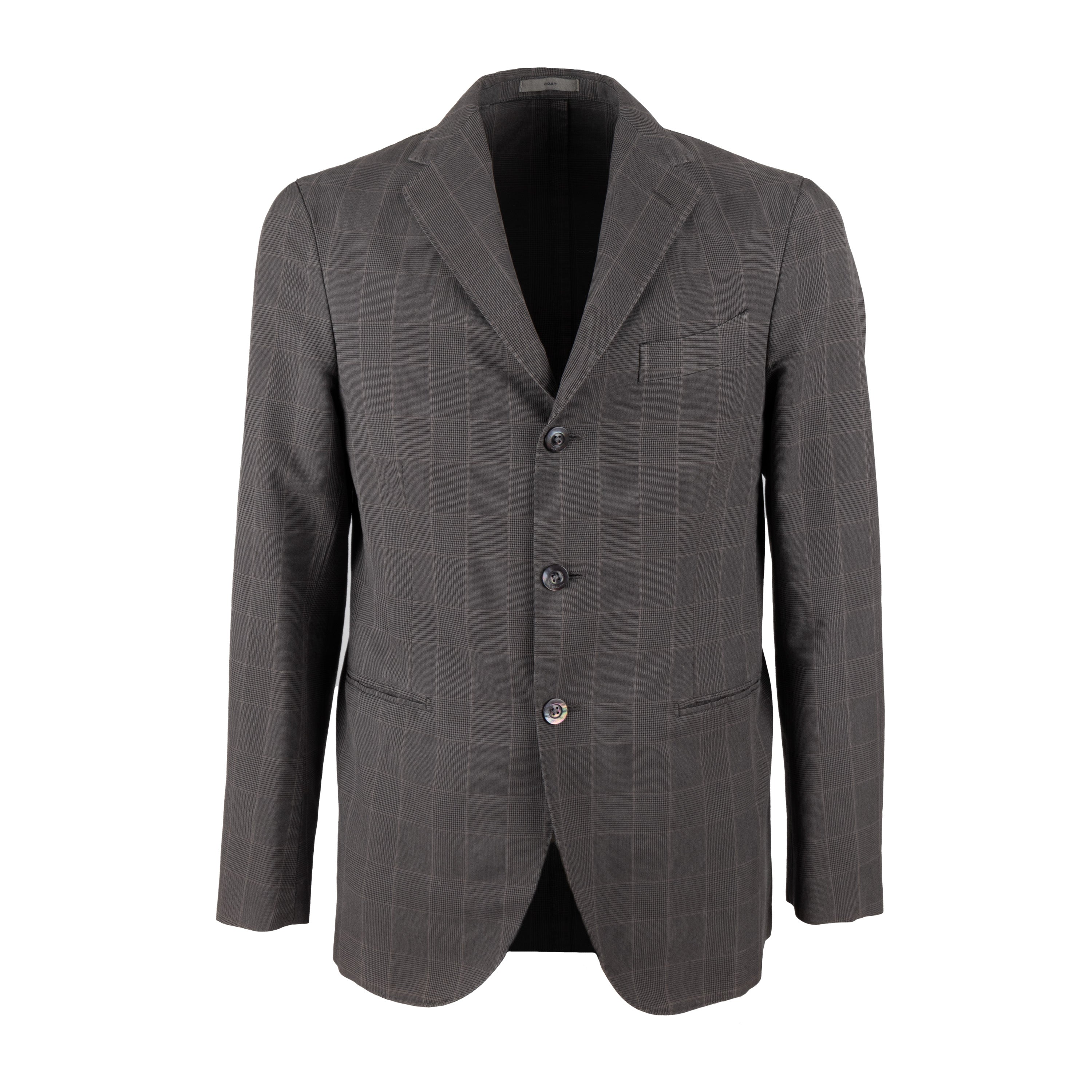 This lightweight Boglioli Checkered Jacket is crafted from a breathable cotton blend with mohair for warm weather. Perfect for formal or casual occasions, this jacket features a regular fit, three-button closure, and dual vents with a notched lapel in a medium brown checkered plaid fabric.