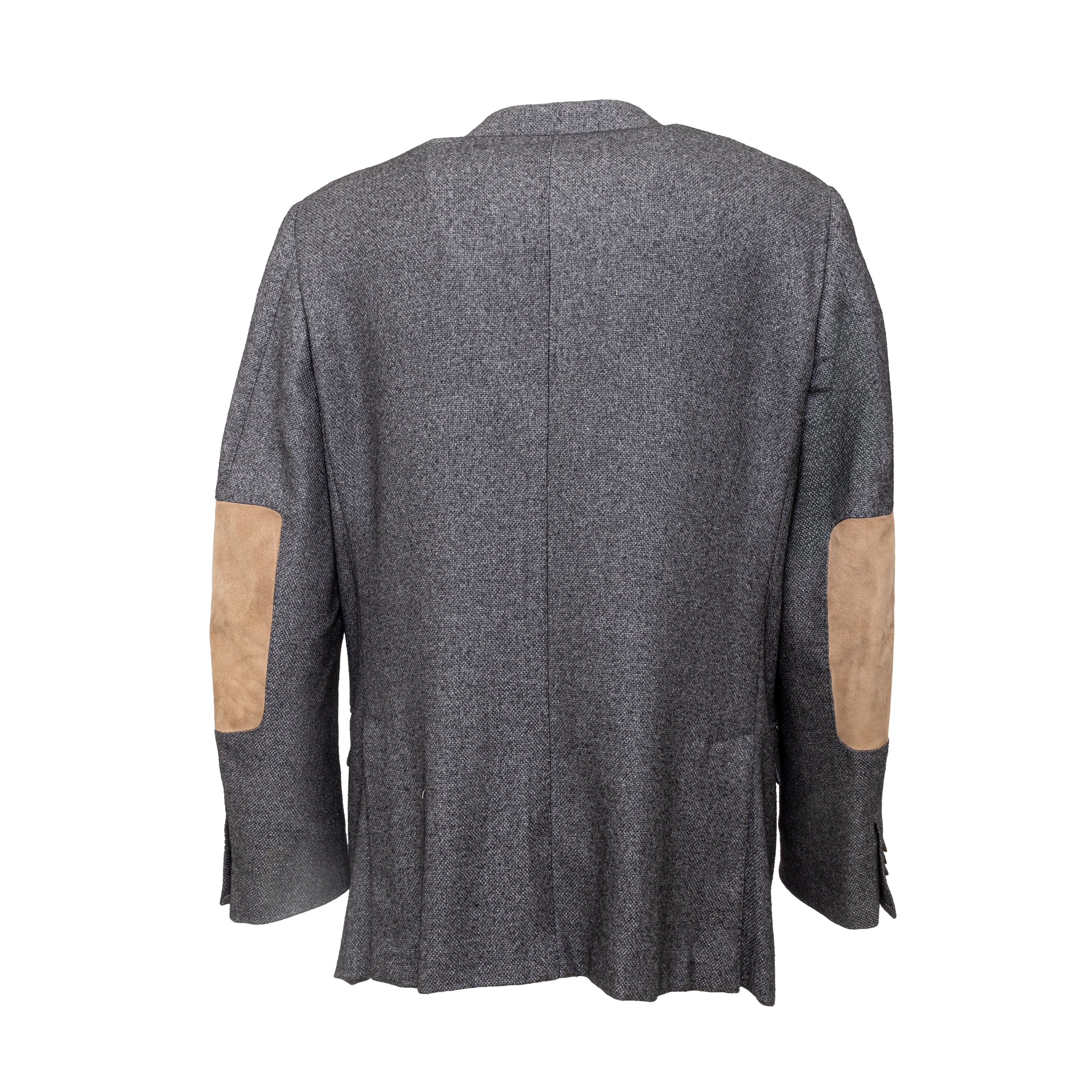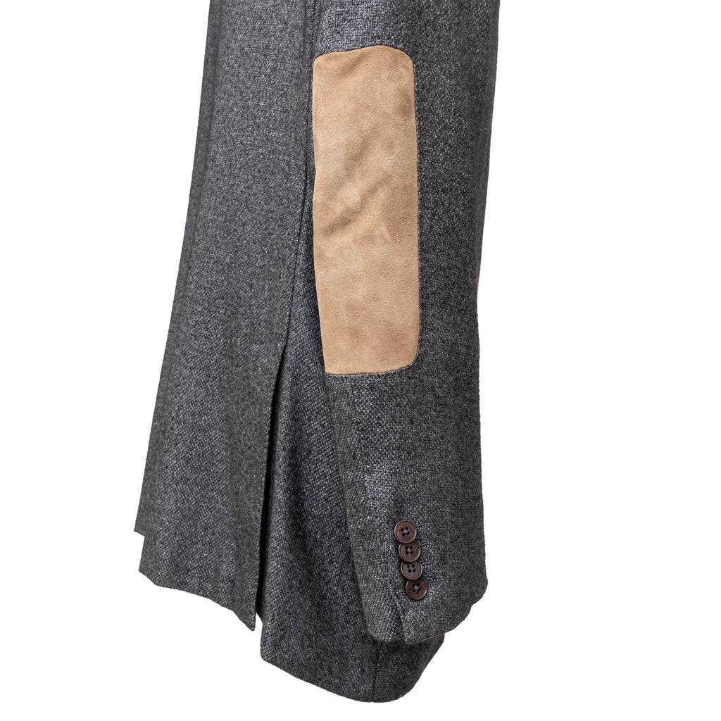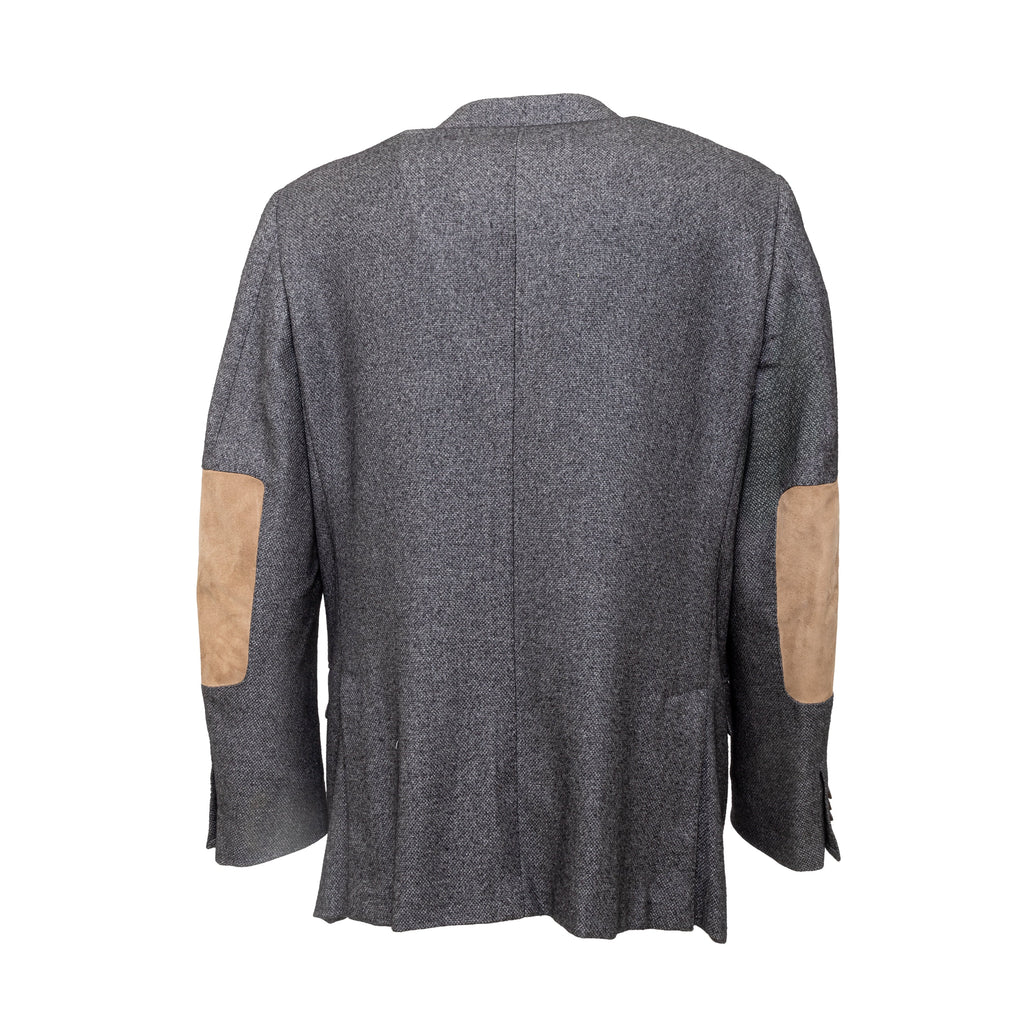 Expertly crafted from a luxurious blend of silk and cashmere, the Ermenegildo Zegna Fairway Jacket exudes sophistication. The melange grey color complements the 3 front buttons and flap pockets. Unlined for lightness, with a beige suede patch on the elbows, ensuring both comfort and style.