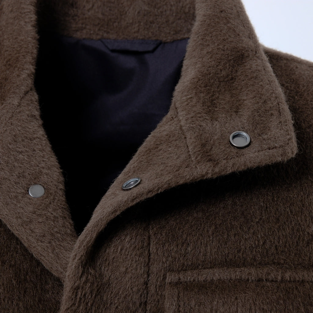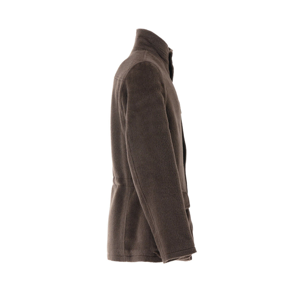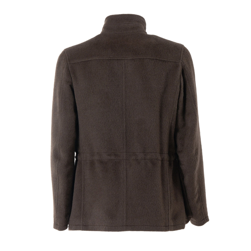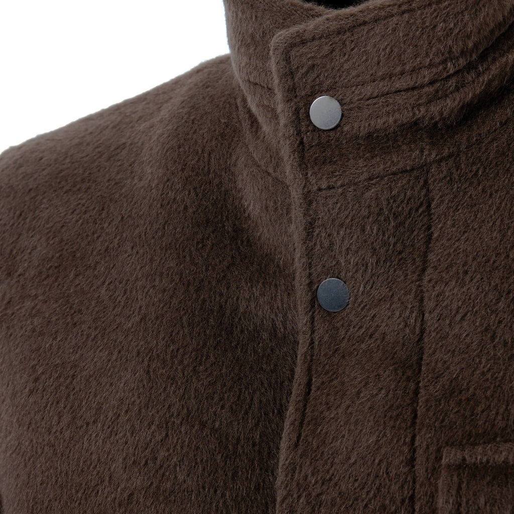 FG Roma jacket in soft 100% wool, crafted in a deep chocolate-brown tone and finished with a stand collar, snap buttons and practical front pockets. Warm and easy to layer, it reflects the brand’s Italian craftsmanship and a clean, understated style. A versatile everyday piece from the 2010s.