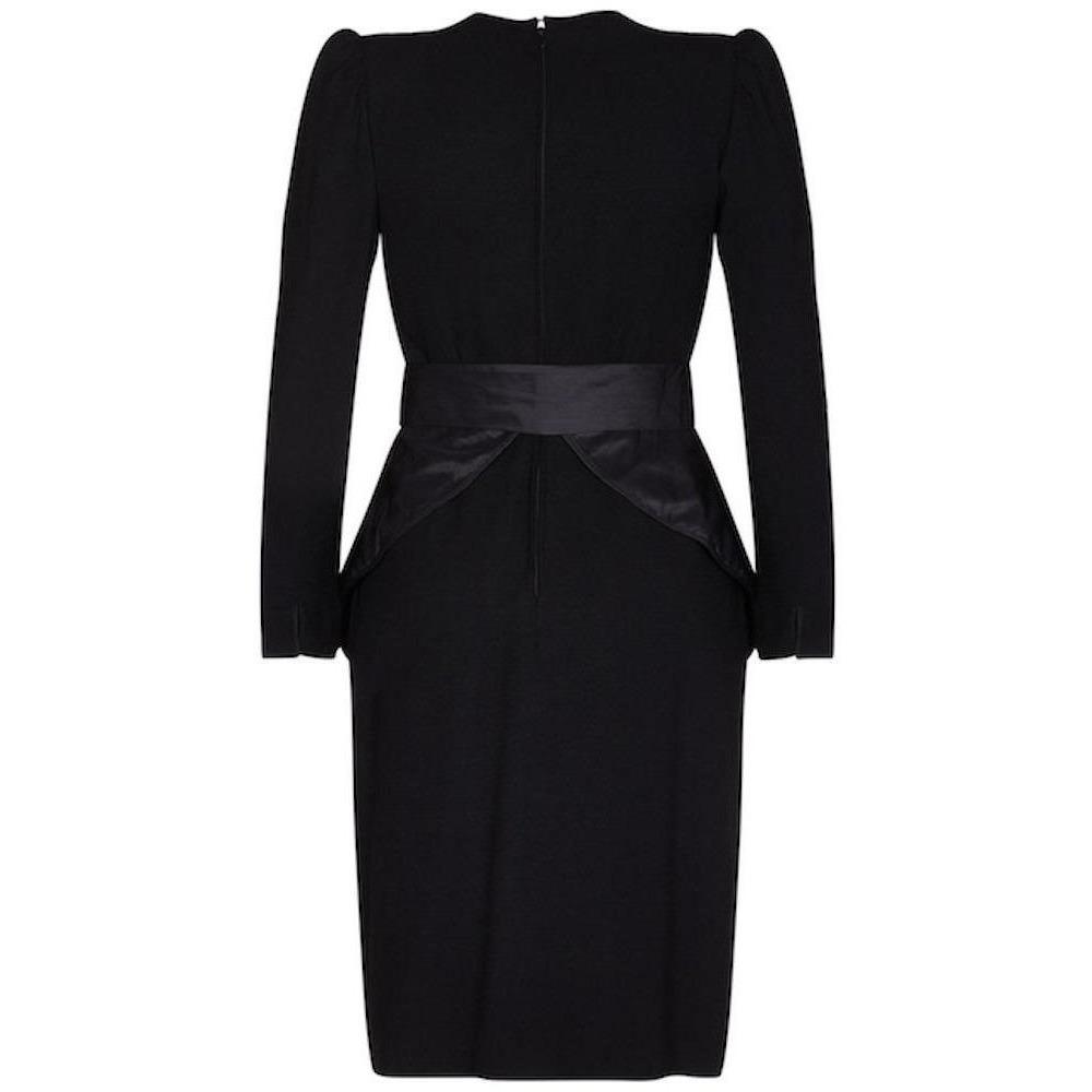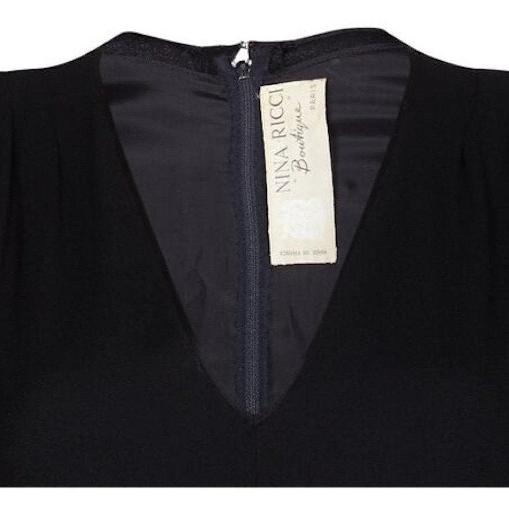 This dramatic Nina Ricci 1980s cocktail dress is silk lined with a black wool crepe overlay and a silk taffetta peplum. The peplum unfolds in soft pleats and graduates in a descending V-shape from the centre reverse at the waist and finishing at the centre front of the skirt at the hem. Pleats are stitched down towards the waistband to flatter the navel, before falling open at the front to reveal the crepe pencil-style underskirt. This showpiece is consolidated perfectly by a large taffeta bow that embellishes the accompanying sash to be worn around the waist. A sharply plunging V neckline on the bodice echoes the form of the skirt, and neatly stitched pleats atop of each shoulder accentuate the puff shoulder detail. This piece is beautifully constructed with ribbon finishing on the hems and cuffs, and interior hook and eye fastenings to further shape the waistline. There is a central zip fastening at the reverse. In superb condition, would best fit US size 4 - 6, UK size 8 -10.