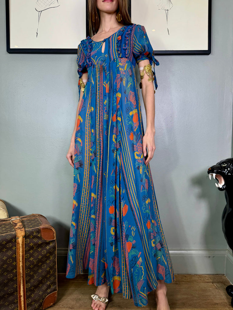Gorgeous Ossie Clark iconic and collectable print silk dress featuring a signature Celia Birtwell print. The dress has a round neckline with a small button, a small frill around the bust and an empire line fit that ties on the back. The skirt is loose and floaty. Has short sleeves with a keyhole shoulder design and long arm ties.