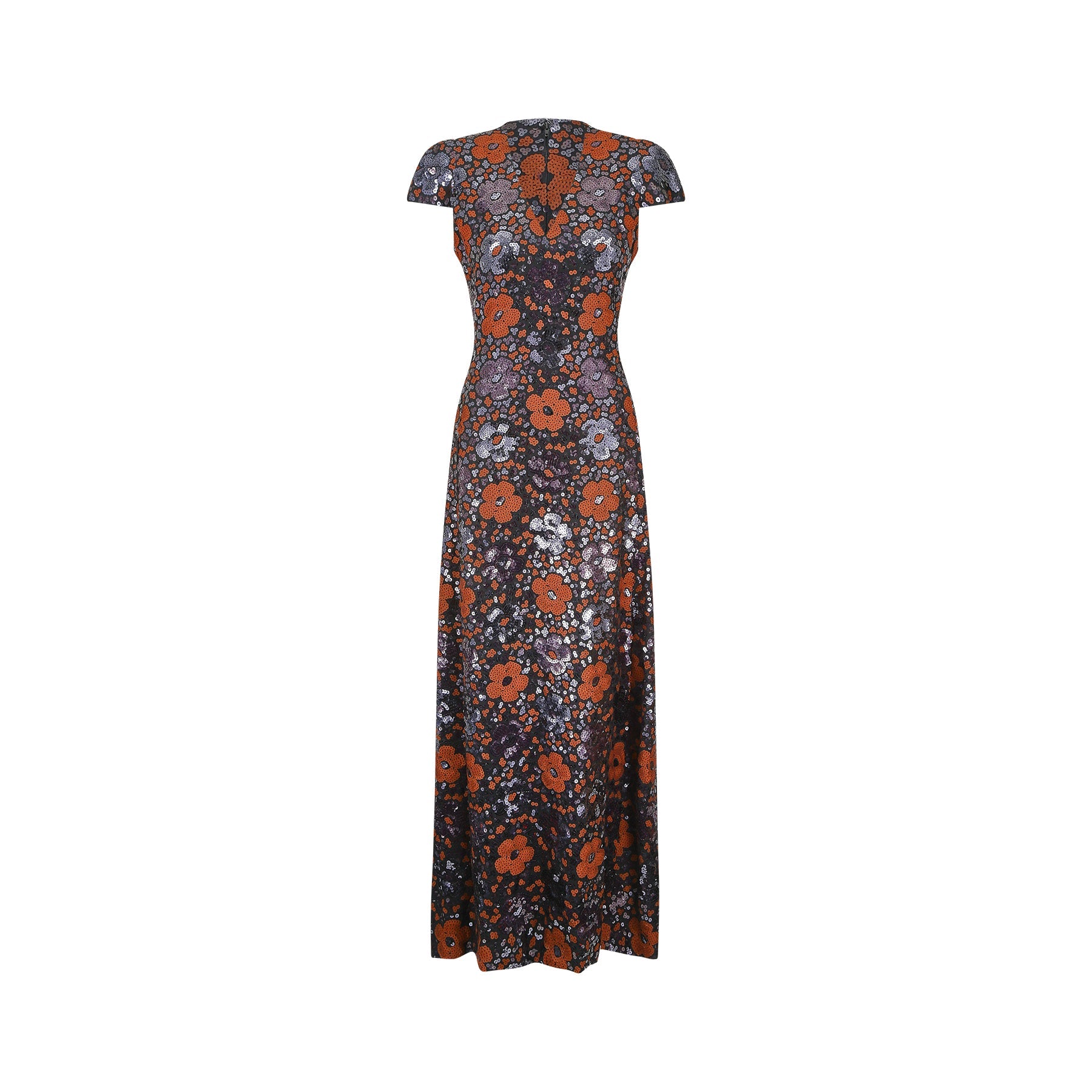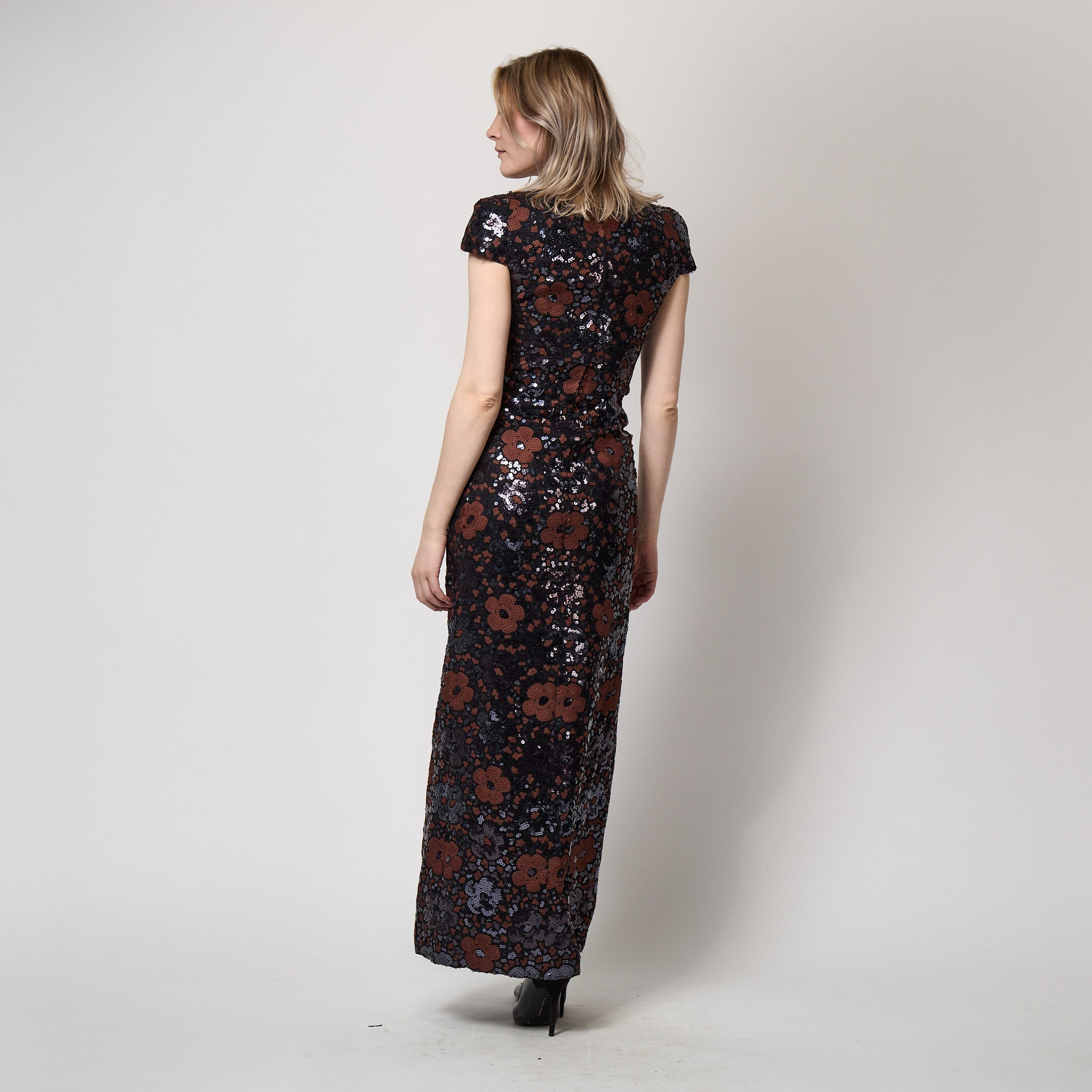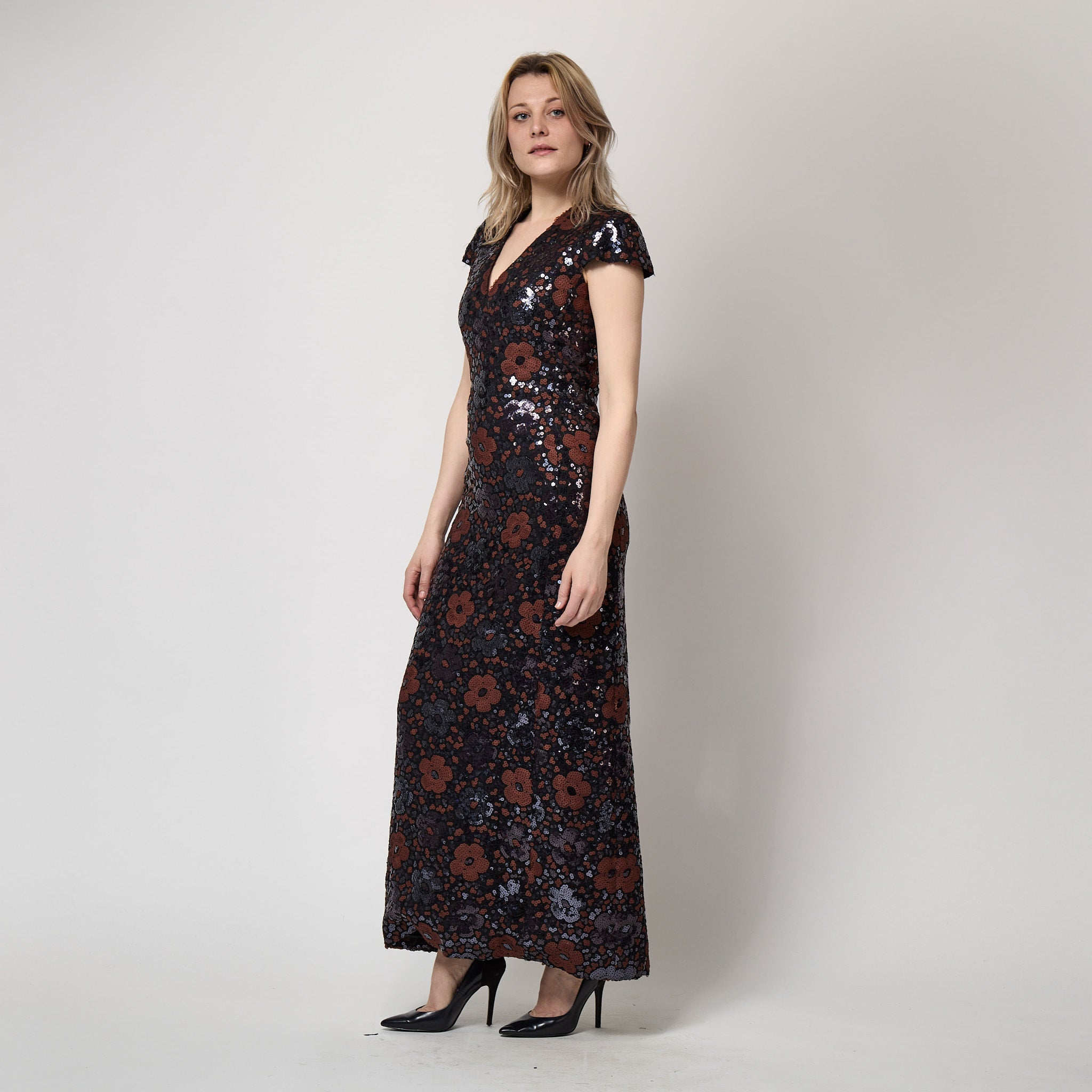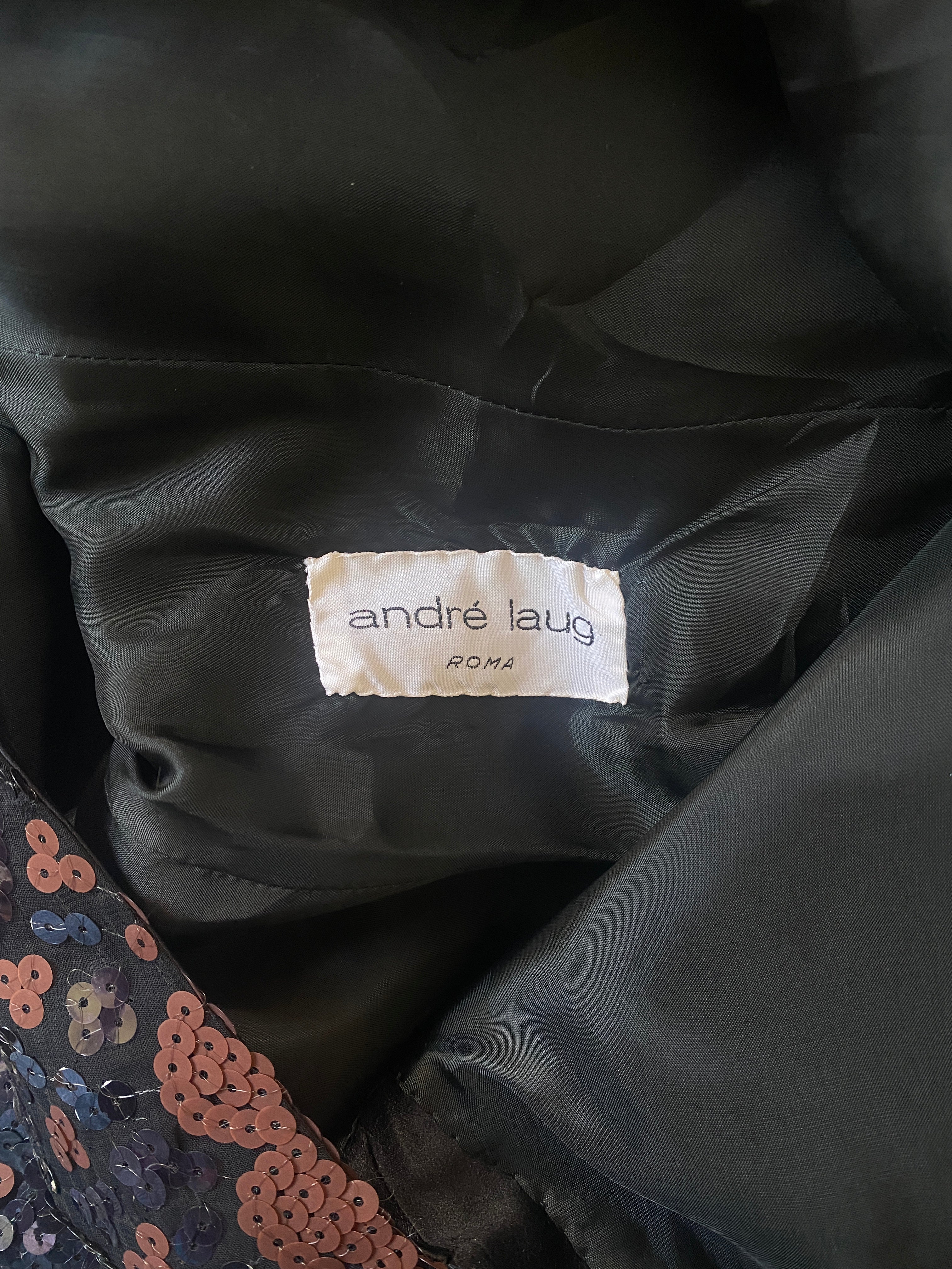 A very elegant 1980s sequin dress from Italian couturier Andre Laug from his haute couture / alta moda line. The dress has beautiful cap sleeves, a V neckline and is a Princess seamed full length sheath design. Embellished all over in a floral sequin pattern with a rather interesting satin bronze tone. This unusual mat colour contrasts the subtle shimmer of the black and purple sequins and the overall look is very pleasing and understated. It has shoulder pads and is beautifully lined. Fastens to the rear with the original zip. This was most likely a runway piece and was purchased with a number of archive pieces. This will fit a size UK 10 or US 6 best and it's in fabulous vintage condition with no issues of any note. Our model is a UK 8-10 US 4-6 and 5'9" and this dress was a great fit on her.