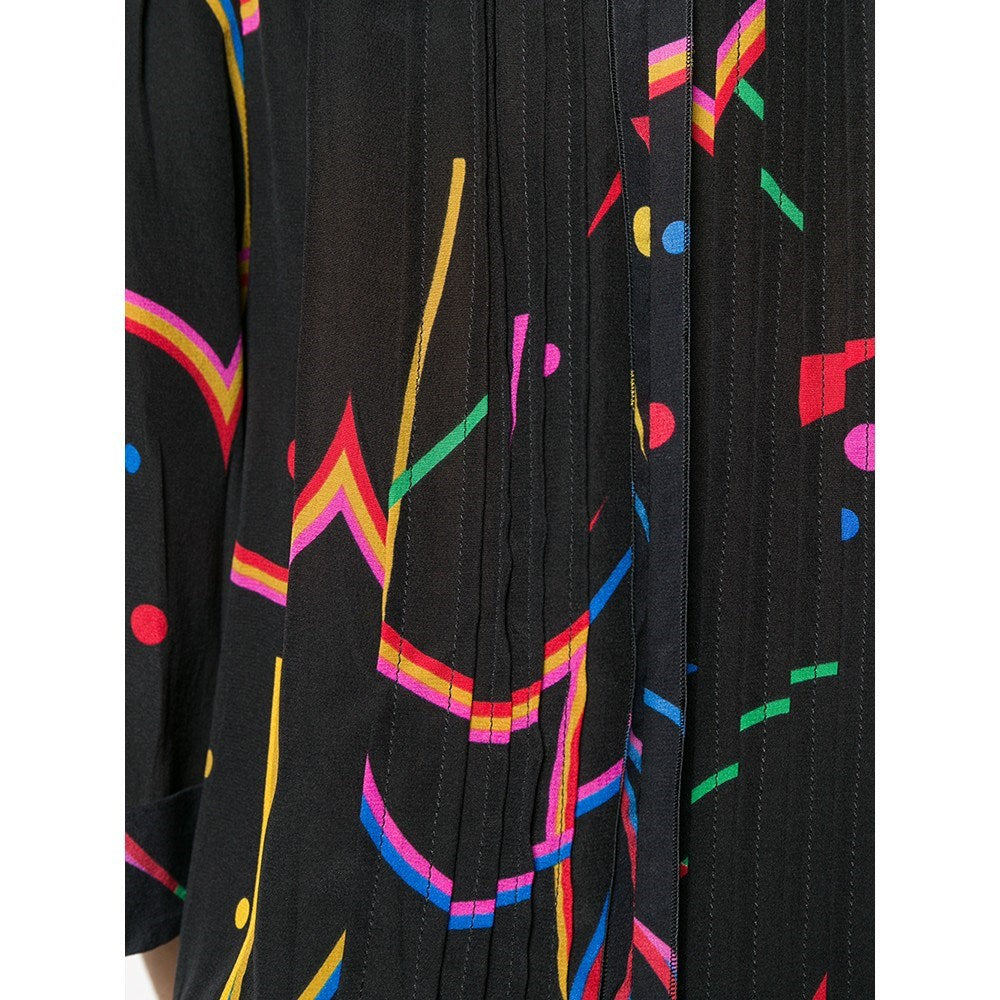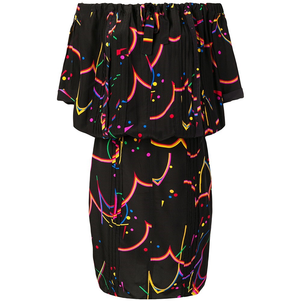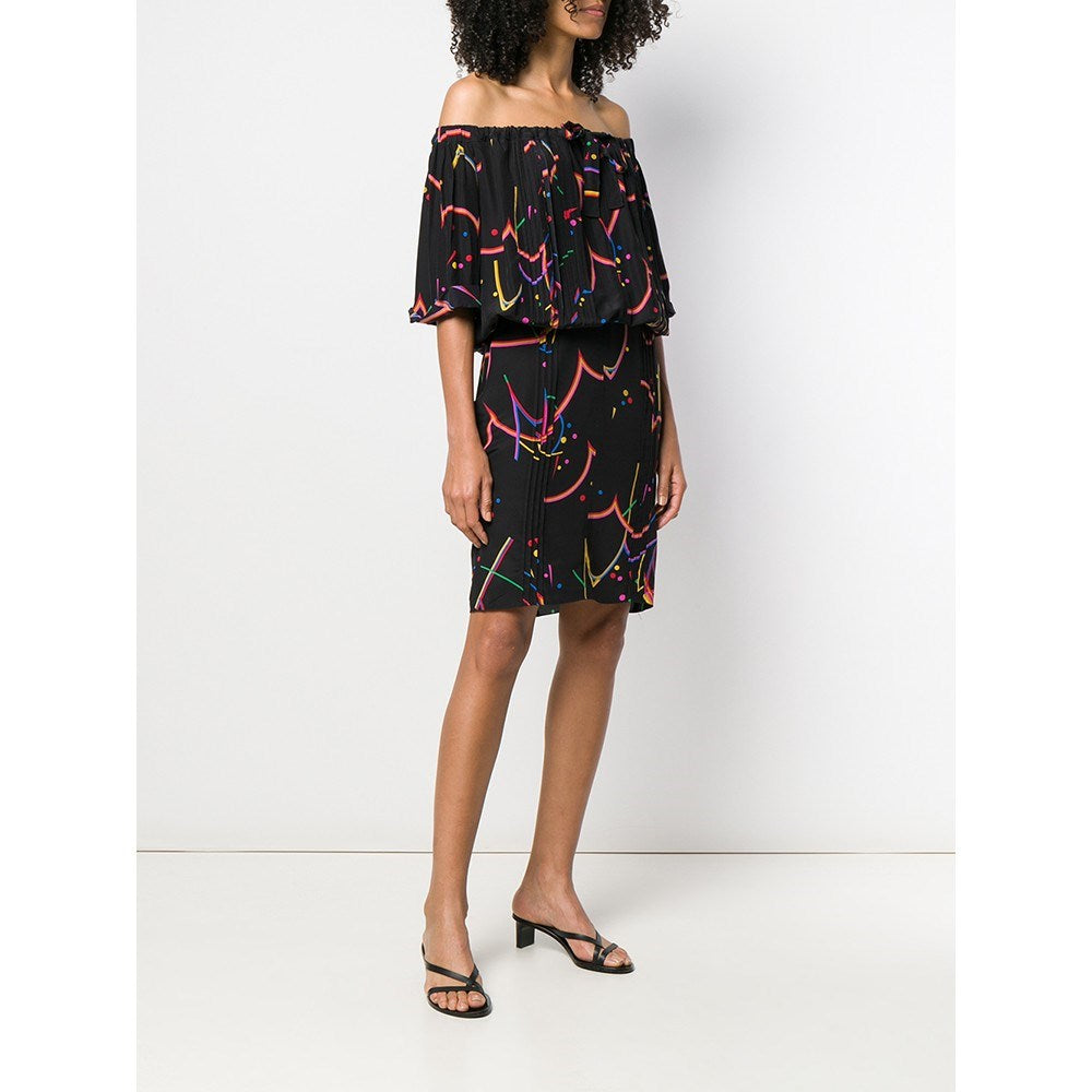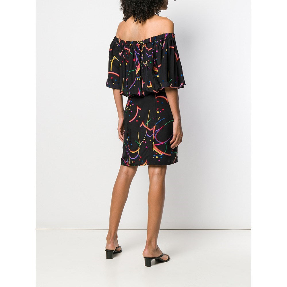 Prada black short dress with yellow, fuchsia, green, blue and red abstract print. Bare shoulders and short sleeves. Pleated design, gathered waist. Side closure with zip, hook and buttons.