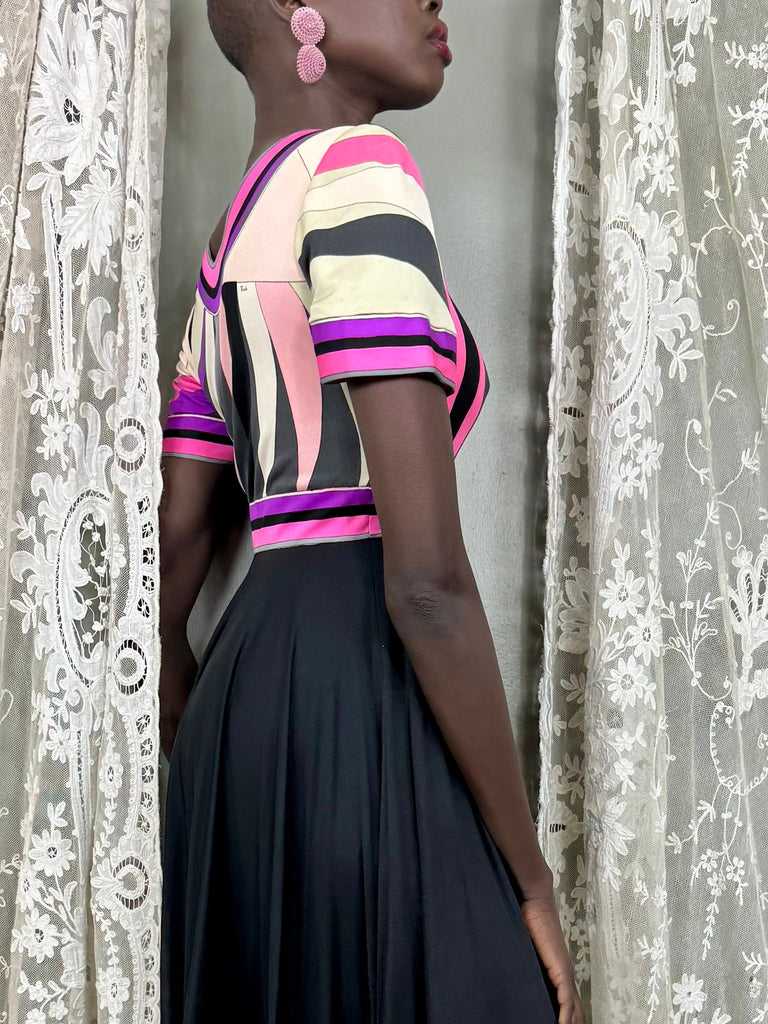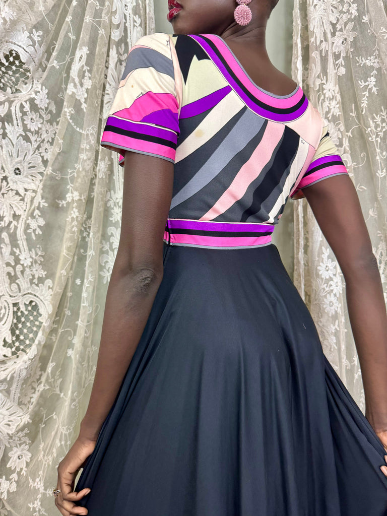 This iconic Pucci 70s dress boasts a fluid 360 degree wide skirt and a round neckline with a stunning signed print top. Made from luxurious silk, it features short sleeves and a back zip for added elegance. Make a statement at any event with this iconic and timeless piece.