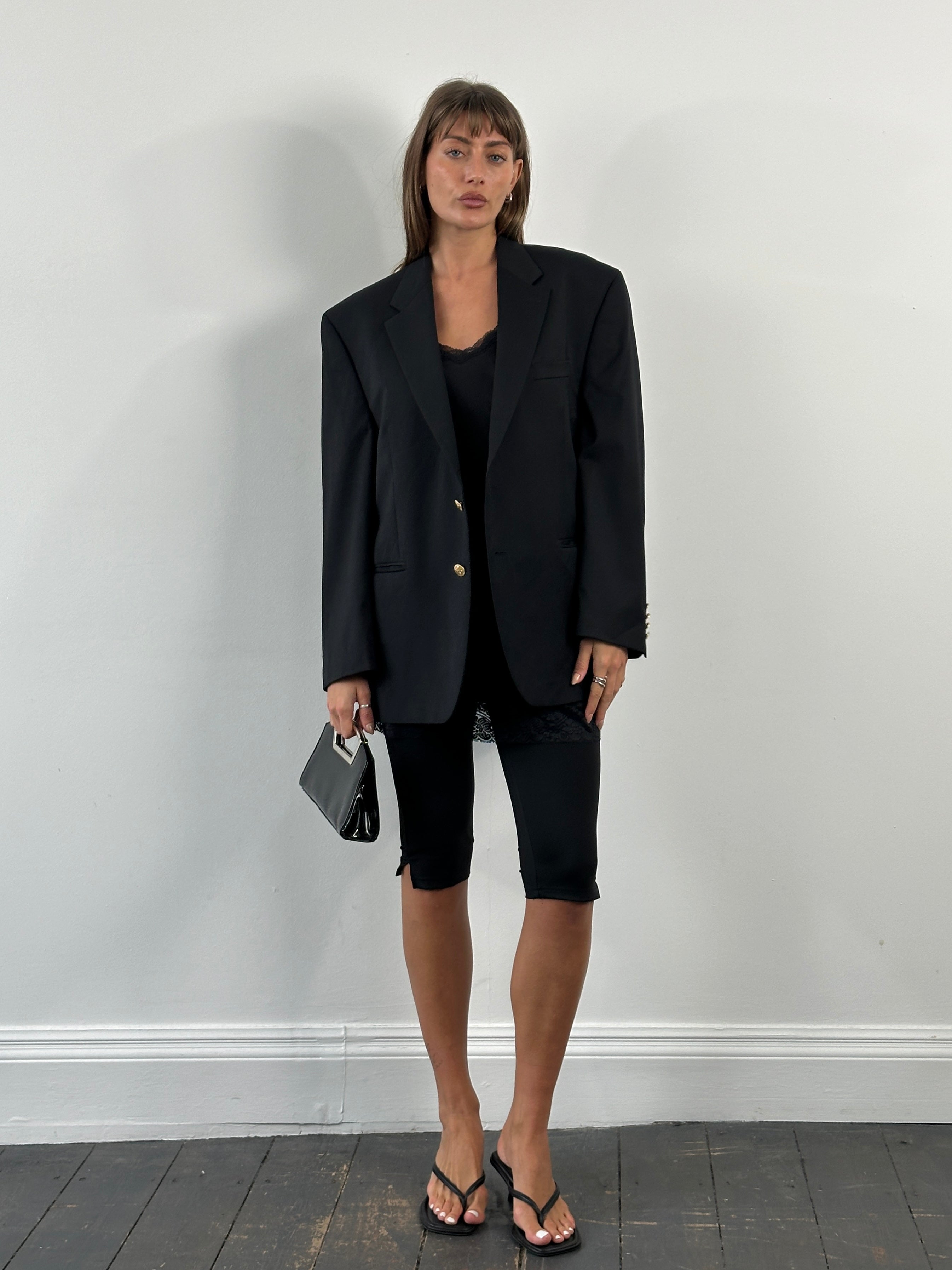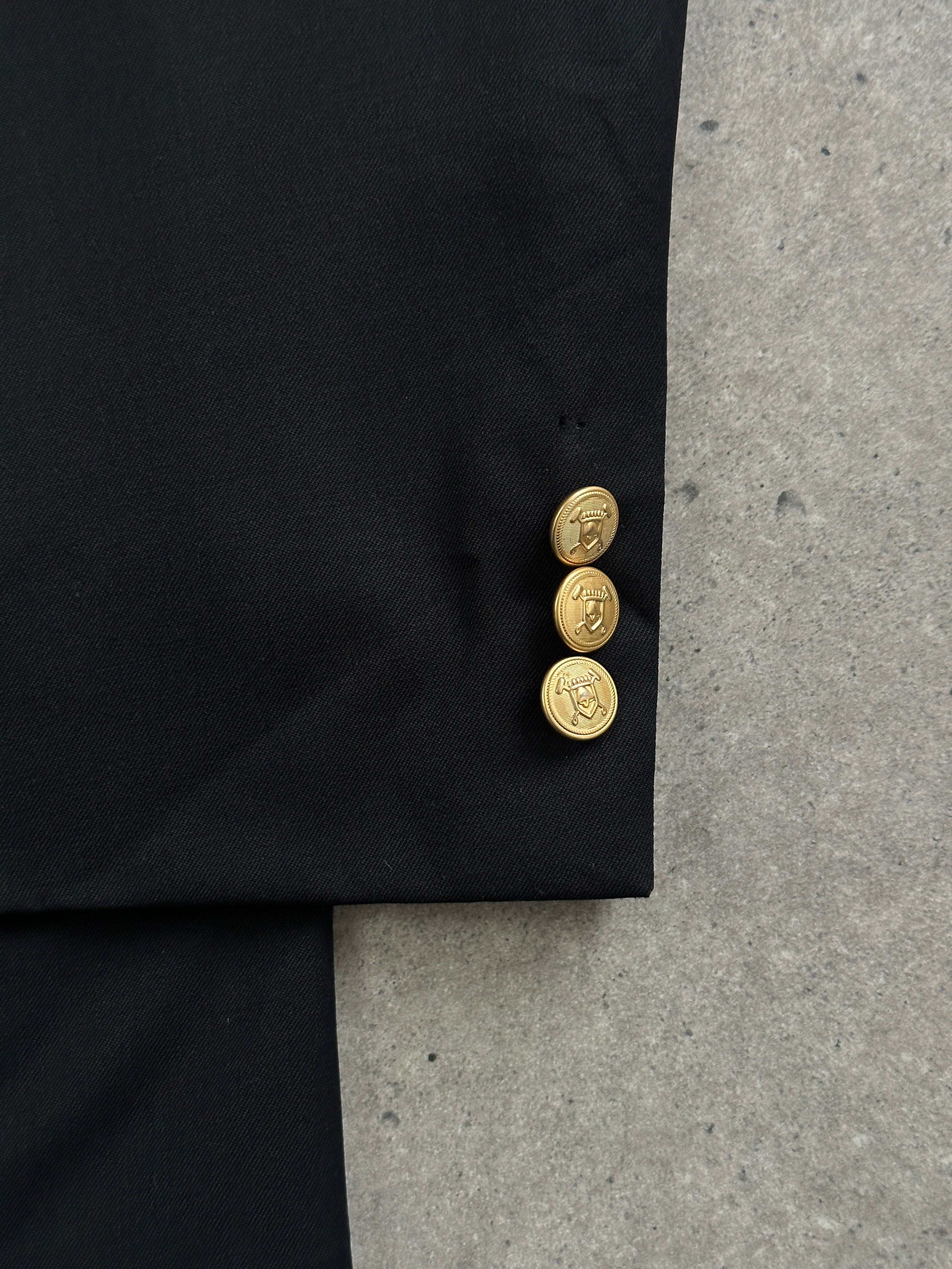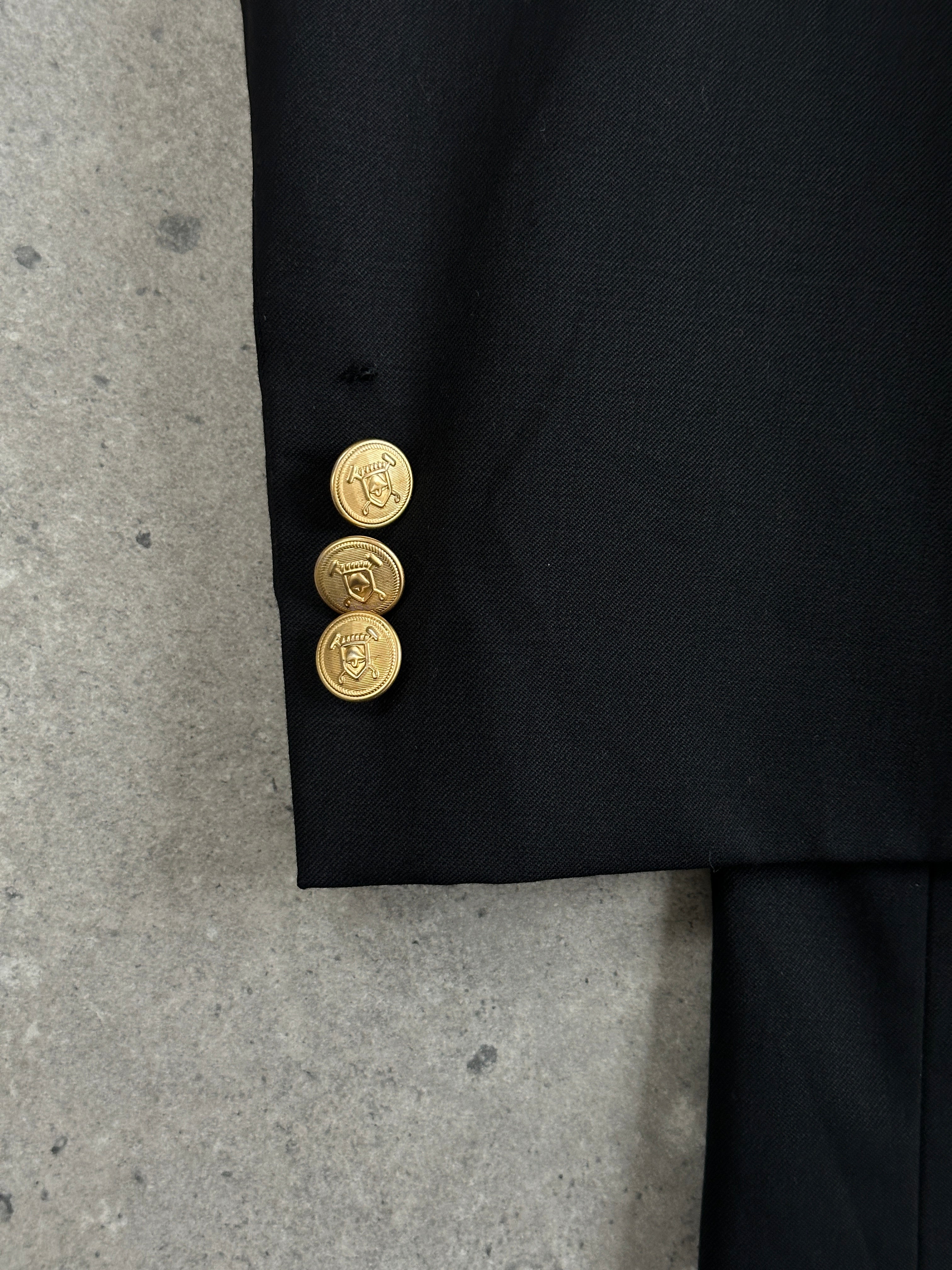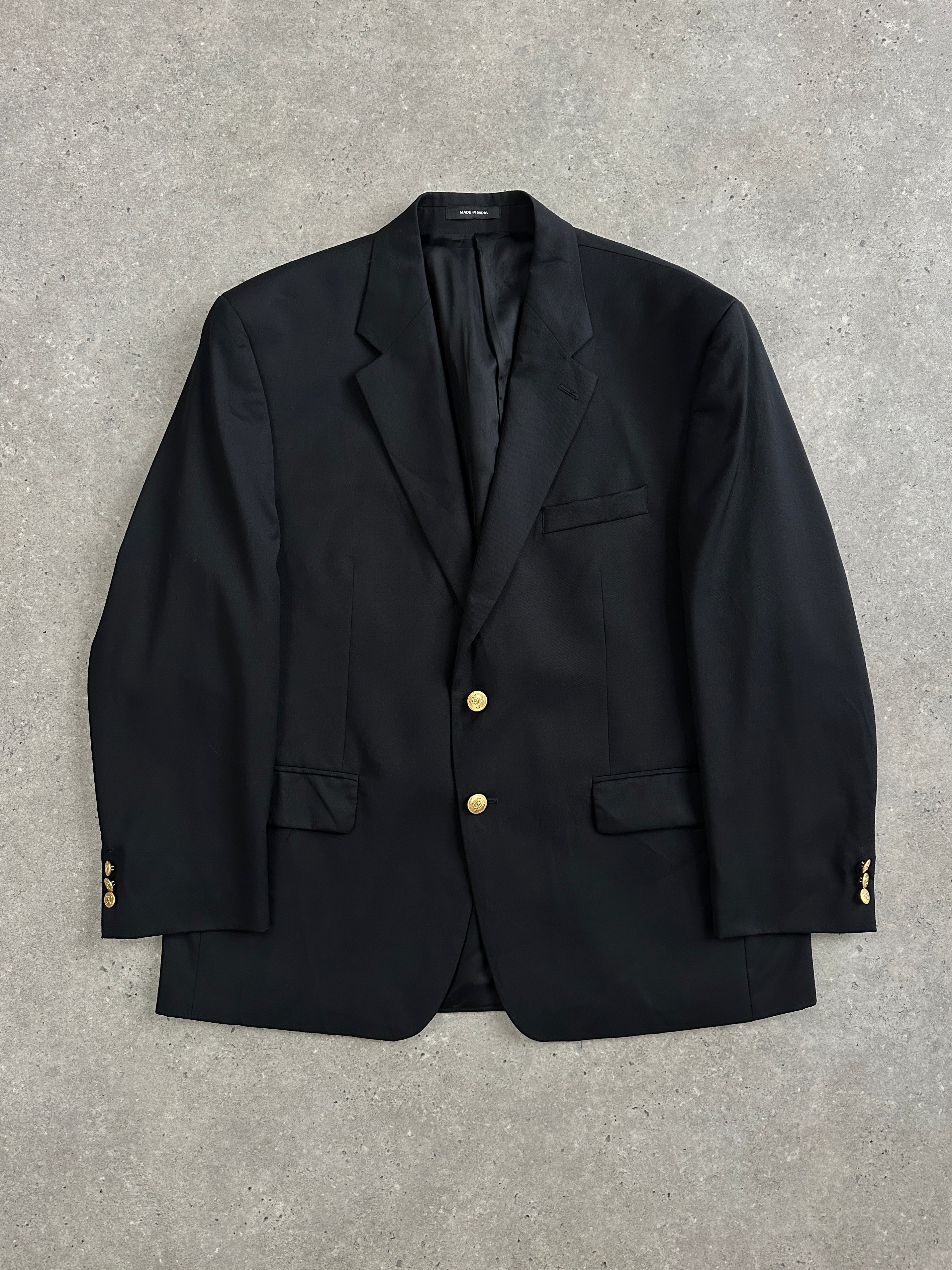 A vintage 2000s Lauren Ralph Lauren single breasted blazer in a classic black tone. A clean tailored silhouette elevated by gold crest buttons for a timeless, quietly polished finish.