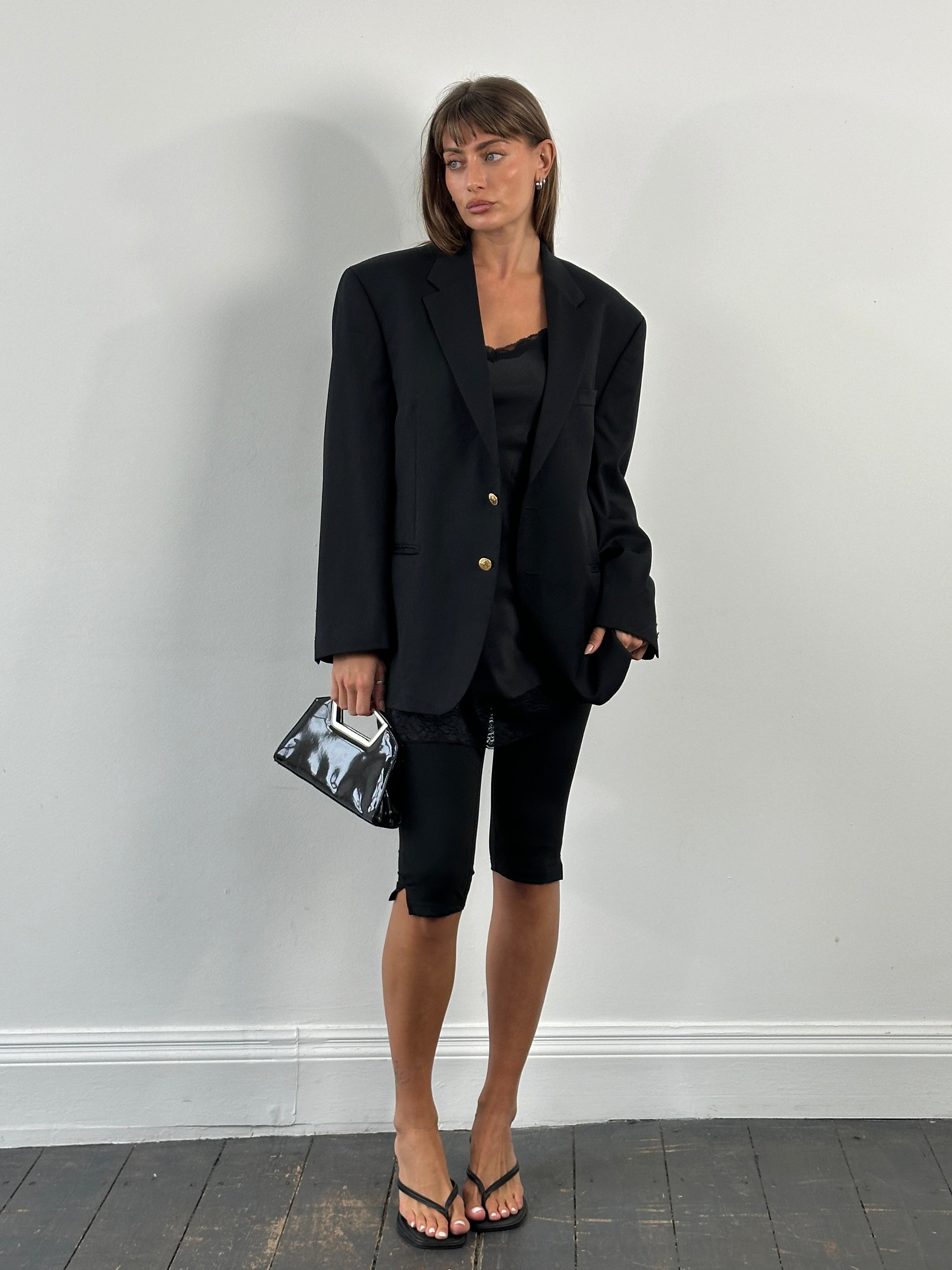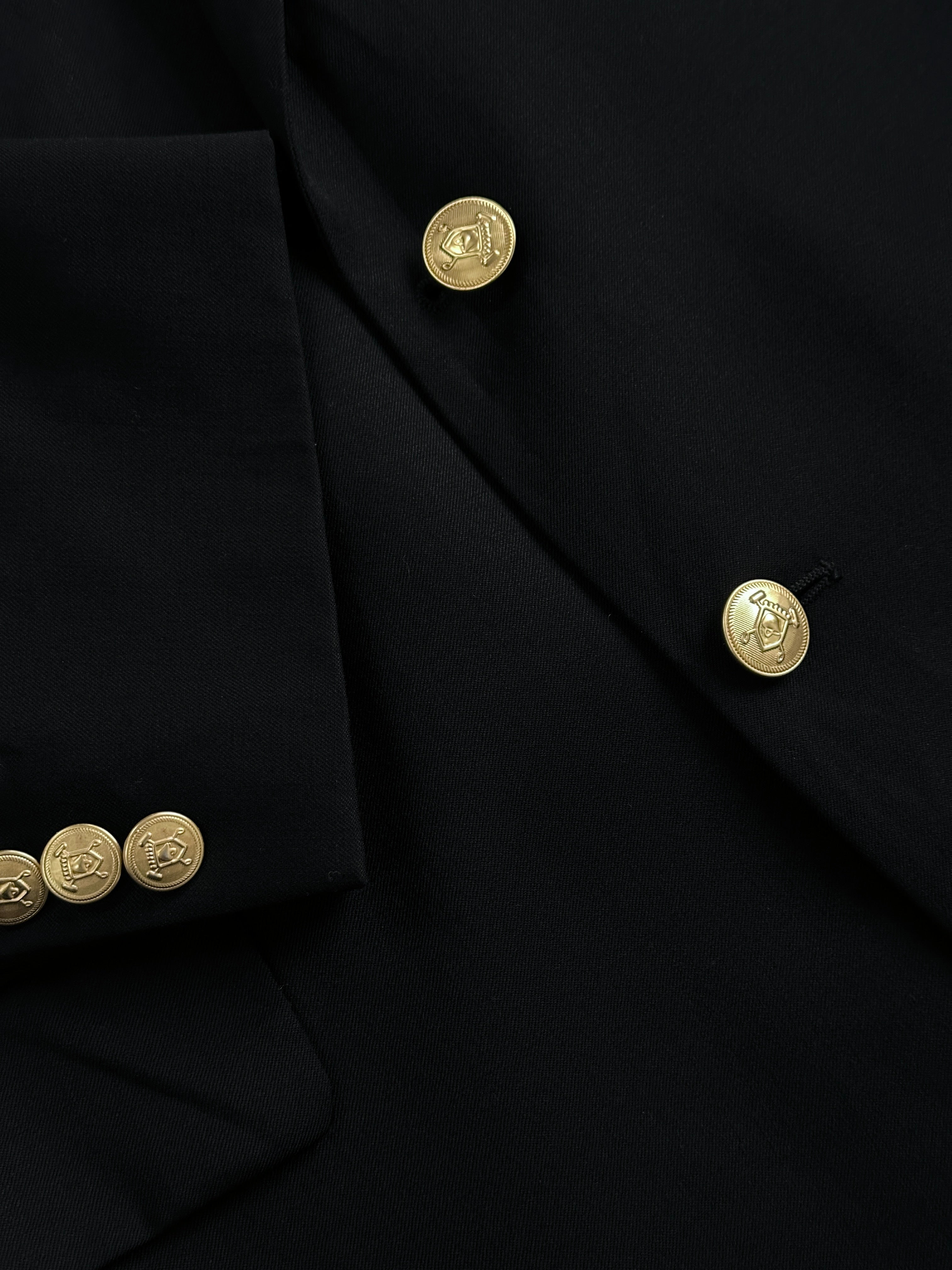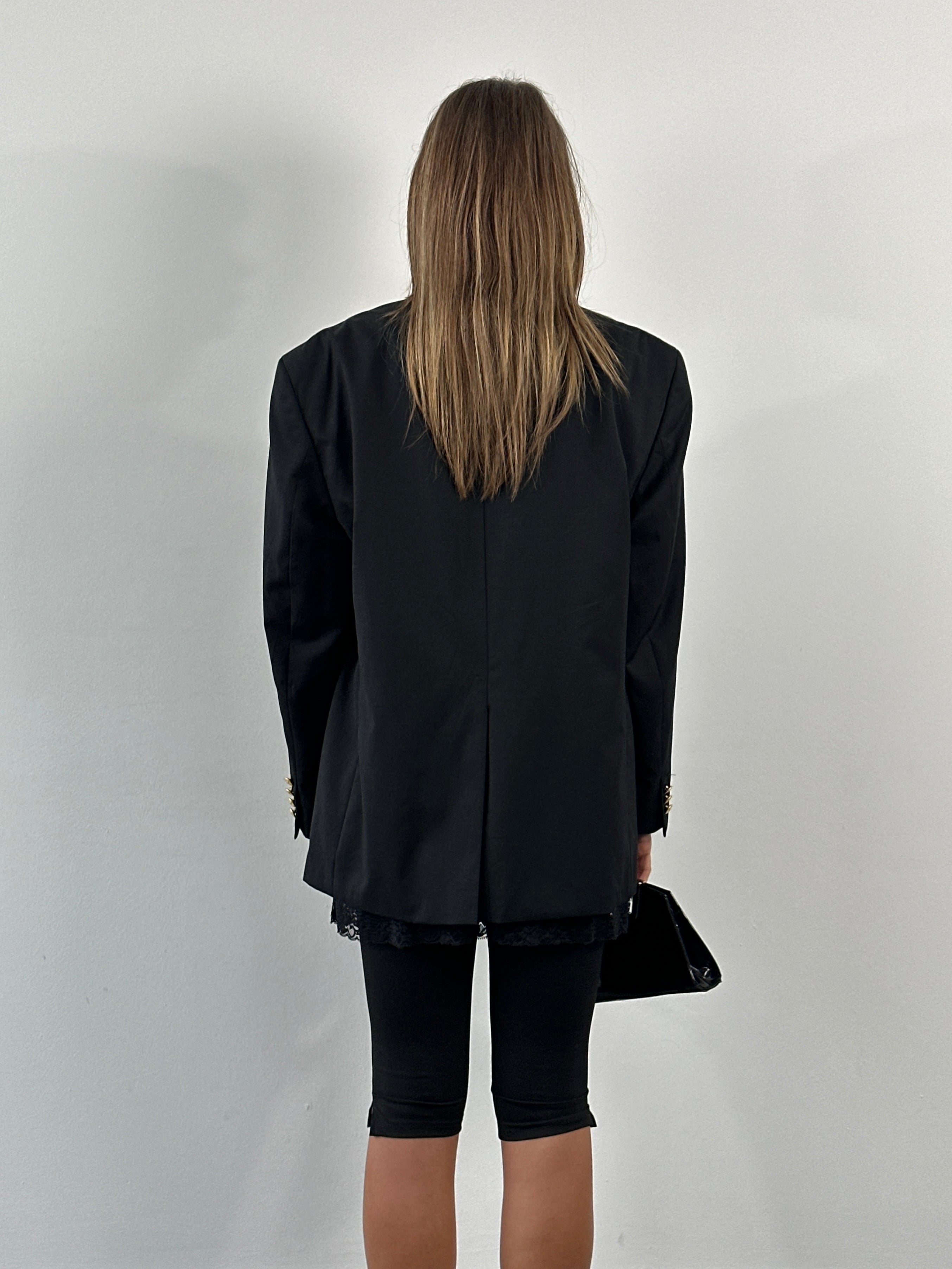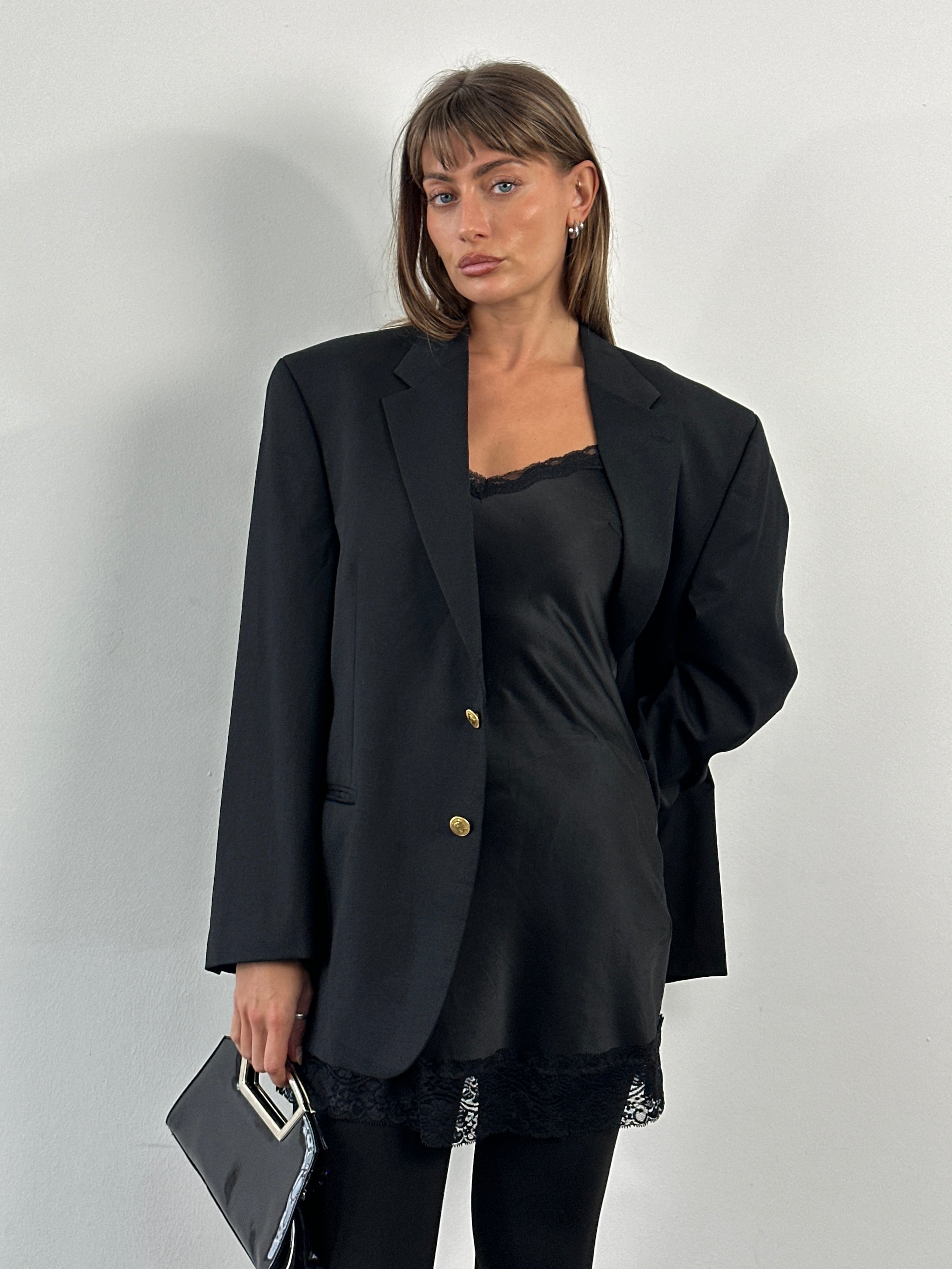A vintage 2000s Lauren Ralph Lauren single breasted blazer in a classic black tone. A clean tailored silhouette elevated by gold crest buttons for a timeless, quietly polished finish.