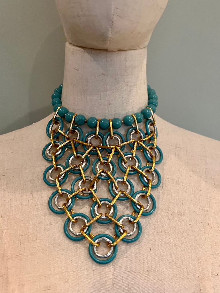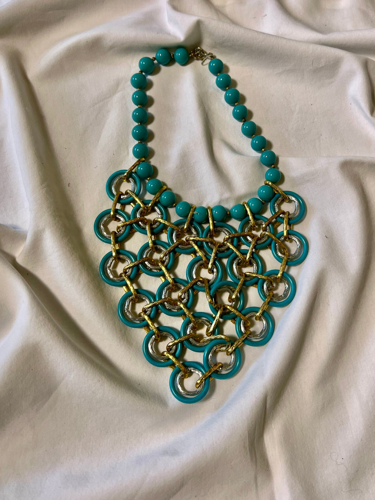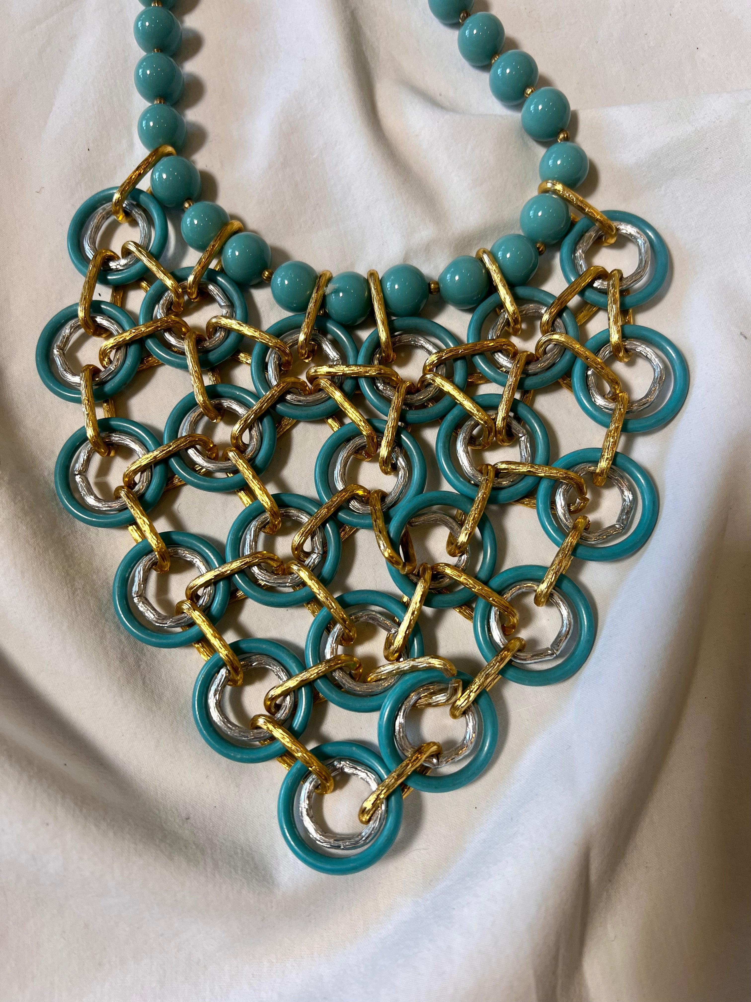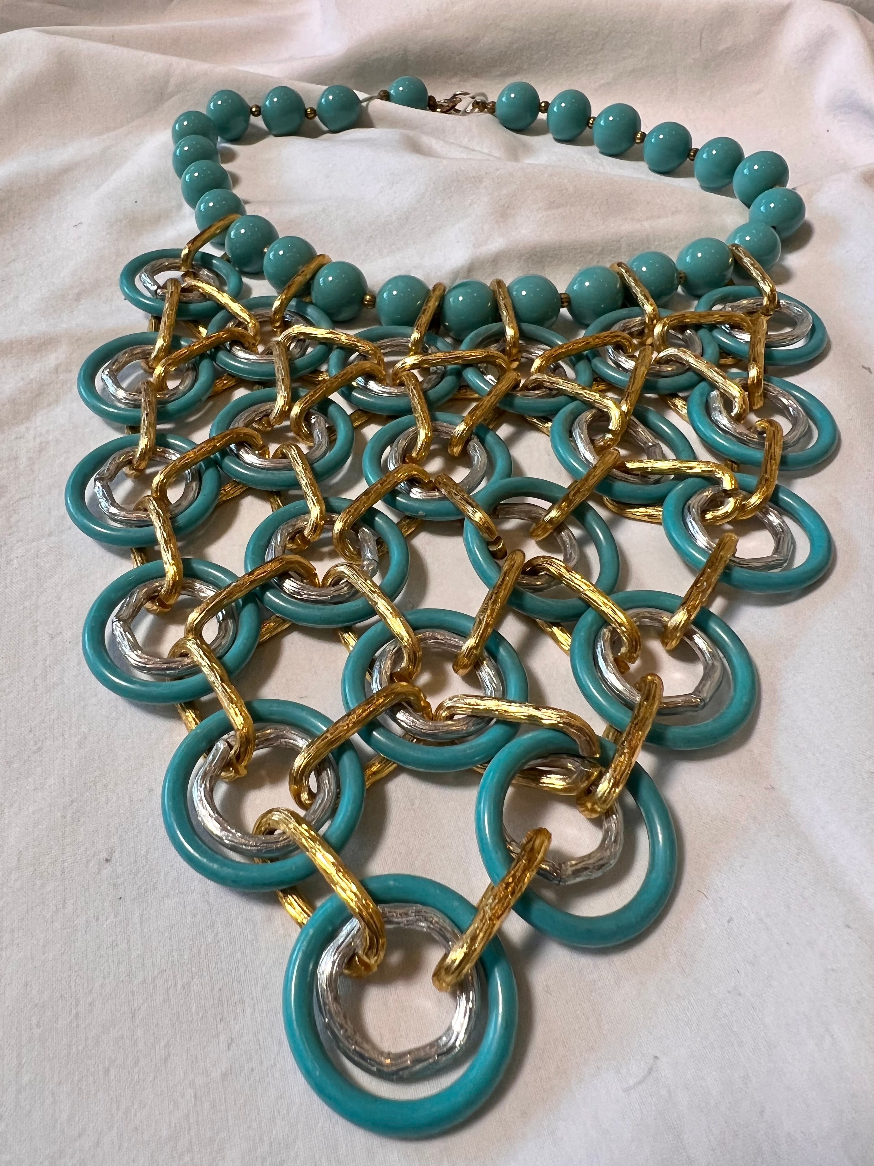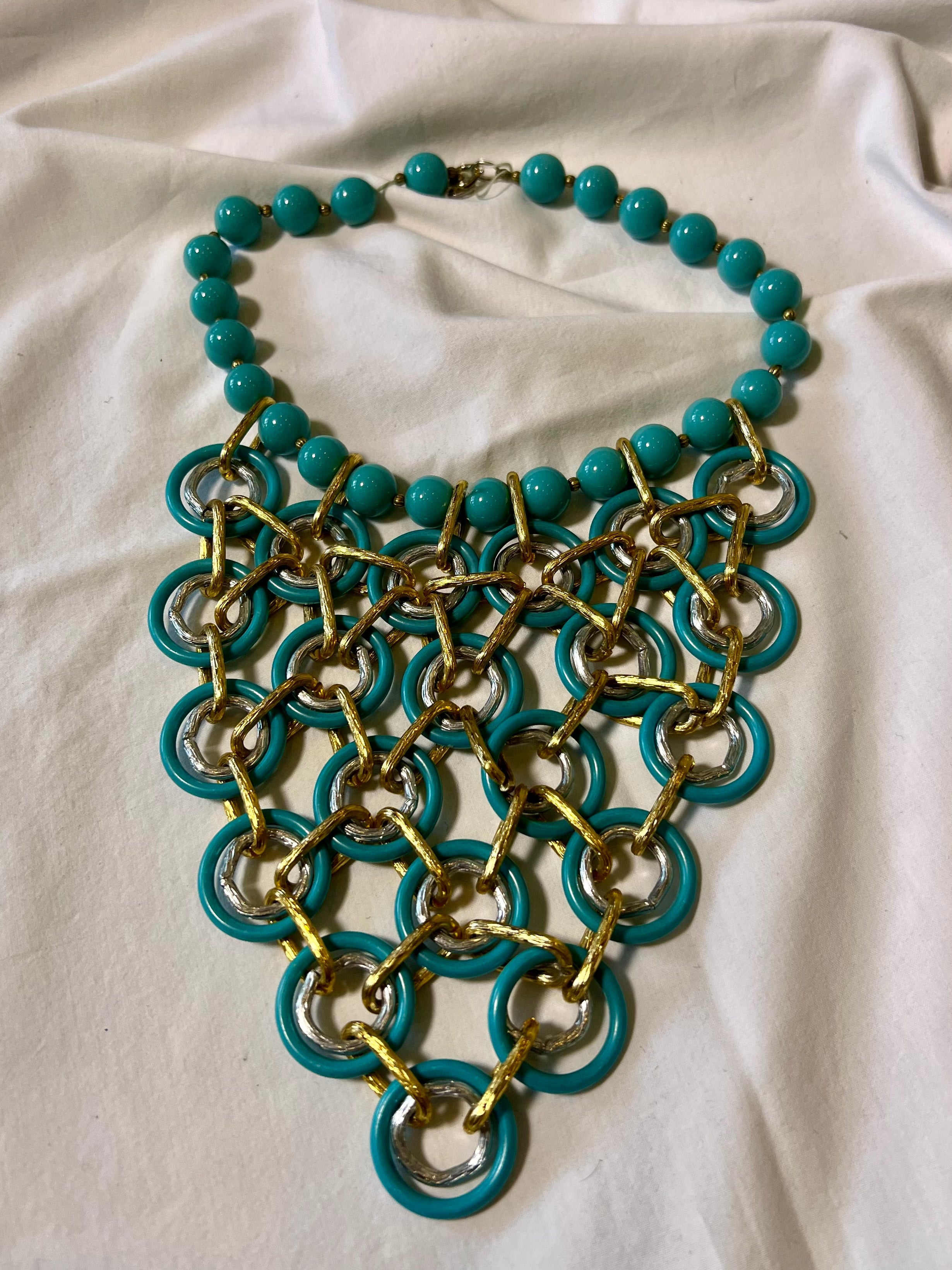 Gorgeous and vibrant 60s link turquoise beaded necklace. Has a single beaded row necklace that sits high on the neckline with a chain triangle drop. Has gold and silver links with circular chains. A classic 60s statement necklace in very good condition.