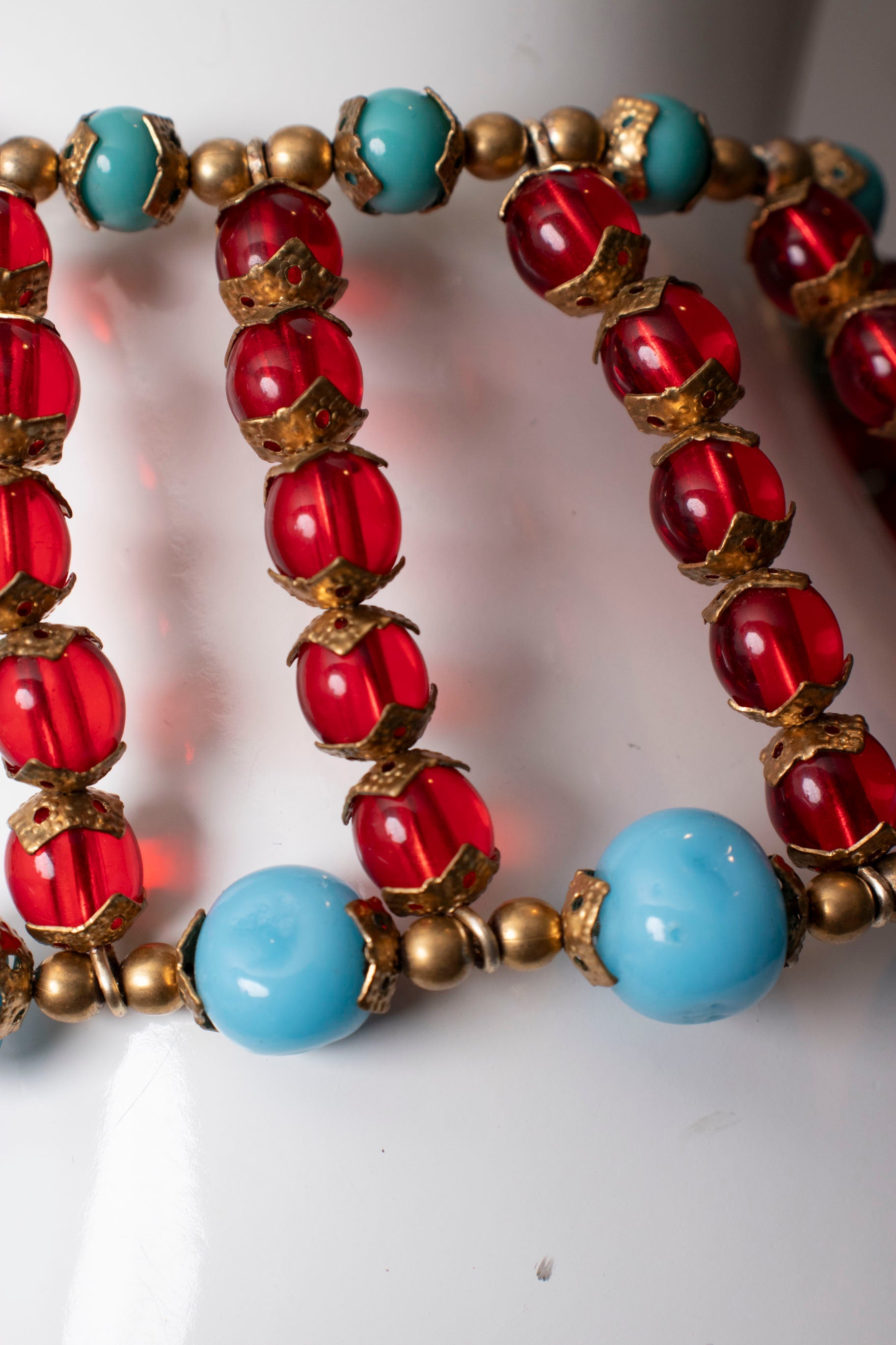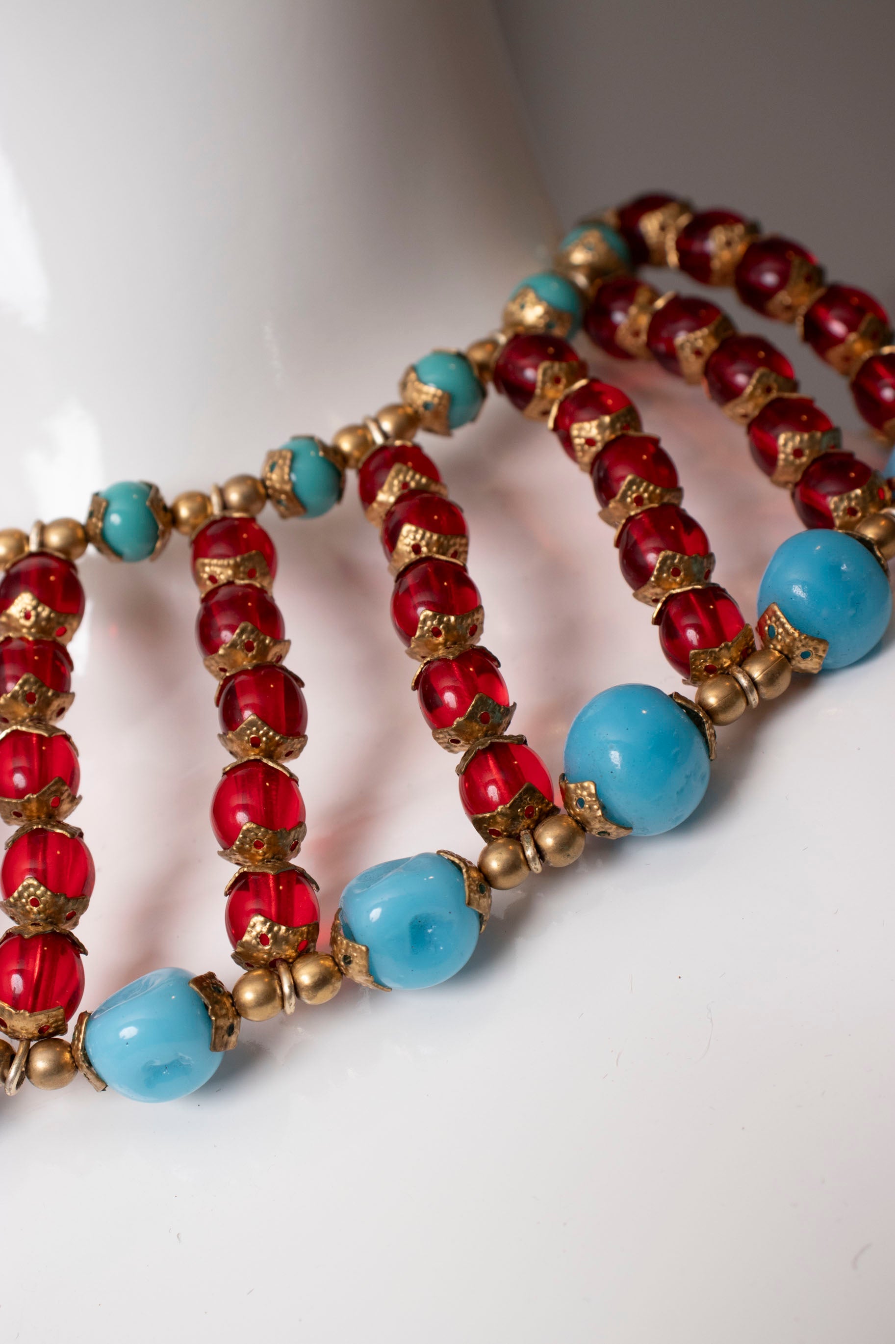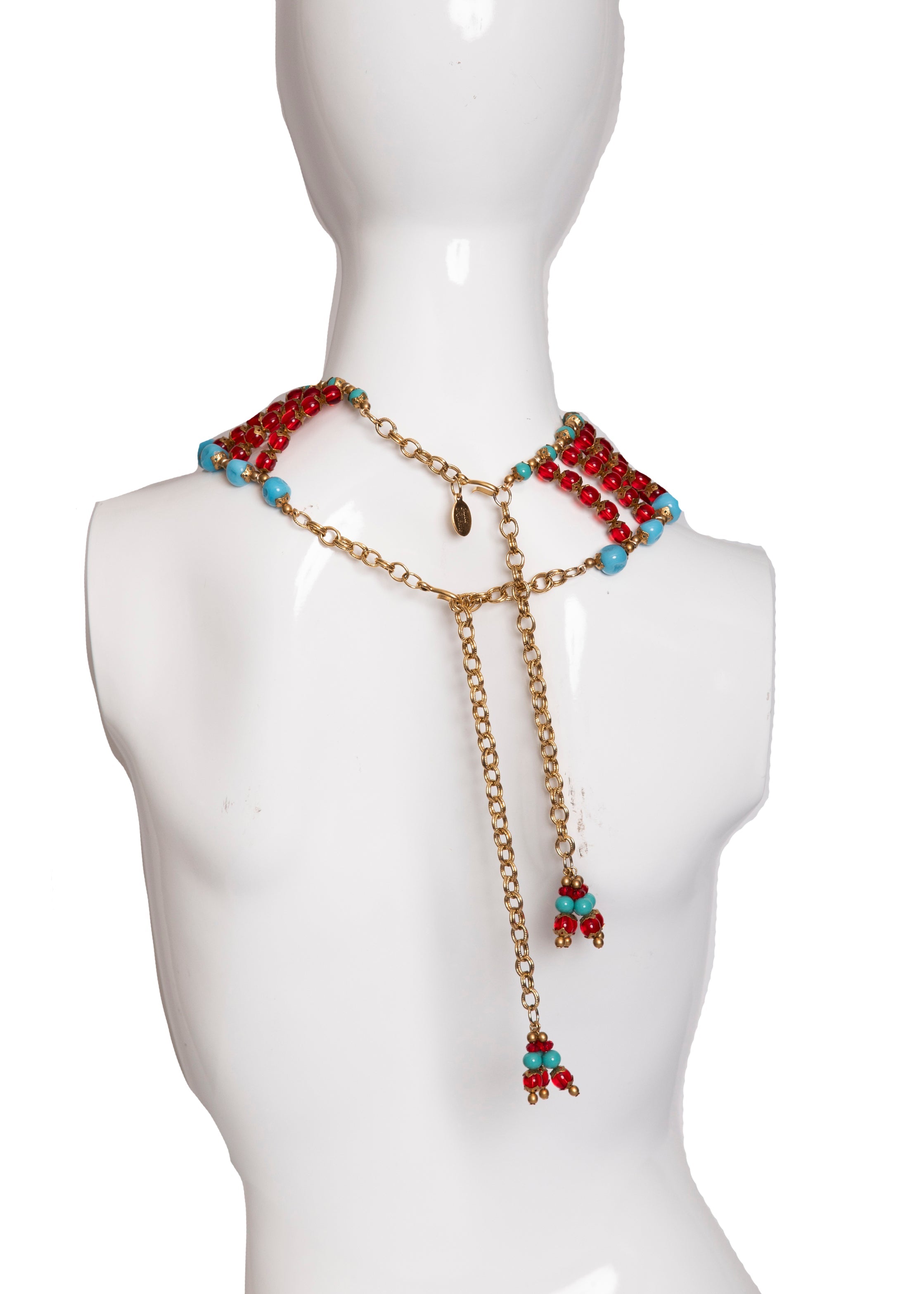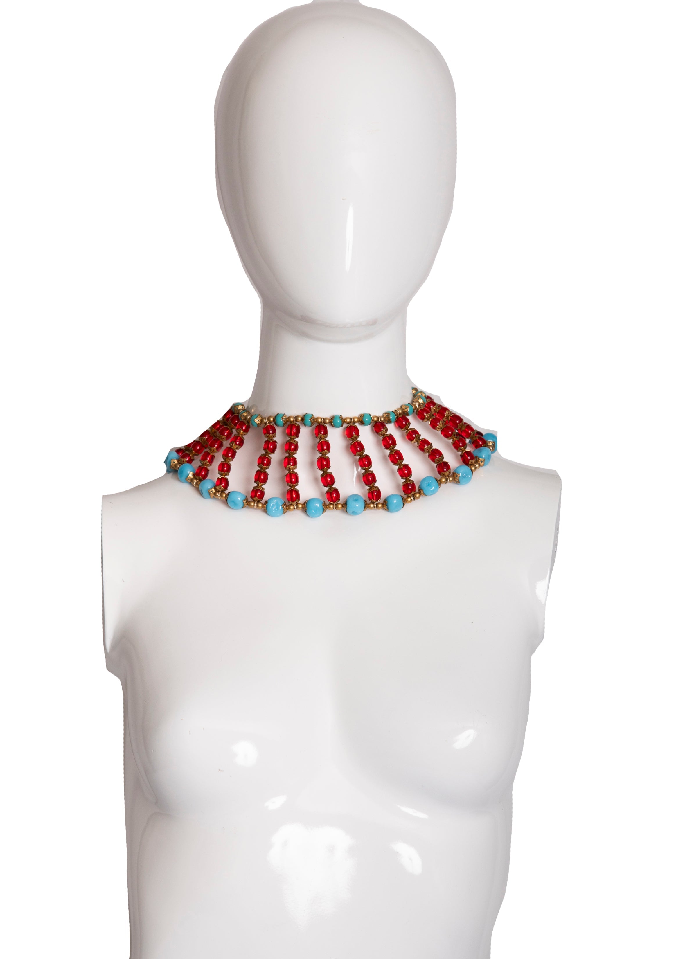 This red carpet worthy necklace is an artfully recreated Miriam Haskell Egyptian Revival Collar Necklace. Handcrafted from red and blue vintage beads and gold tone vintage hardware, this exquisite piece is strung on a sturdy yet pliable wire that is moldable, comfortable and can be worn high around the neck or a bit lower at the collar. The sexy back design is our favorite part of this necklace.