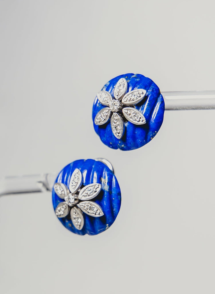 Make a statement with our stunning carved Blue Lapis and Diamond Earrings. These beauties shimmer with sparkles of diamond in a floral pattern set in 14K white gold - perfect for any chic outfit. Dazzling yet understated, you'll never lose your cool-factor in this gorgeous pair!