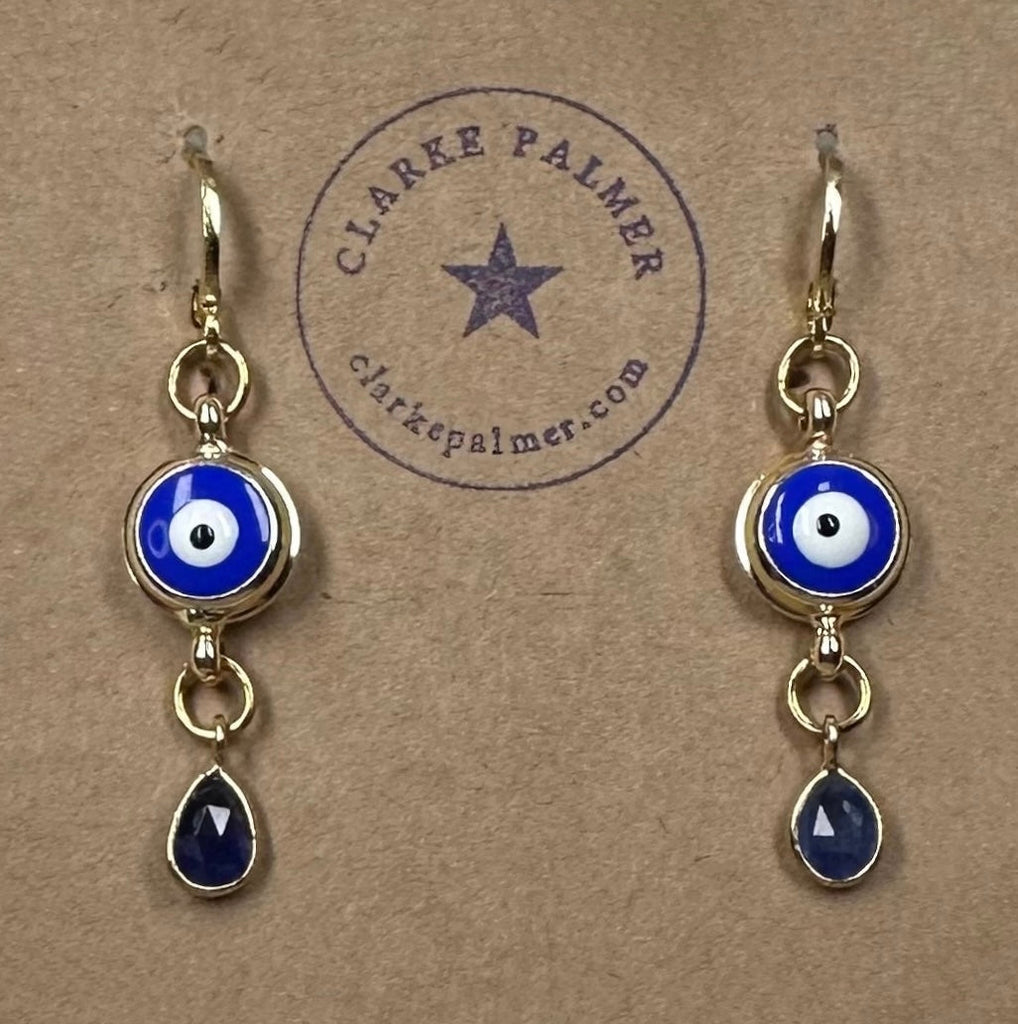 Handmade from real sustainably sourced handcut Burmese sapphire briolettes, enamel blue eye charms set in 22kt gold vermeil they hang from 22kt gold vermeil hinged hoops. They make a unique gift to treat yourself, loved ones or family for a special birthday or anniversary.