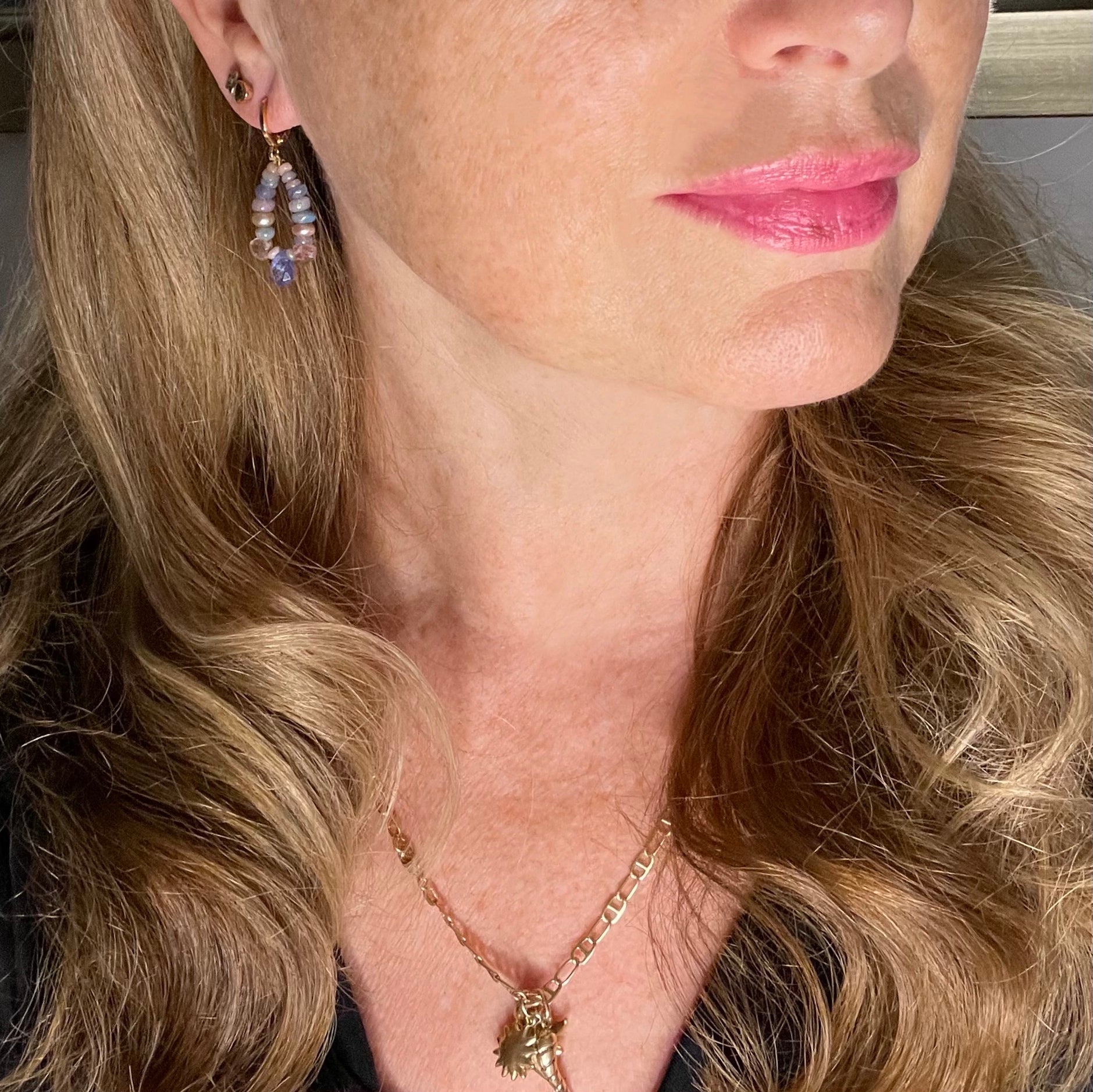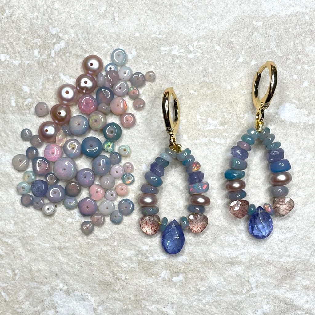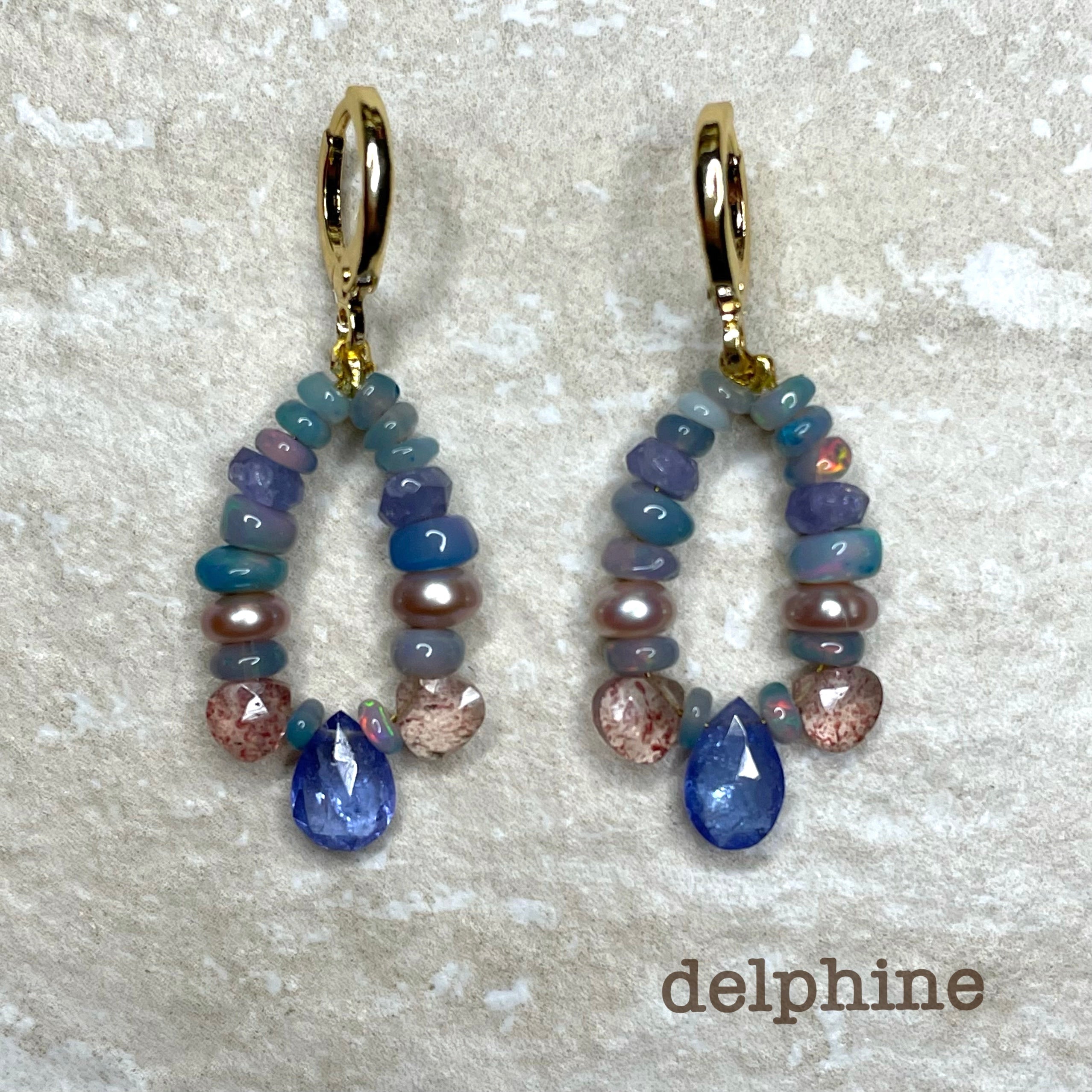 Our 'Delphine' Earrings are handmade from glowing lilacy pink opals, lilac pearl rondelles, strawberry quartz and tanzanite drops. They are inspired by the magical colours of the sea, pink sand and shells in our favourite holiday destinations.