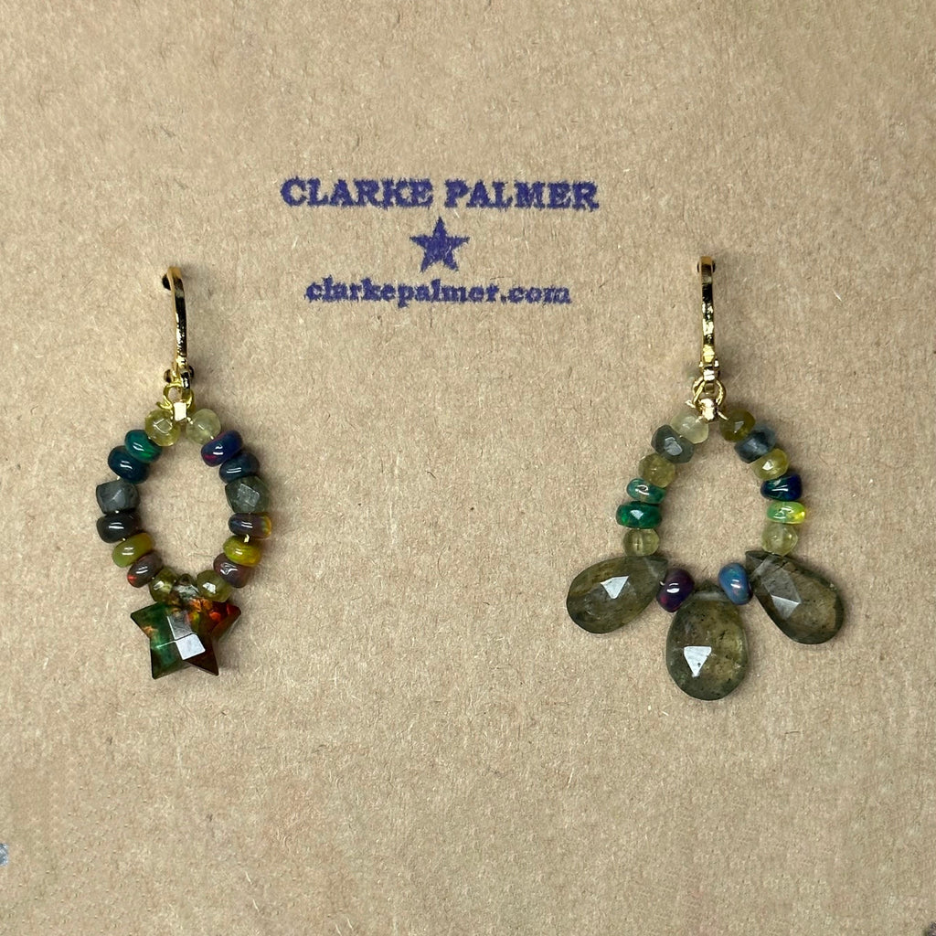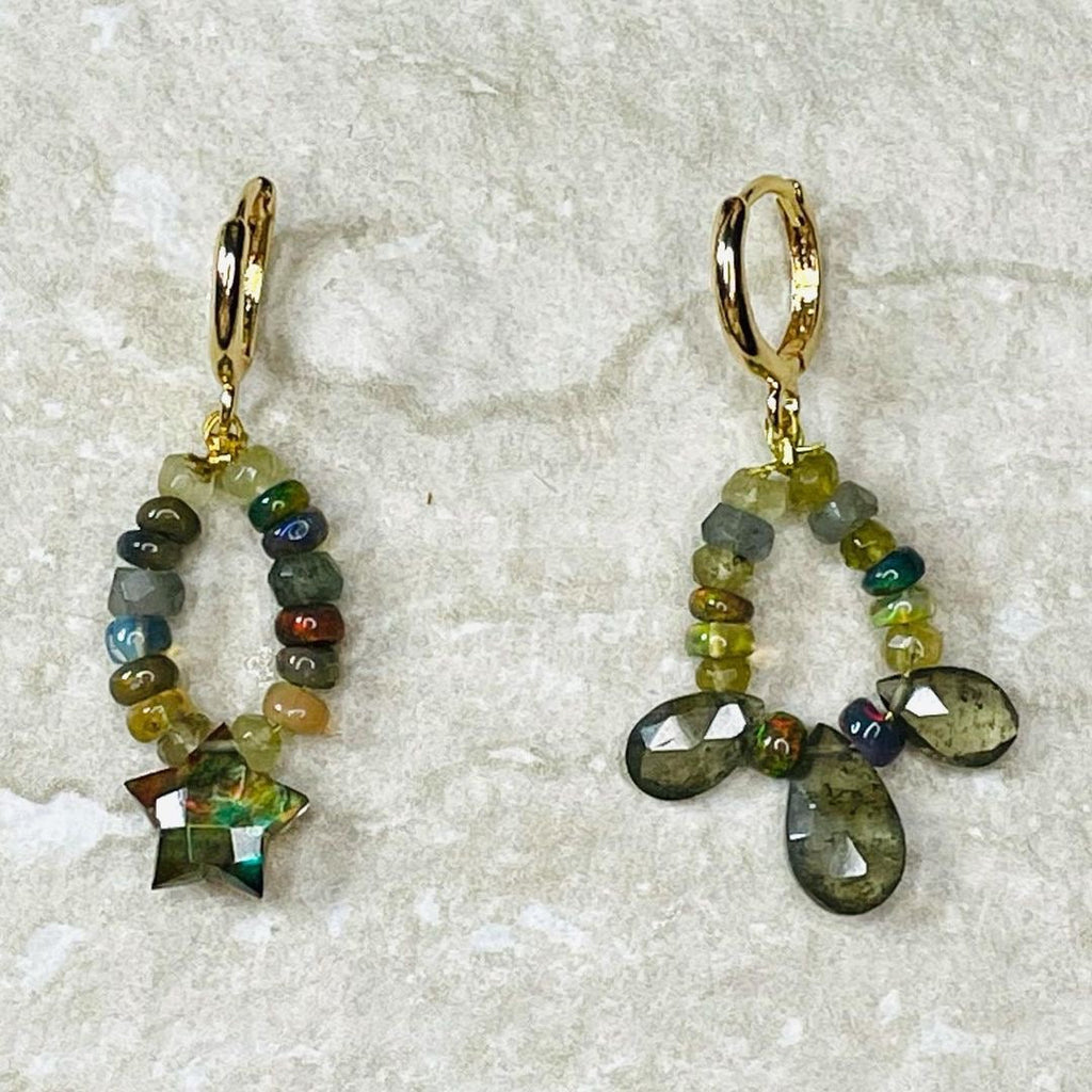 Part of our Precious Elements Collection, the 'Paradise' drop earrings are handmade from green opals and moss aquamarine rondelles. One earring has three leaf green faceted amethyst briolette drops and the other an iridescent shell hand cut star.
