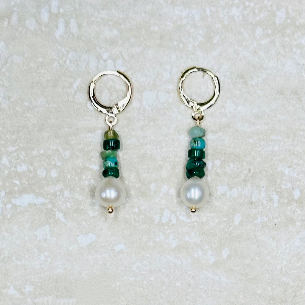 Part of our Precious Elements Collection, these earrings are handmade from hand cut peridot, malachite, green apatite and cream rondelle pearls.