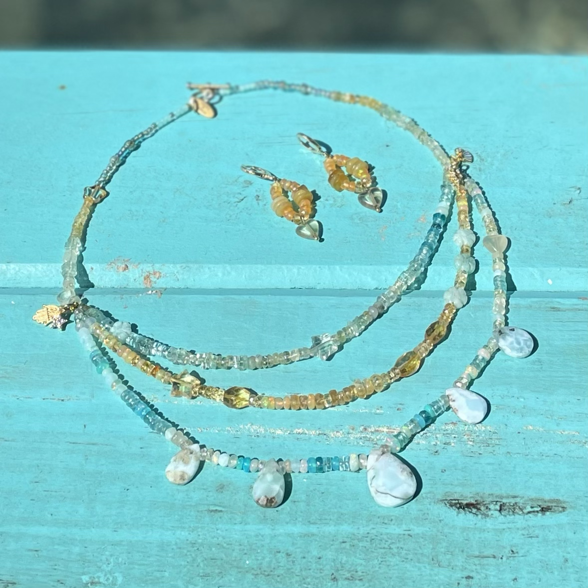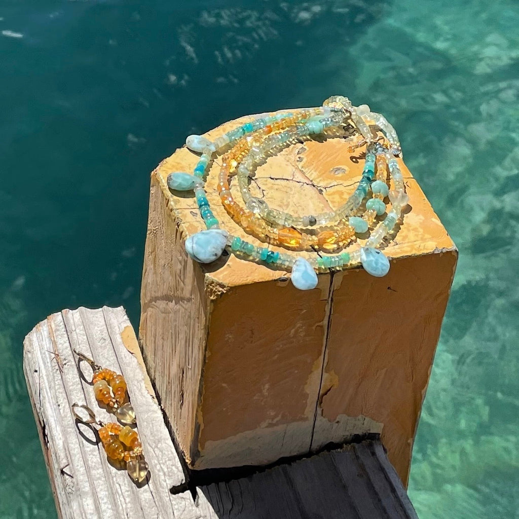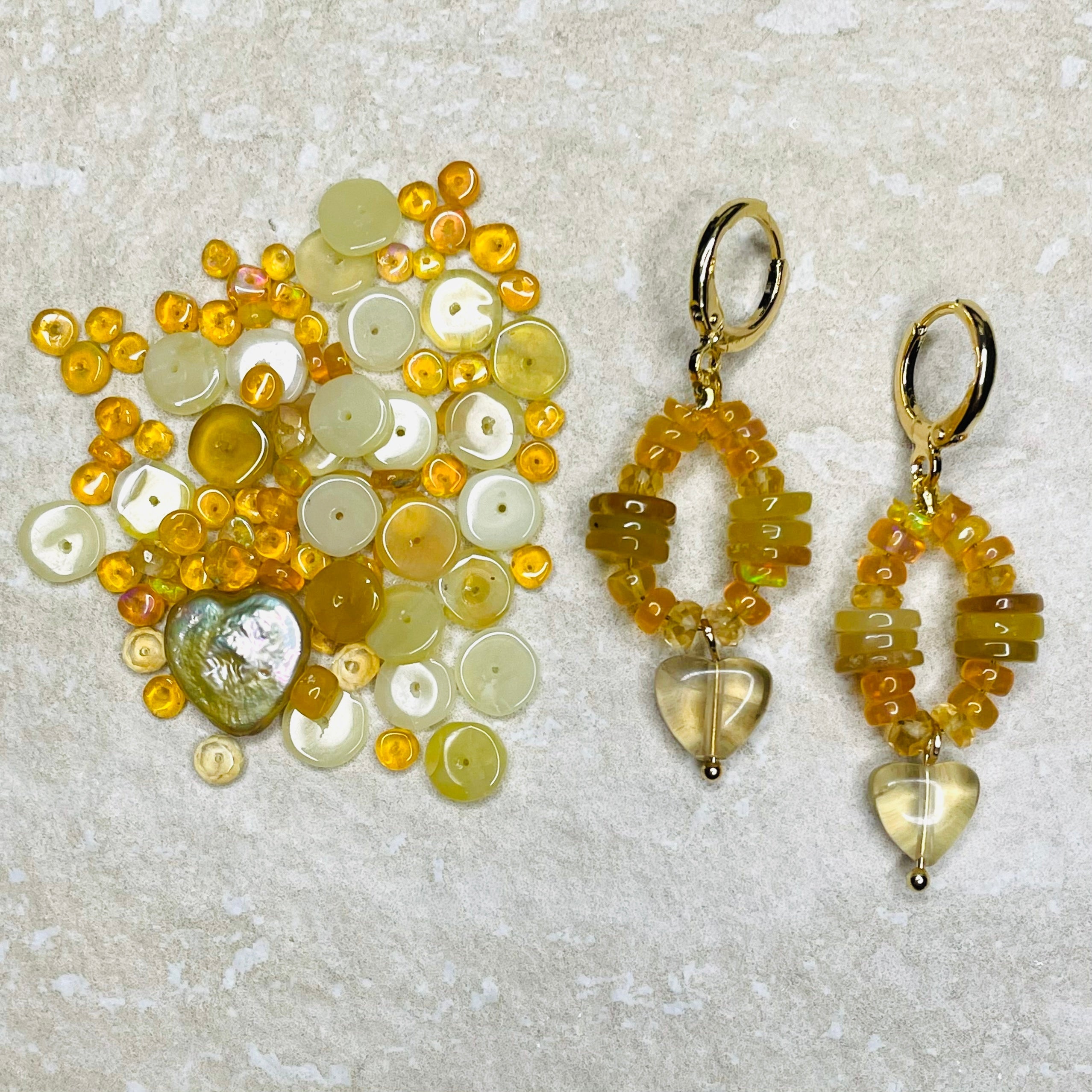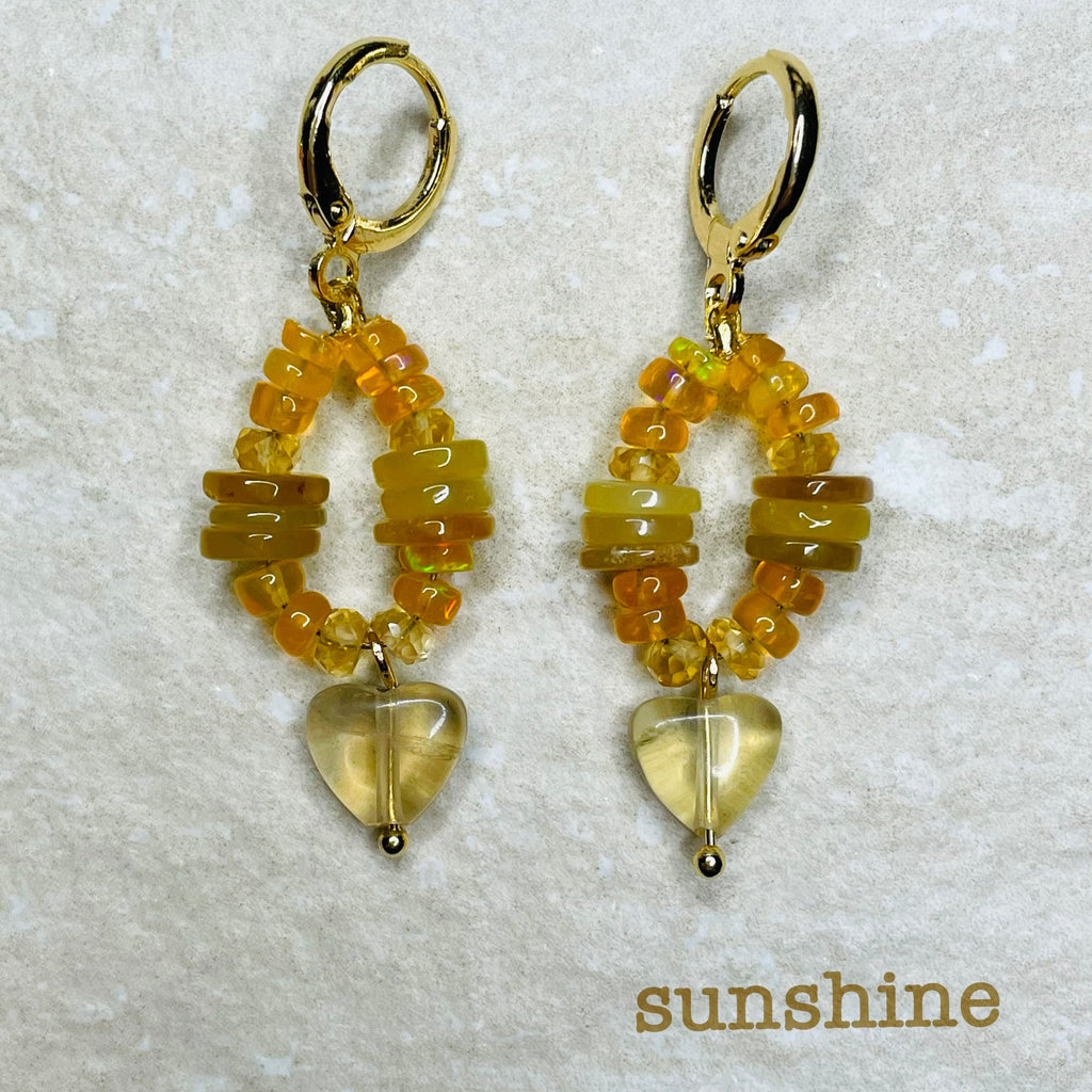 Part of our Precious Elements Collection, these 'Sunshine' earrings are handmade from golden rondelle and tyre opals, hand cut faceted citrine rondelles and flourite heart drops