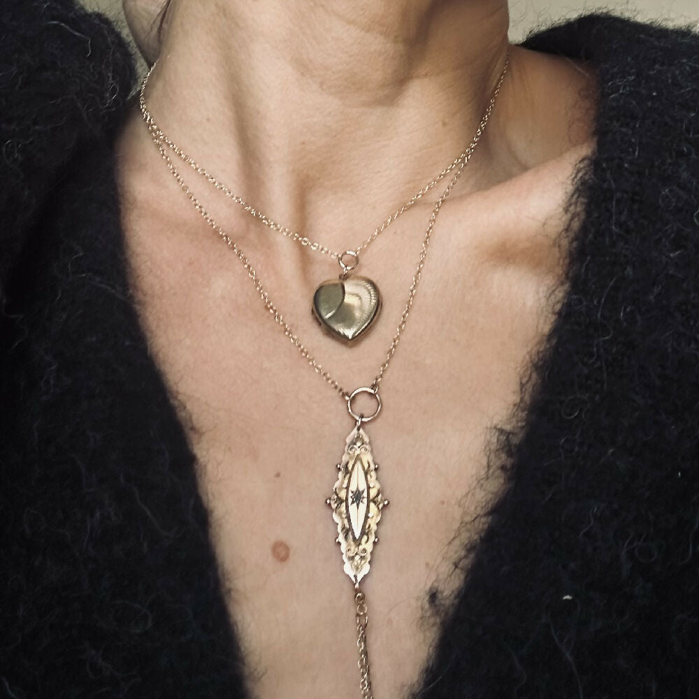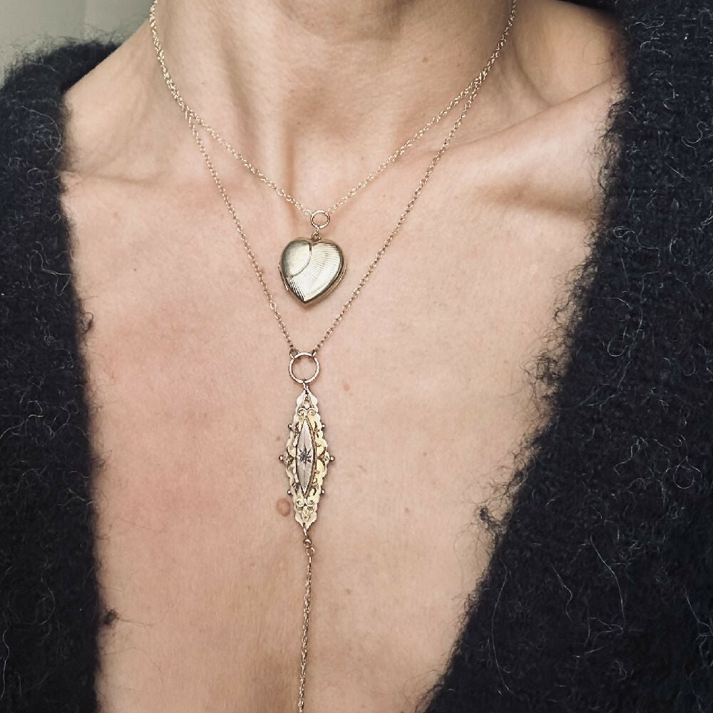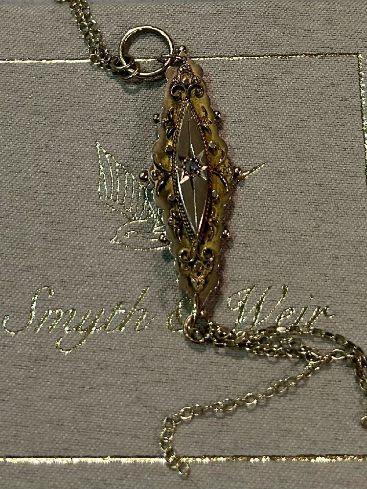 Expertly crafted , this Victorian 9ct gold and diamond former locket brooch makes a beautiful pendant. It suspends from a modern 9ct gold trace chain while a mix chain tassel dangles below.