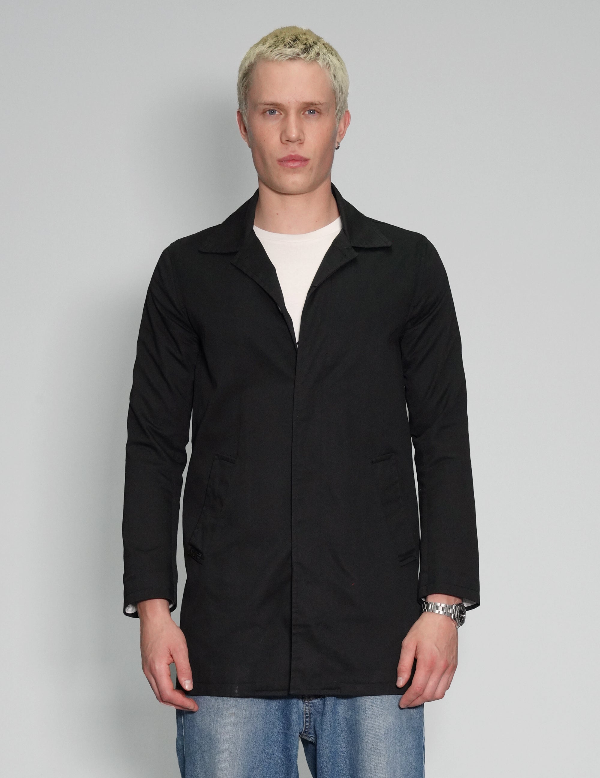 Black vintage Bolongaro Trevor macintosh in black. 100% cotton. Inside breast pocket, slit hip pockets and button fastened front. Bolongaro Trevor is the former brand by Stuart Trevor, having sold it in 2017.