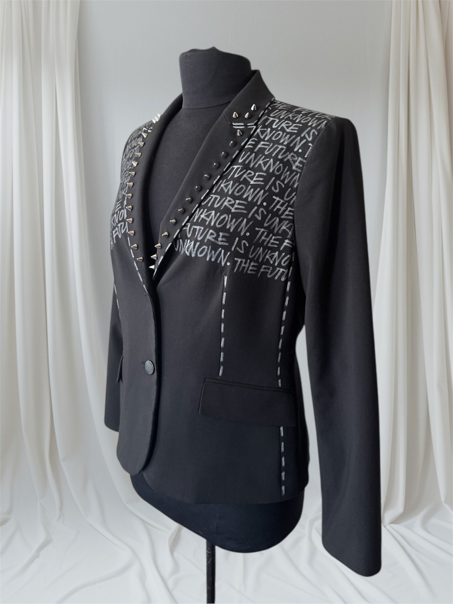 THE FUTURE IS UNKNOWN Size US 10 Womens Suit Jacket Hand-painted women’s punk-inspired suit jacket with spiked lapels. A classic tailored silhouette transformed into a one-of-a-kind fashion statement. Each jacket is individually upcycled and customized by hand — a refusal of fast fashion and mass production. Details• Hand-painted statement• Spiked lapels• Classic tailored suit jacket silhouette• Upcycled / sustainable• Dry clean safe Created in a single size as part of our upcycled collection. Custom commissions are available through our Custom Suit Jacket program:https://punkmajesty.com/pages/custom-suit-jackets Returns are accepted if you notify us directly via email within 7 days of delivery to receive instructions. Items must be returned unworn in original condition, insured with tracking number provided. measurements 20 inch chest 18 inch waist 24 inch sleeve length 16 inch shoulders 25 inch back length