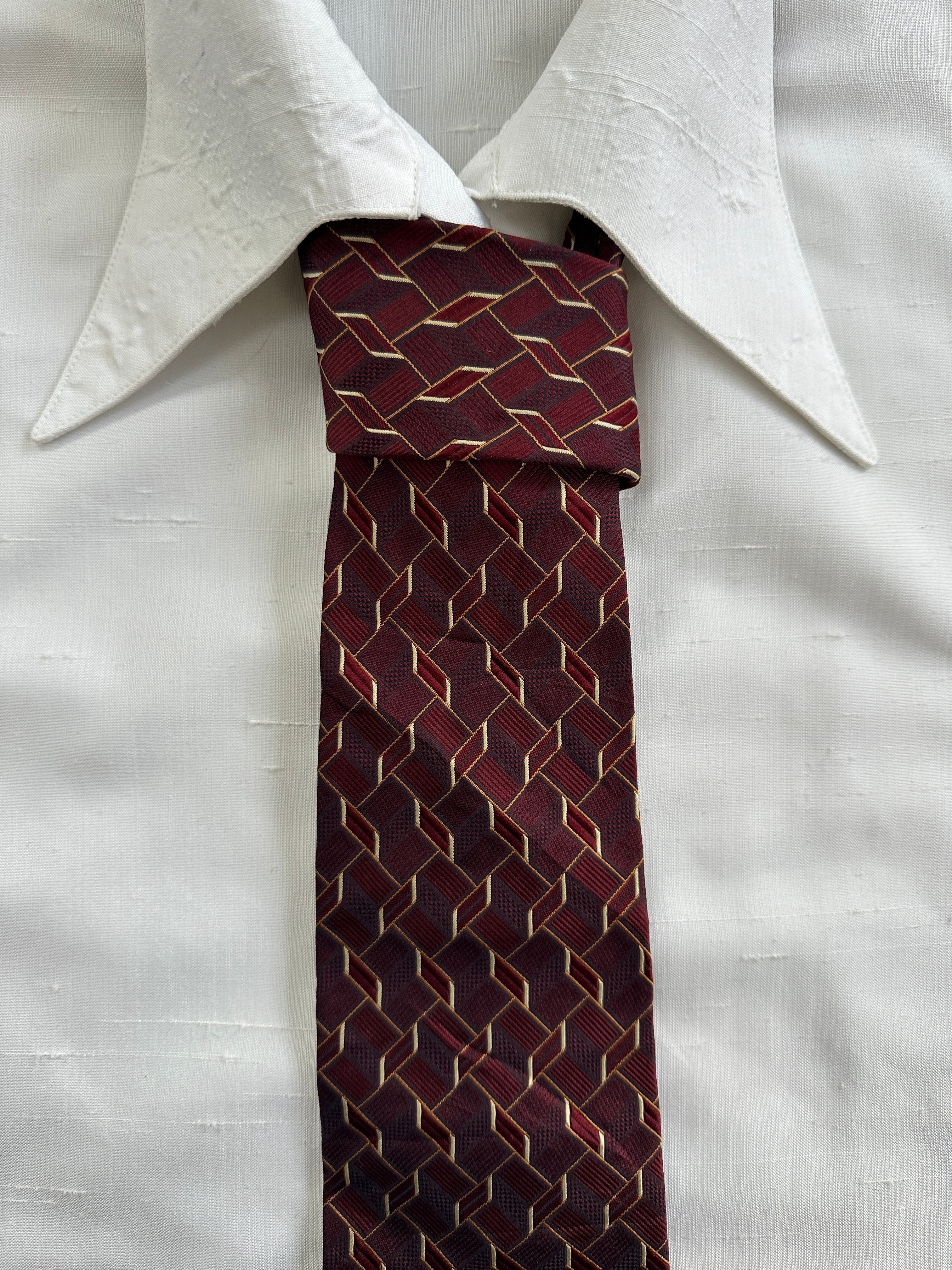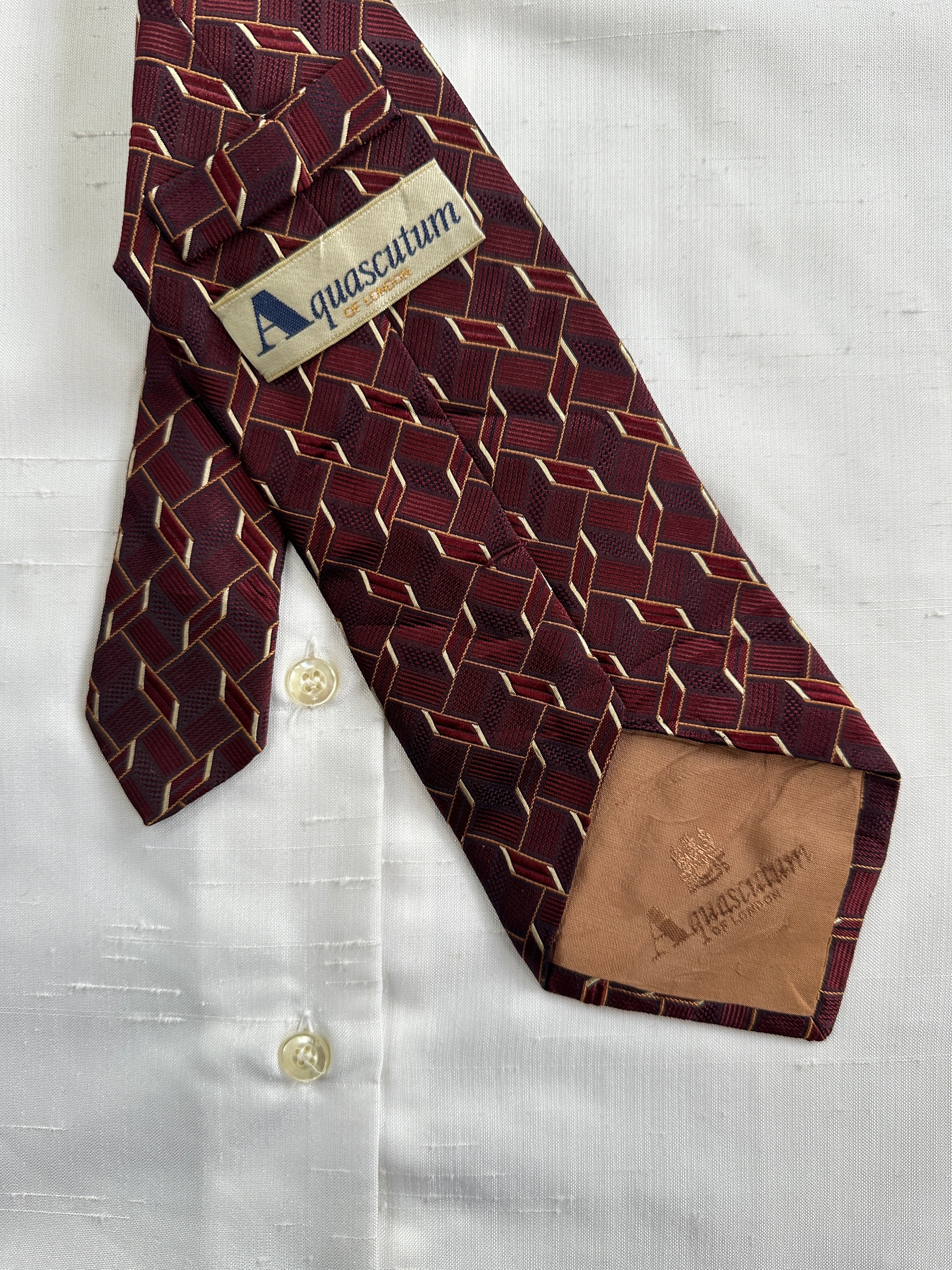 A vintage Aquascutum 1990s tie crafted in pure silk, featuring a rich red base with a repeating cream geometric pattern. A refined accessory that works seamlessly with tailoring, trench coats, and classic menswear silhouettes.