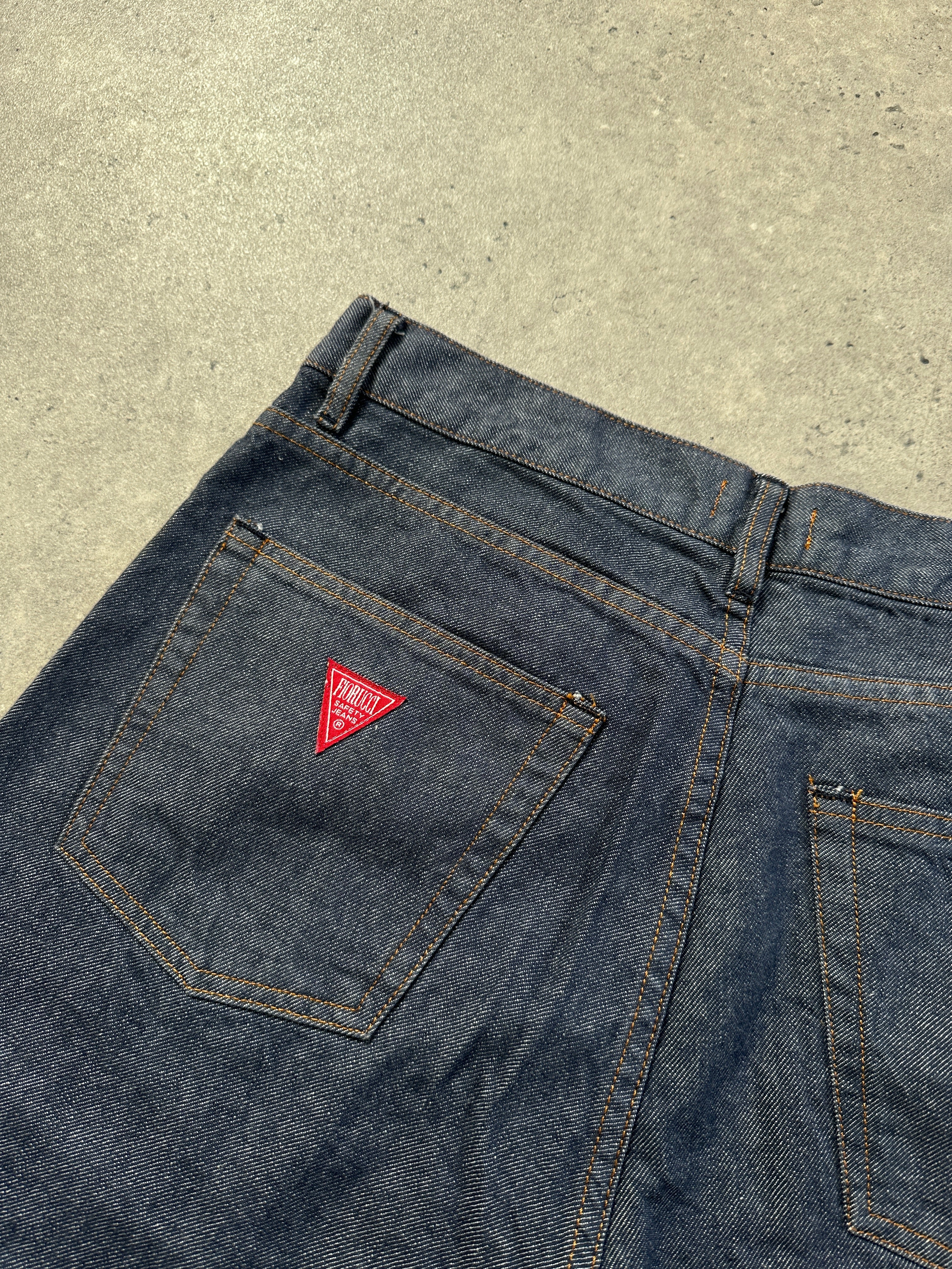 Original Fiorucci Safety Jeans in rigid dark indigo denim, cut with a high waist and straight leg for a clean, elongated silhouette