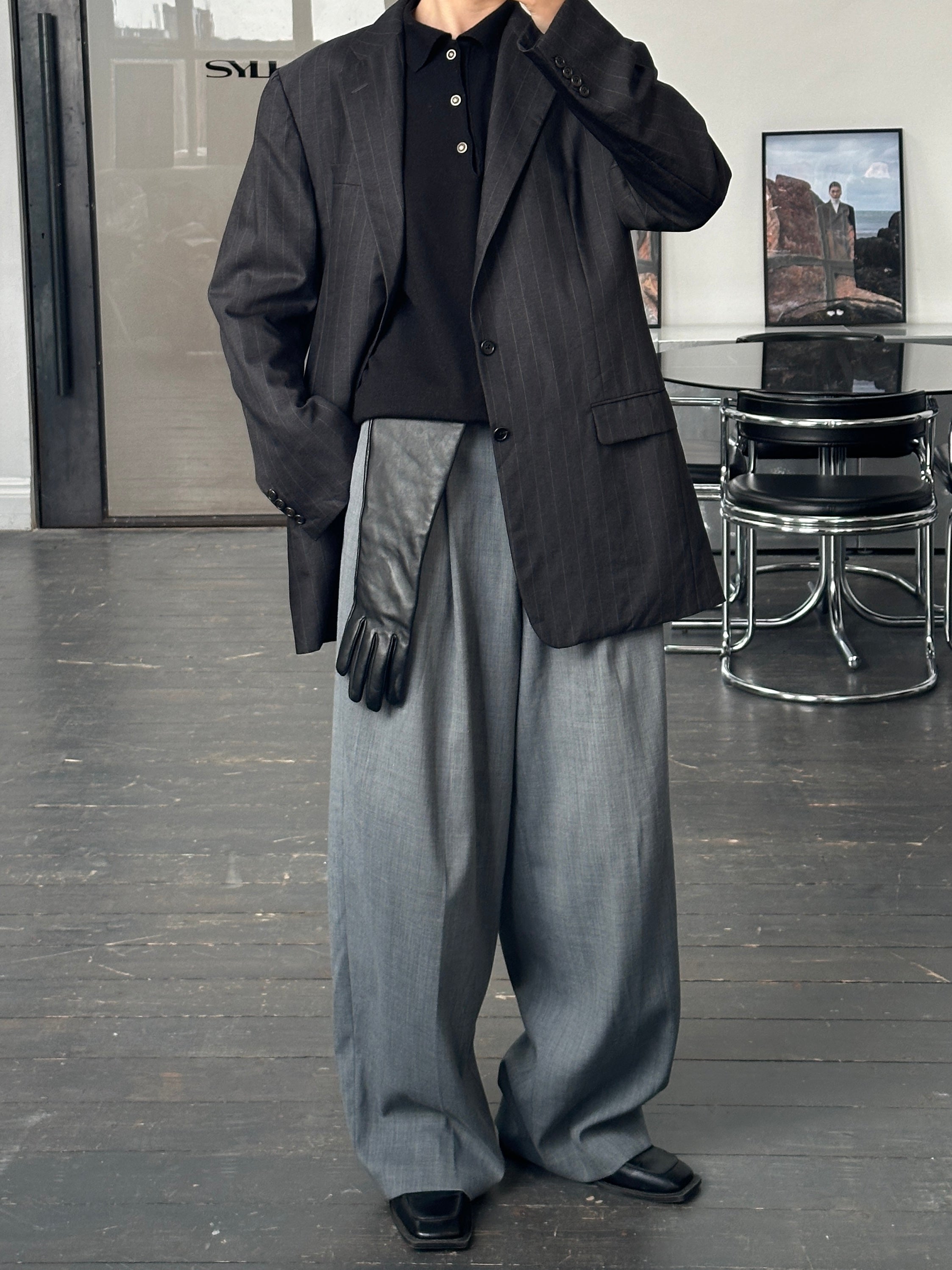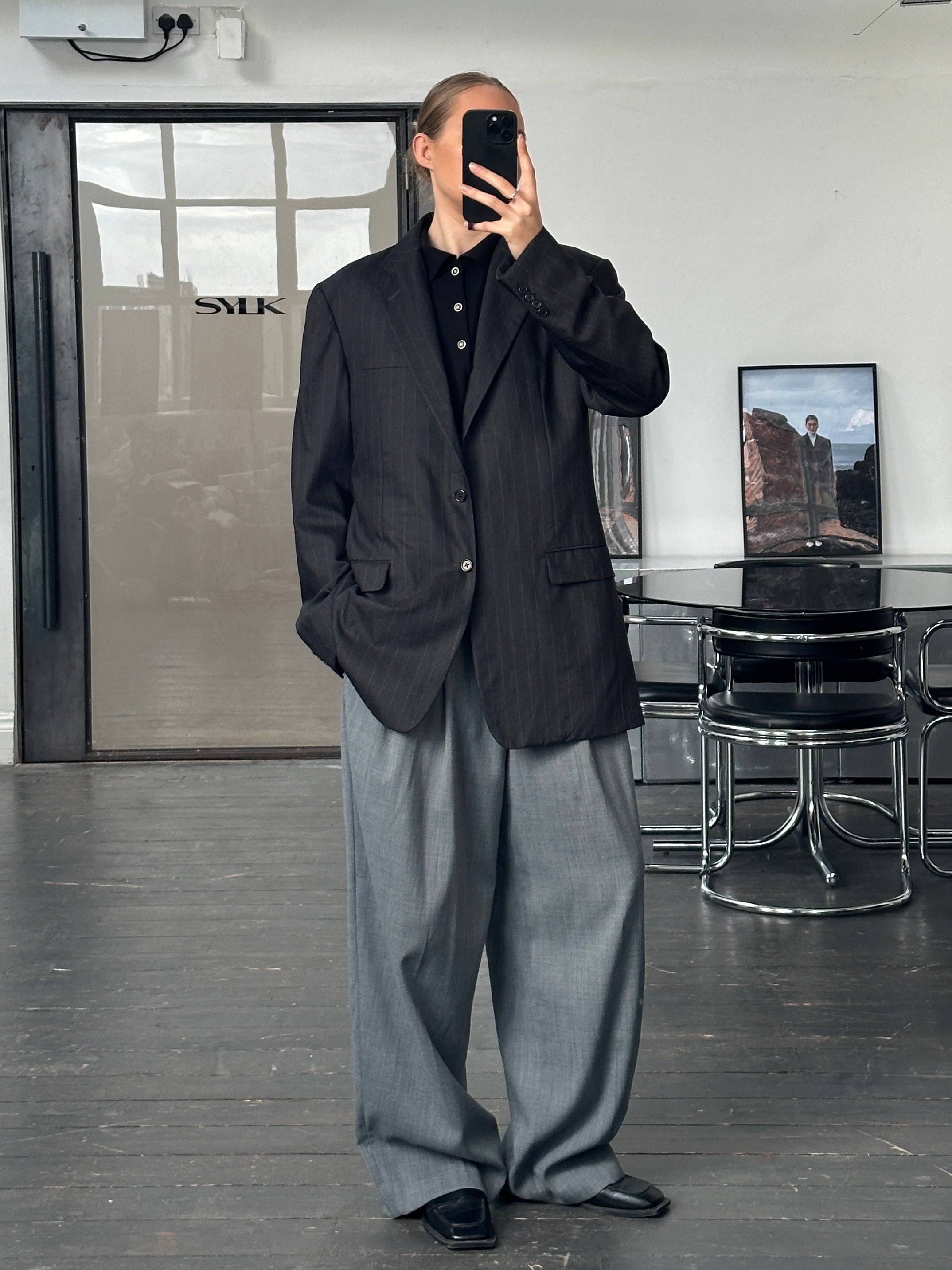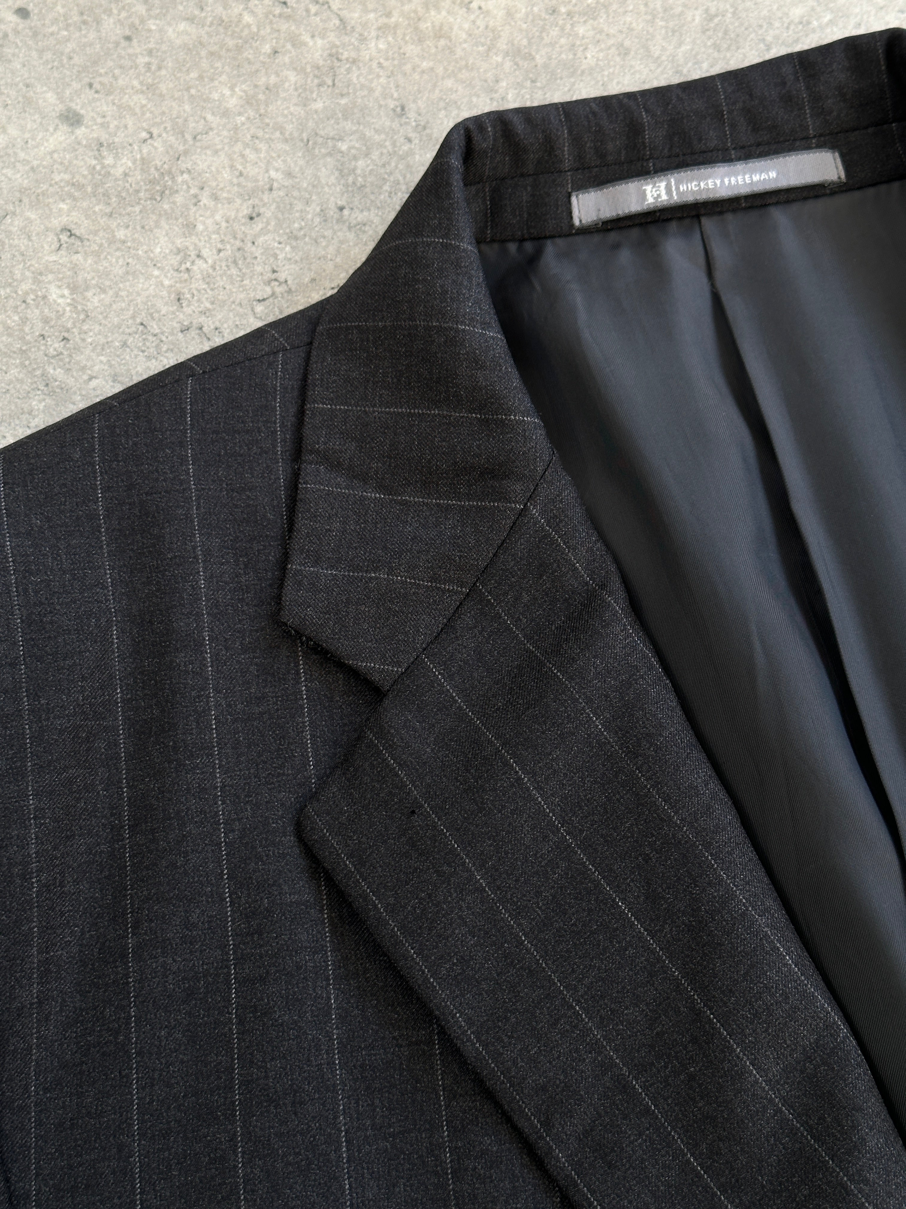 A vintage 1990s Hickey Freeman single breasted blazer in a soft grey pinstripe tone crafted from Loro Piana Tasmanian Super 120’s wool. A clean structured silhouette with a refined drape and a quietly elevated finish.