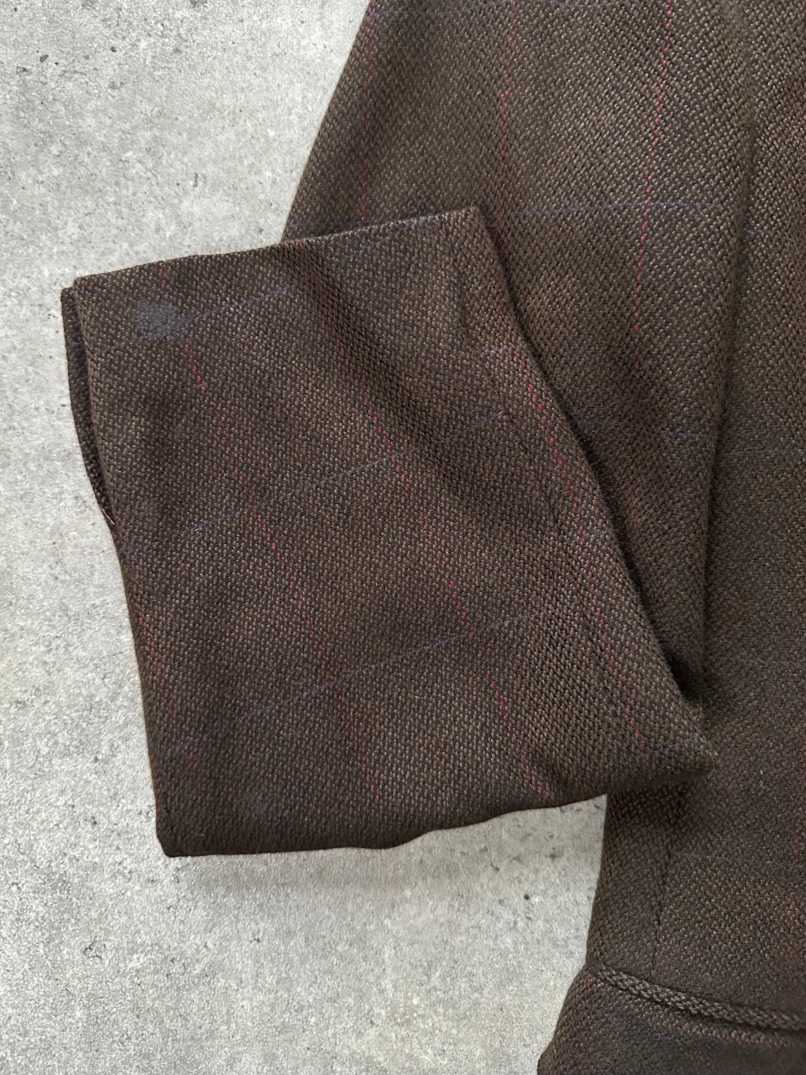 Vintage brown check blazer from the 1990s Hugo Boss line, crafted in pure cashmere using luxury cloth by Loro Piana. Finished with a soft tailored structure and a subtle red and blue overcheck, offering a refined quiet luxury feel that styles effortlessly relaxed or sharp.