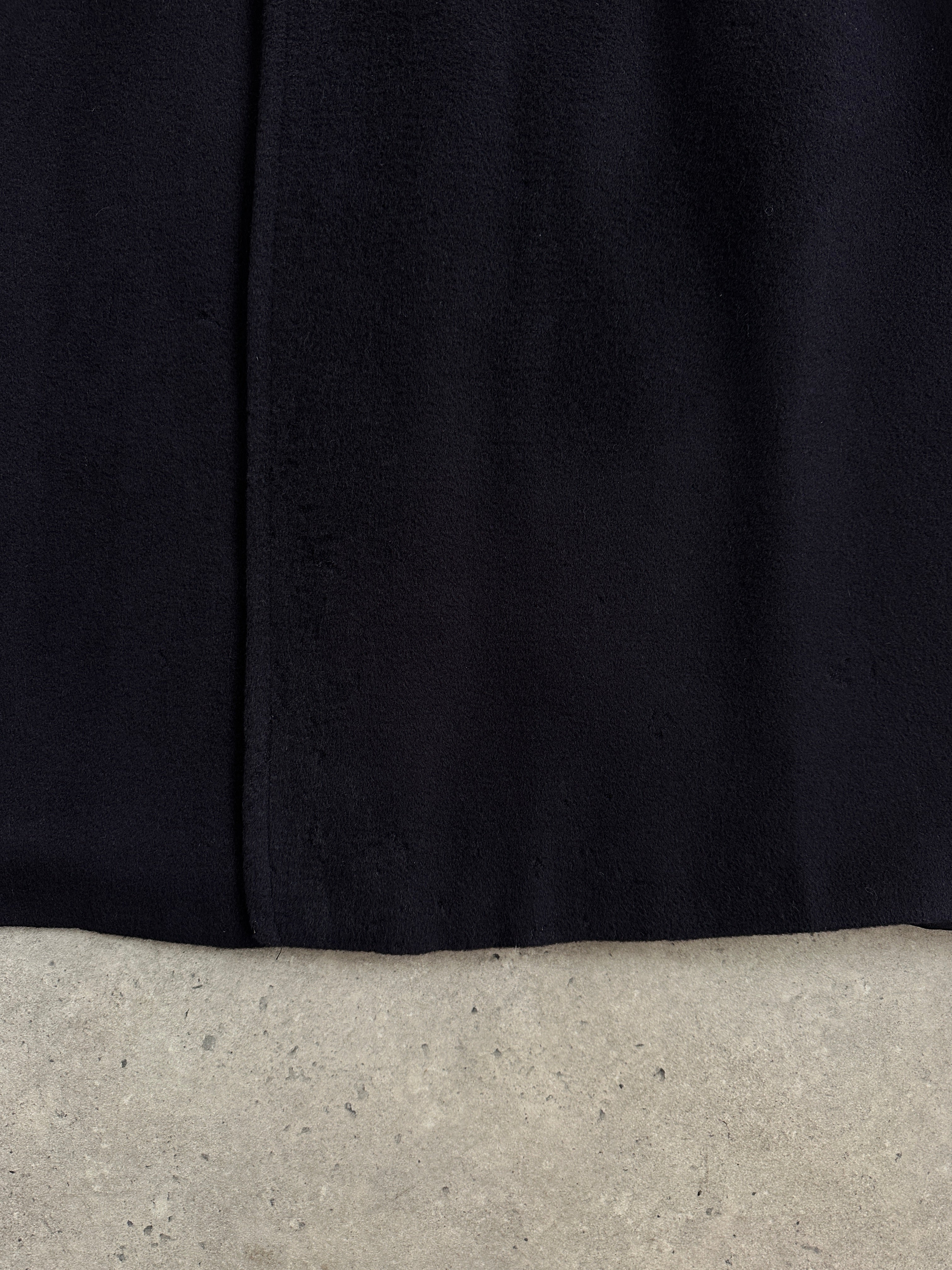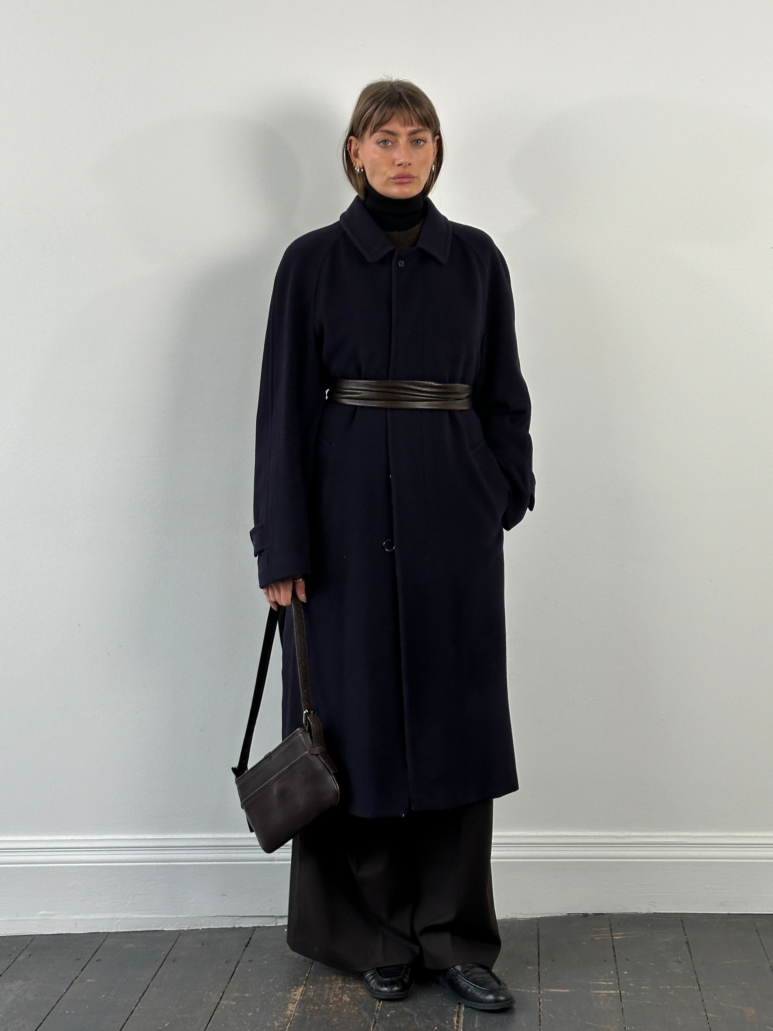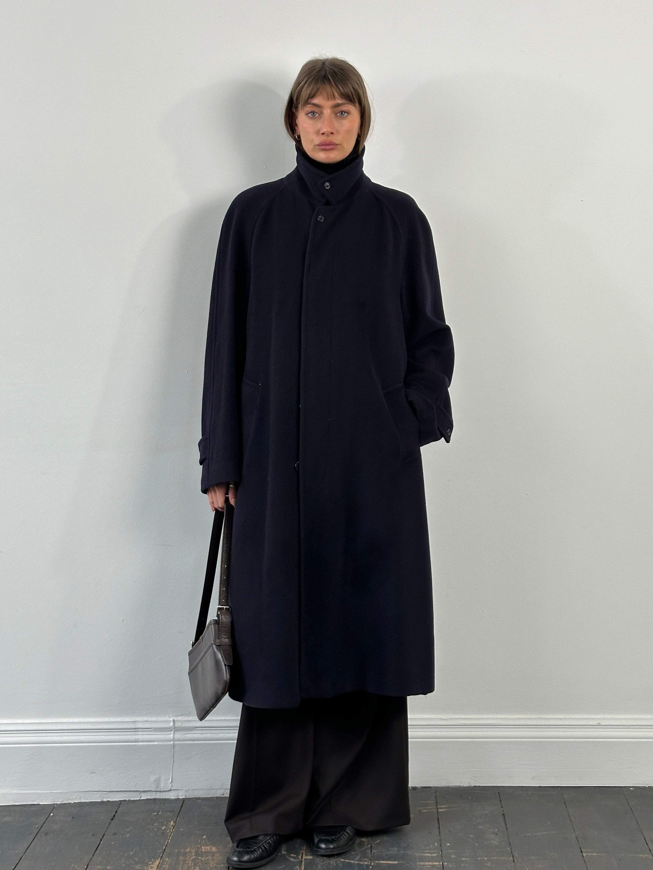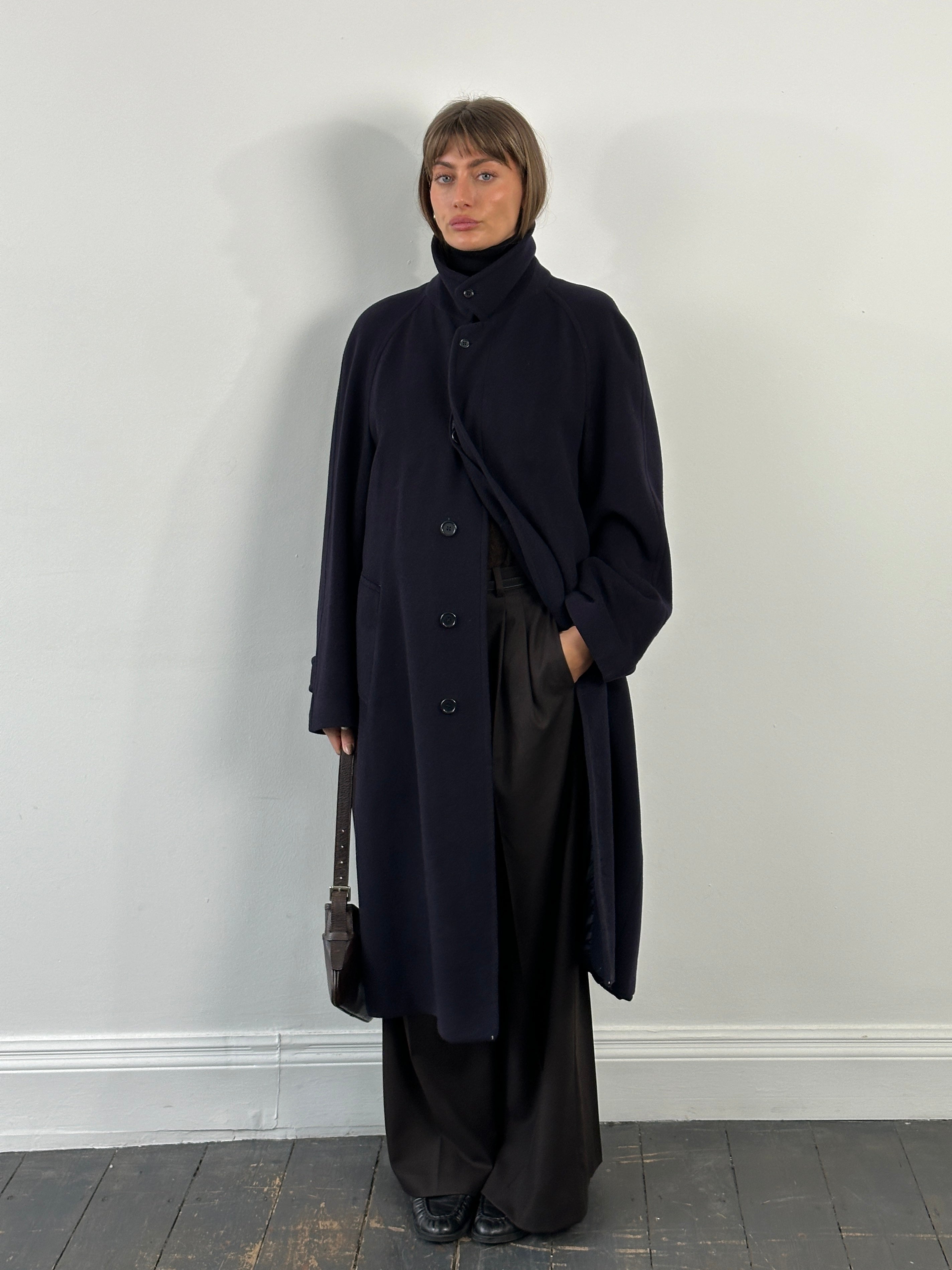 A refined 1980s Jaeger longline coat crafted from pure cashmere in a deep navy tone, finished with a high neck fastening and a concealed front placket for a clean, minimal silhouette. Made in England, this piece reflects Jaeger’s heritage tailoring and understated luxury.