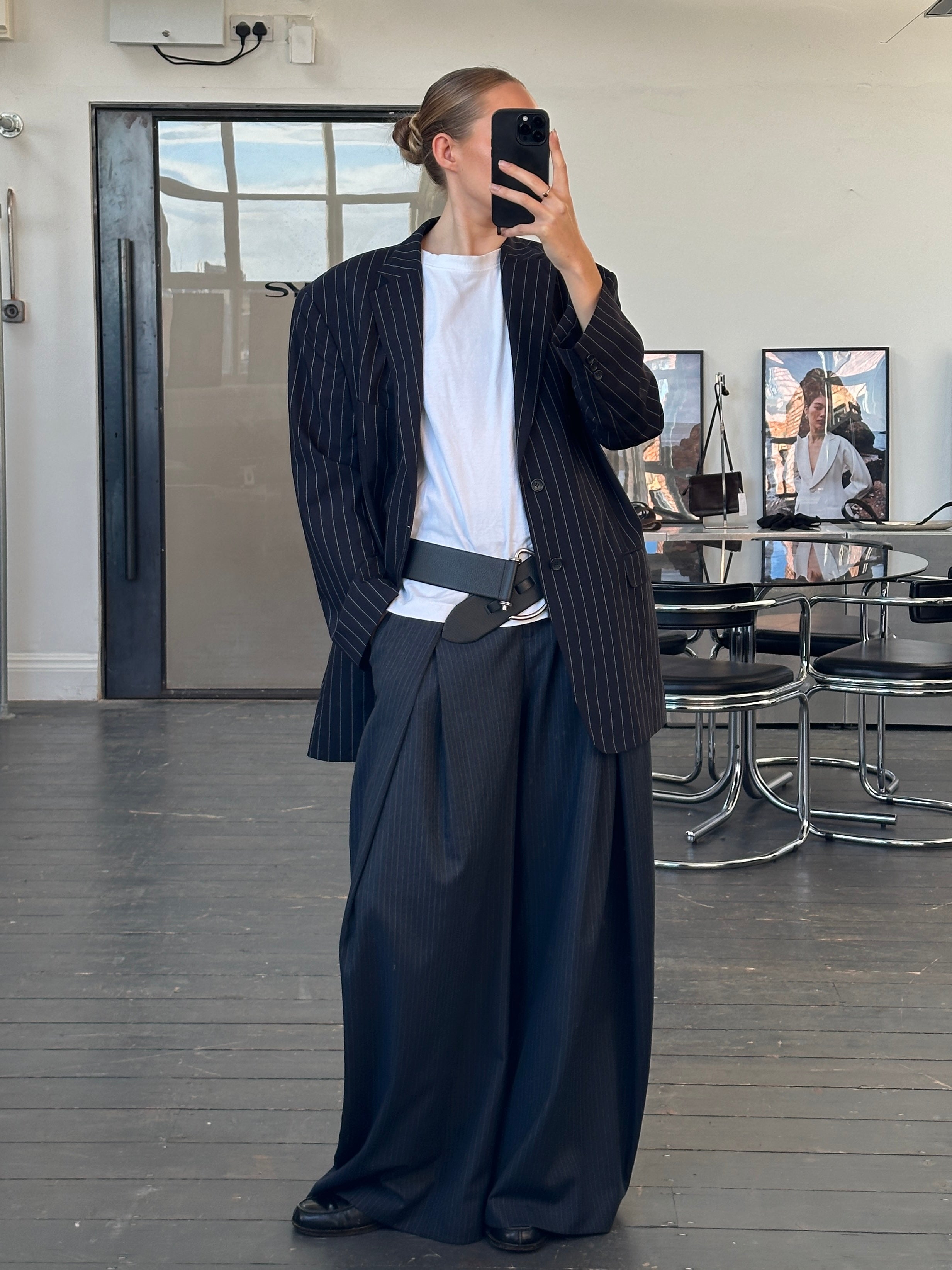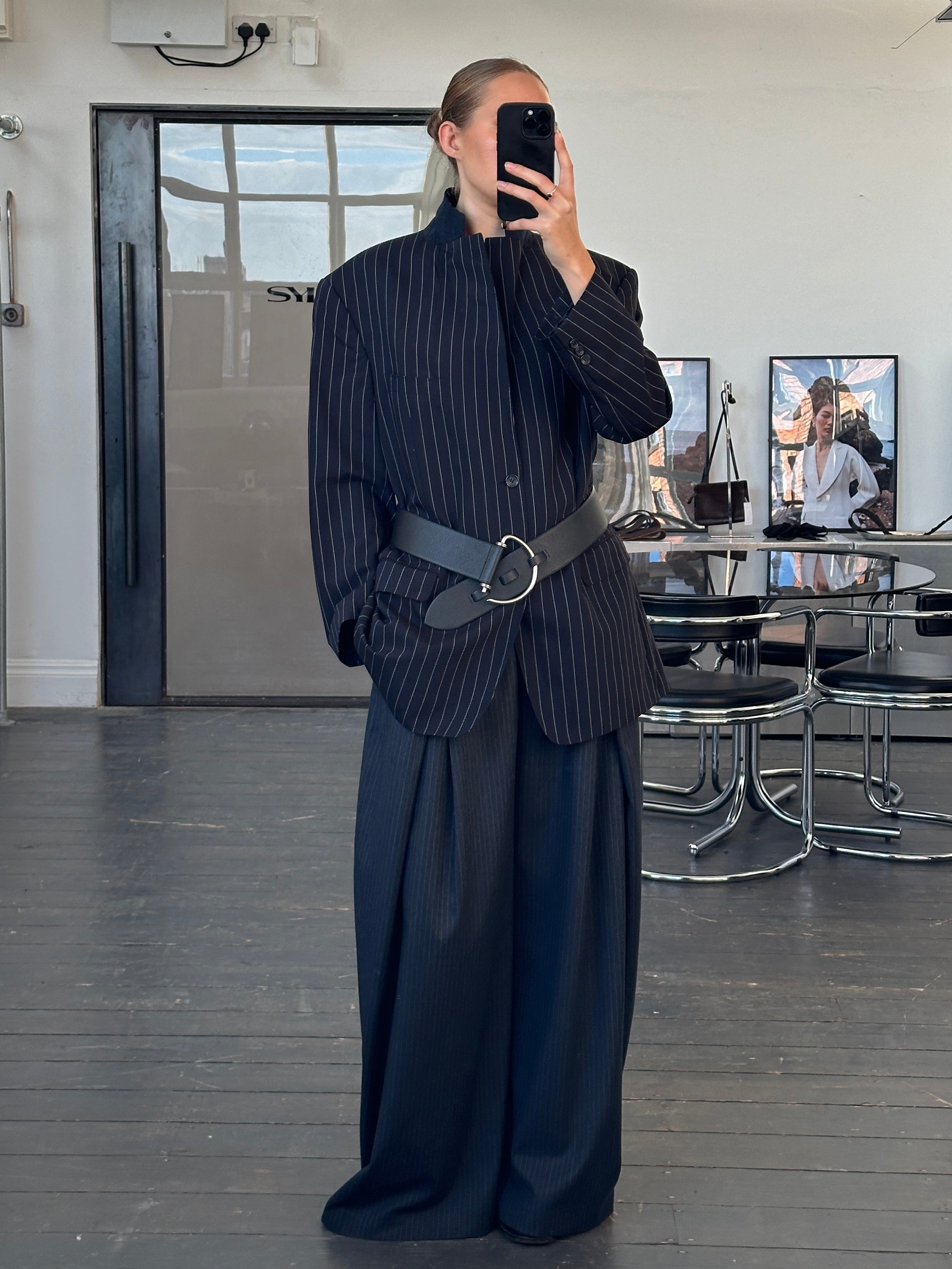 ~ Navy wool with fine vertical pinstripes for a lengthened silhouette