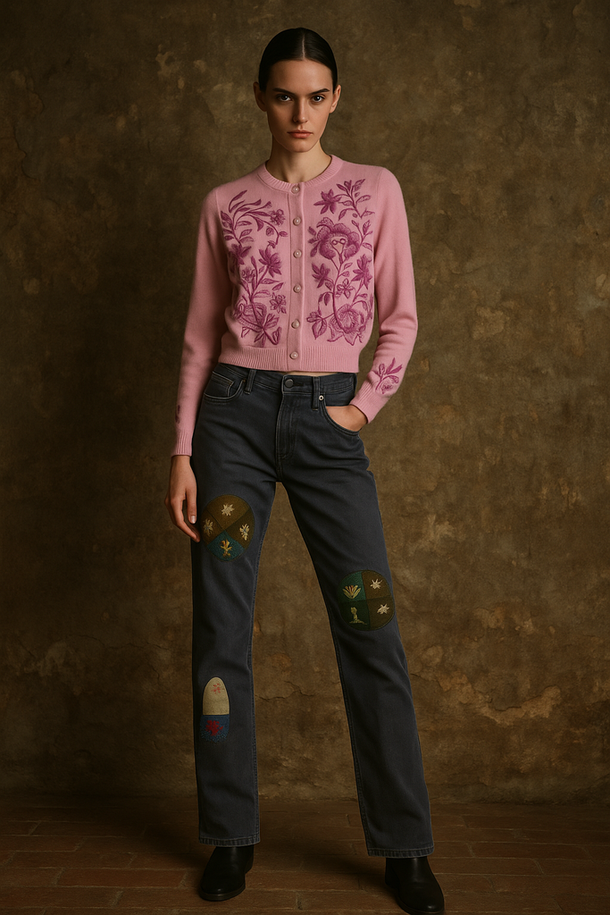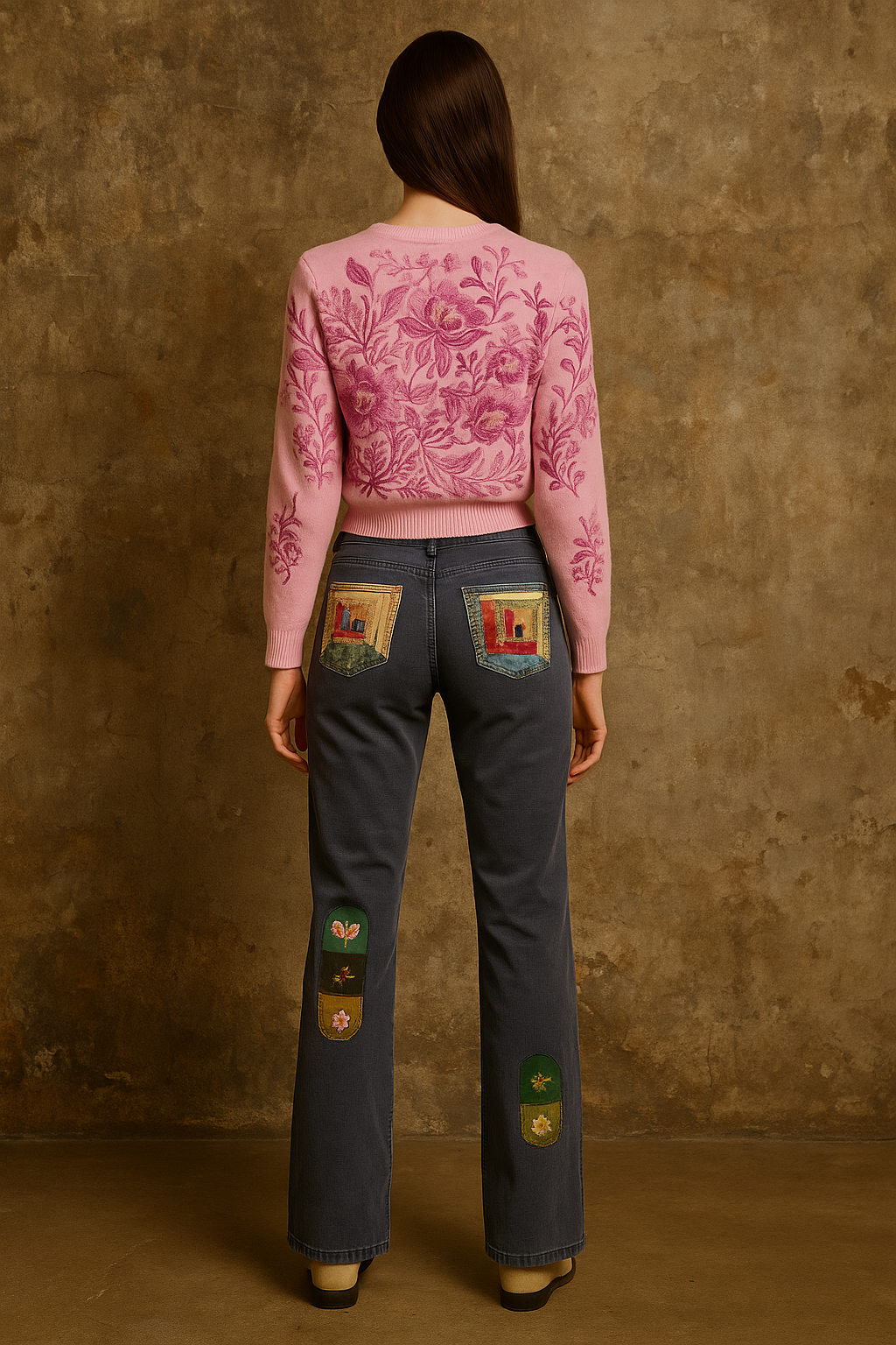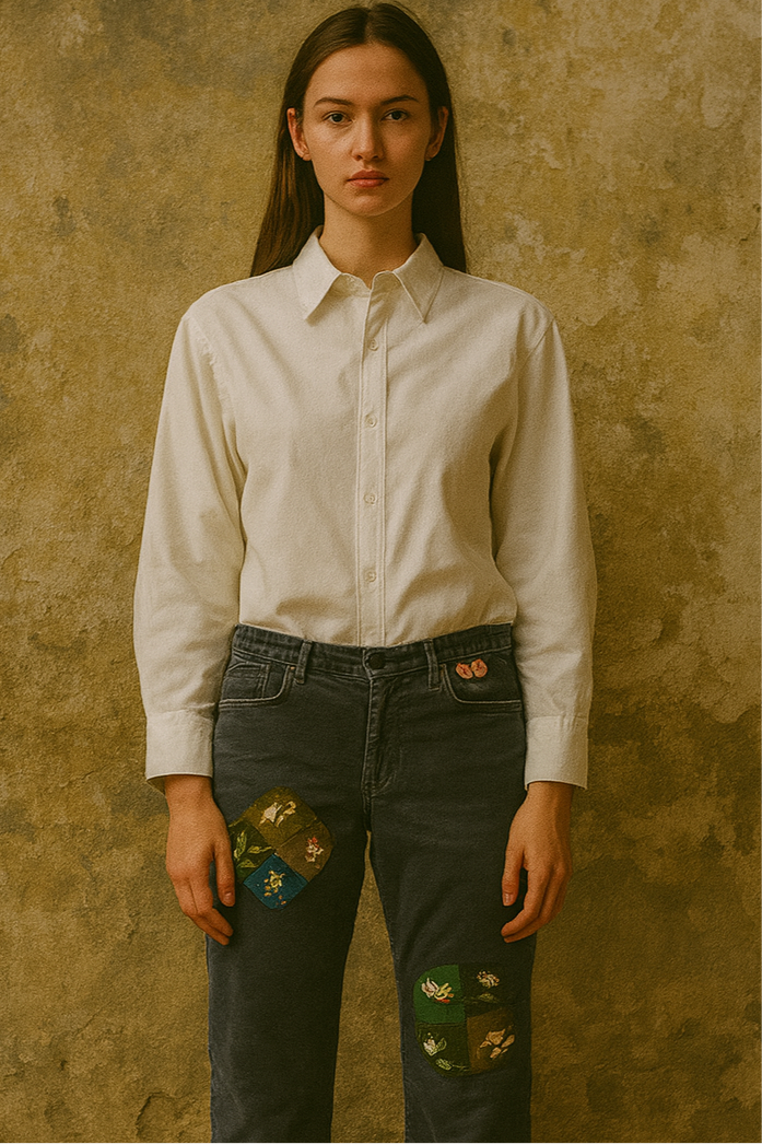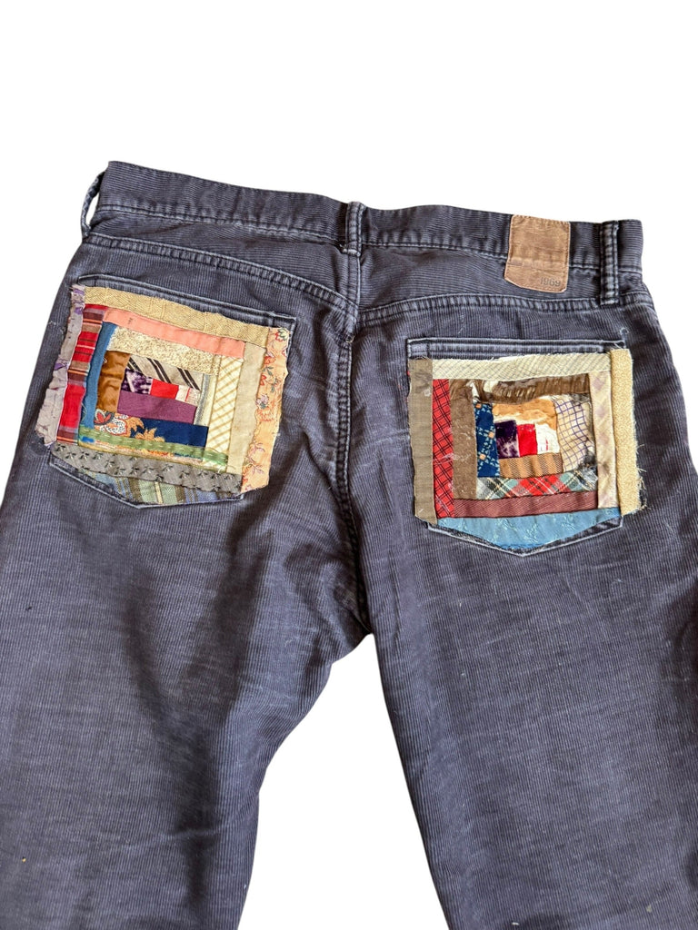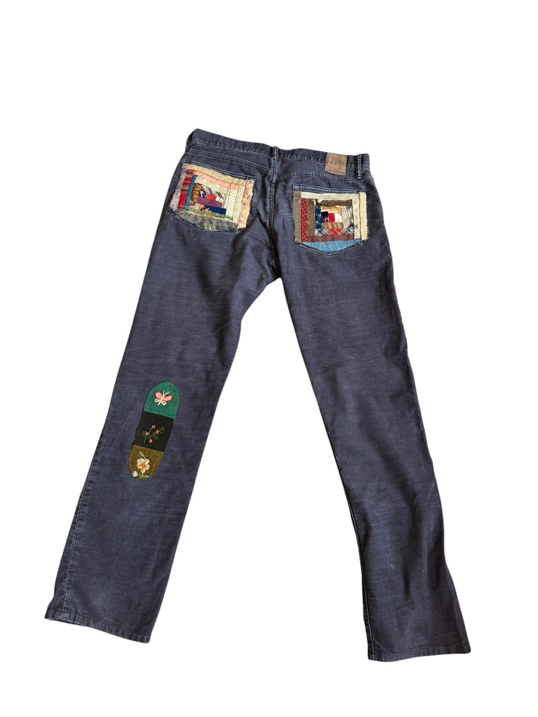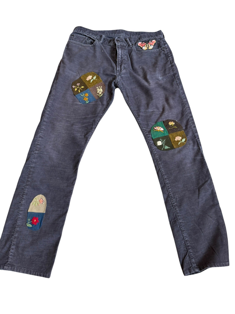 These 70s brown corduroy trousers combine vintage charm with unique craftsmanship. Featuring a midrise and straight fit, they offer comfortable, easy wear. The front zip and two back pockets add practicality, while the Victorian hand-embroidered patchwork from a curated collection makes each pair a singular piece of art. Perfect for those seeking distinctive, timeless style with A twist.