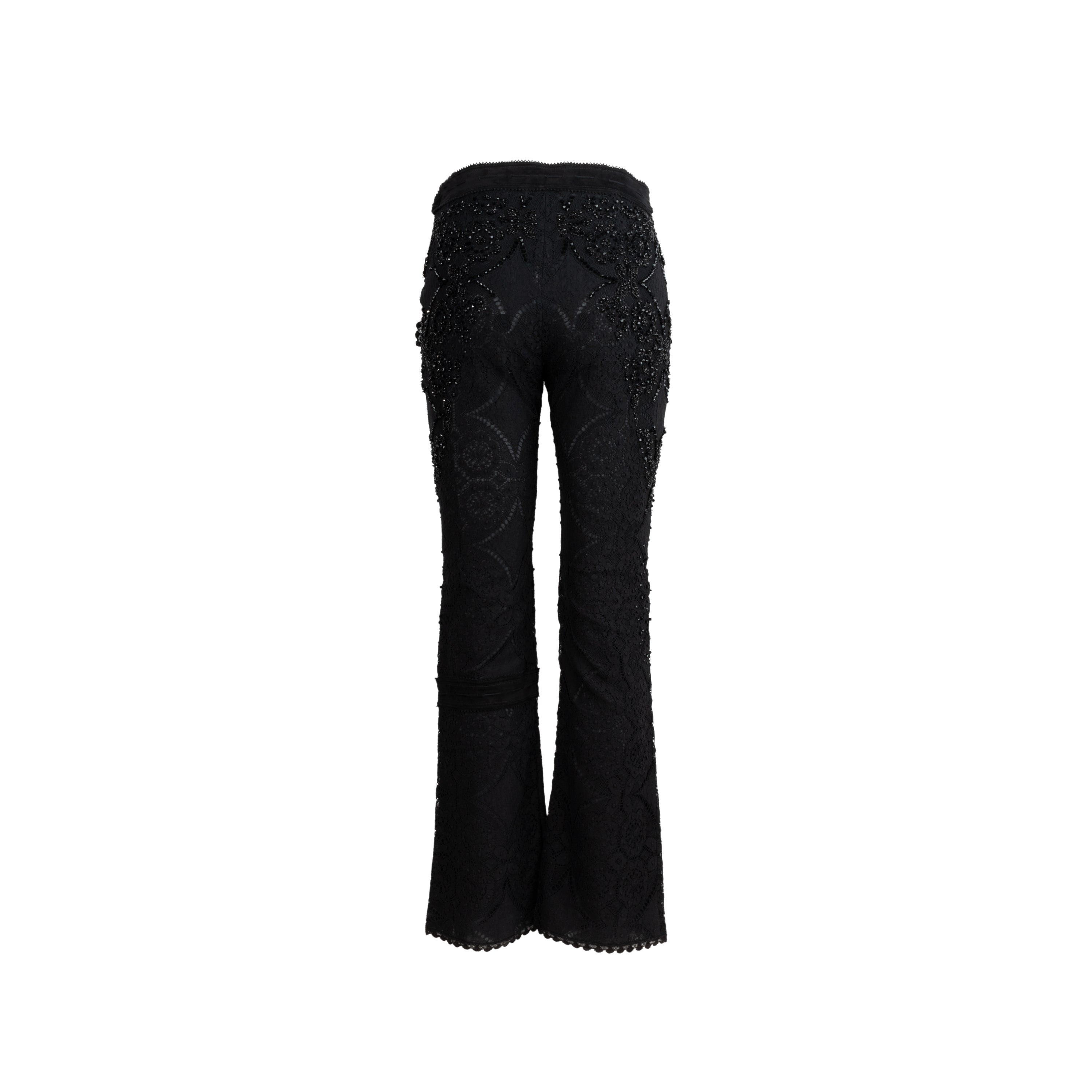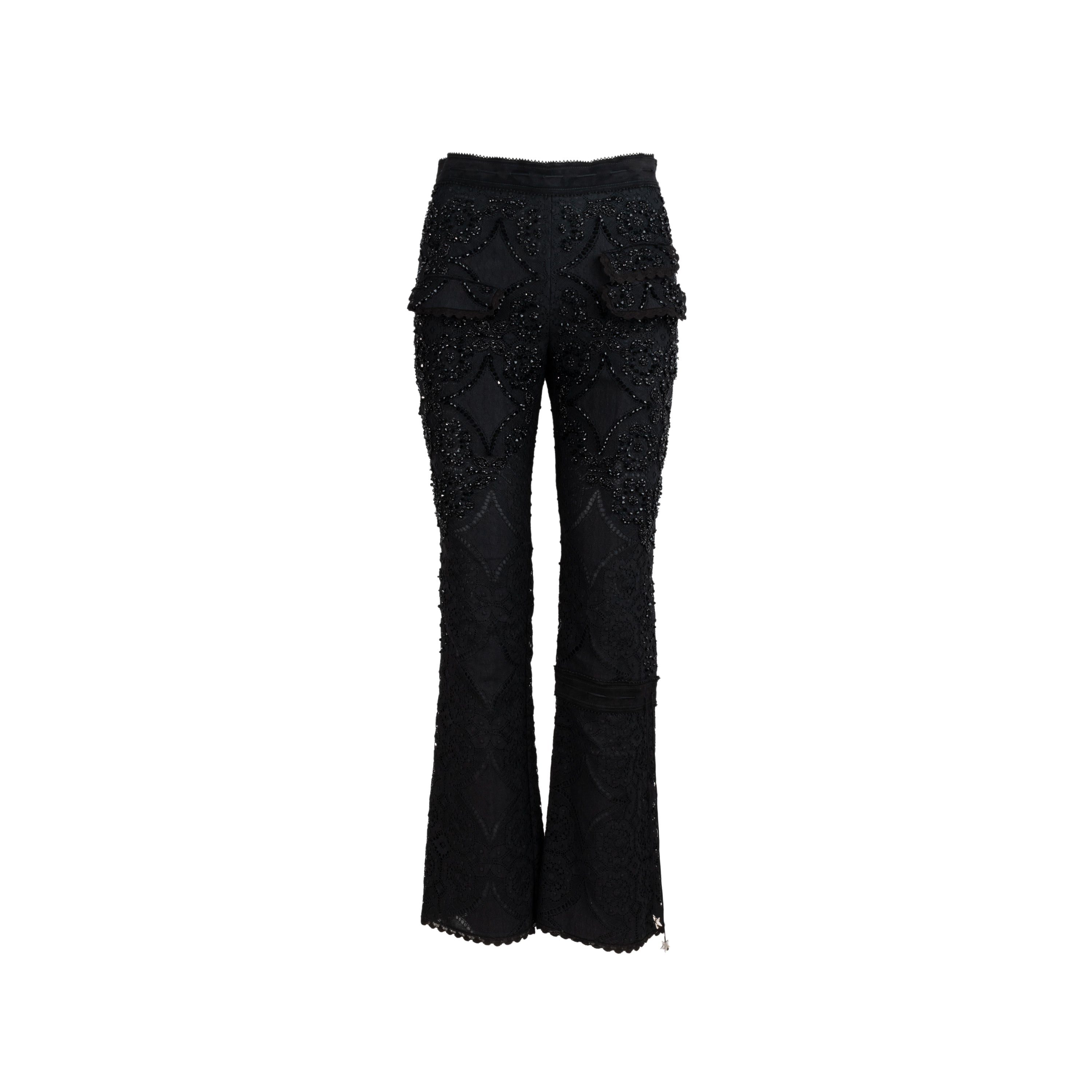 Upgrade your wardrobe with these Antonio Berardi Embellished Pants from the iconic Y2K collection. Featuring intricate all over bead and embroidery work, these low waist pants are sure to make a statement. The wide bottom is adorned with black crystals, adding a touch of flair to any outfit.
