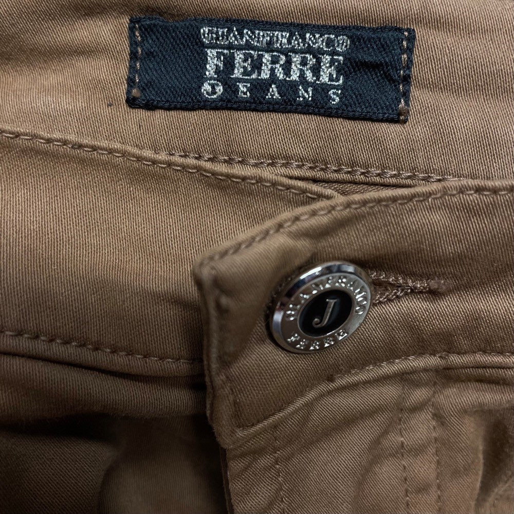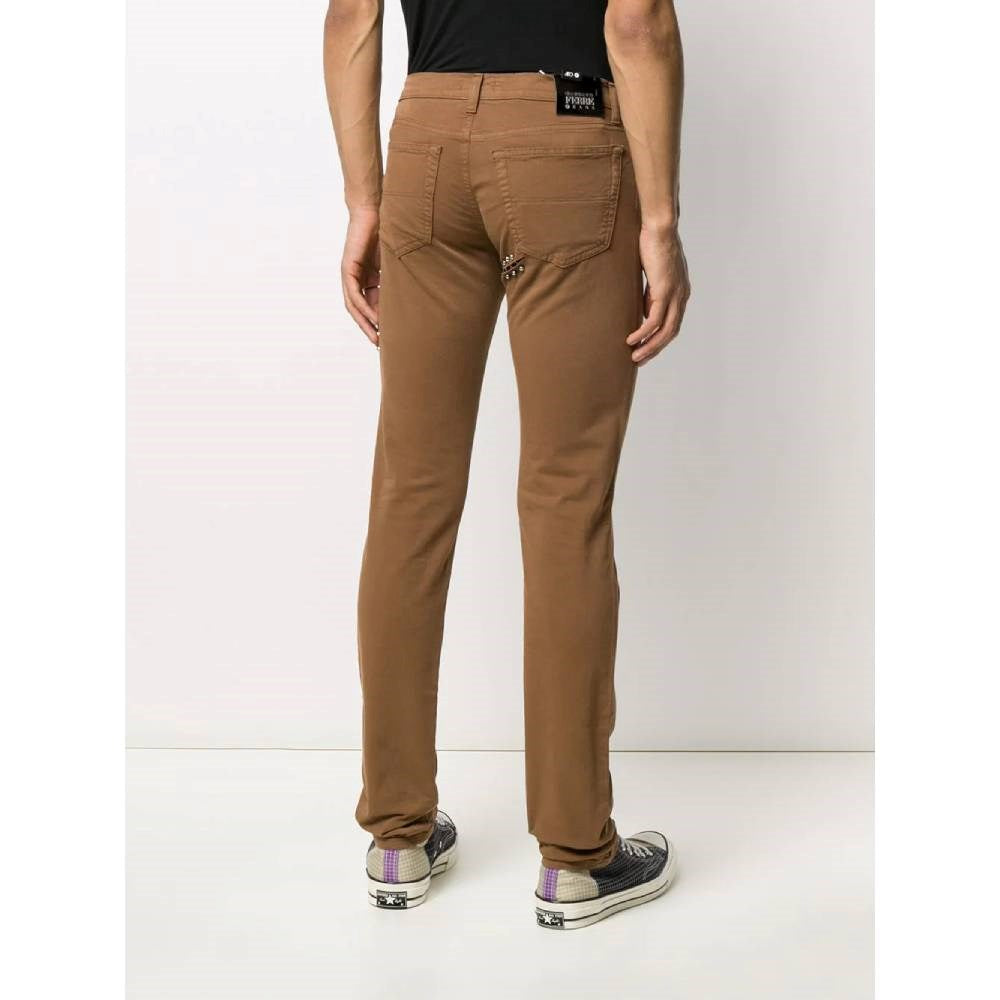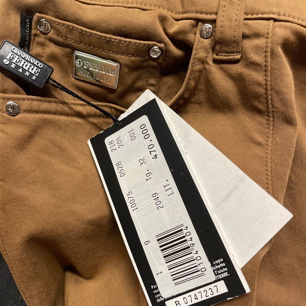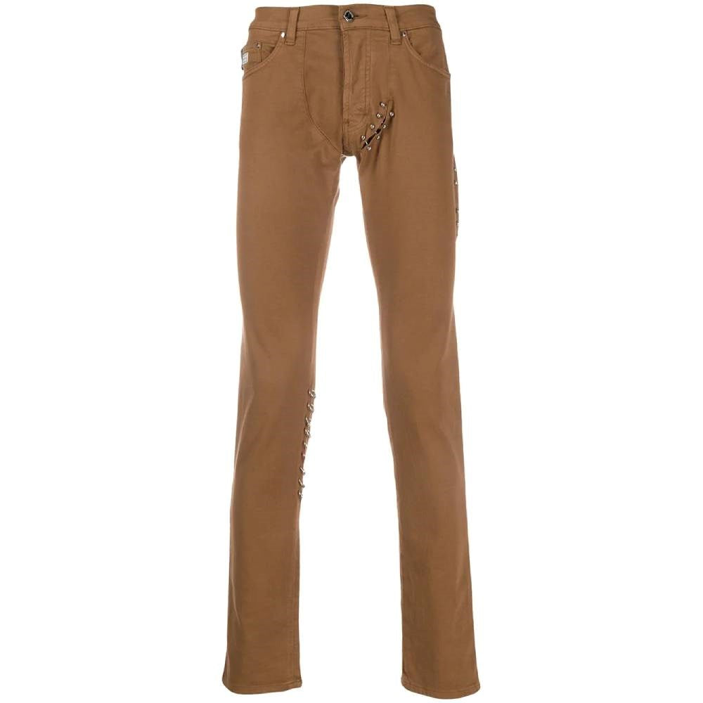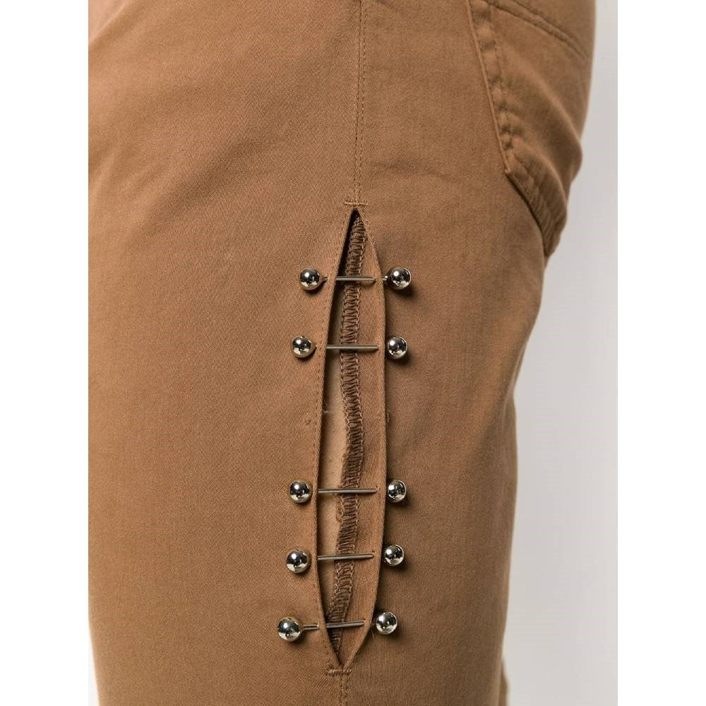 Gianfranco Ferrè brown cotton five pockets skinny 90s trousers with cut-out details embellished with metal piercings. Frontal hidden buttons fastening. This item belongs to a deadstock and it has never been worn and comes with its original tag.