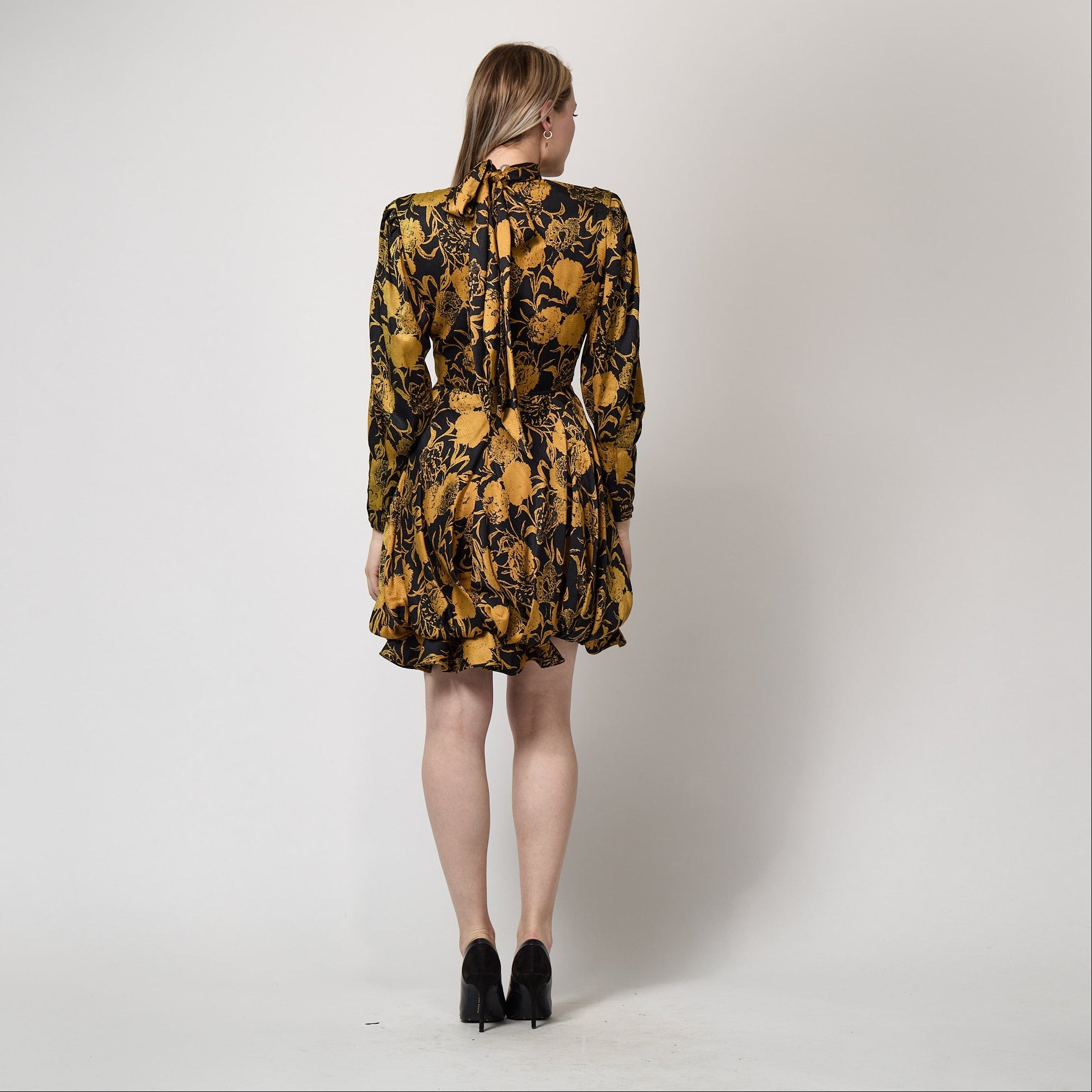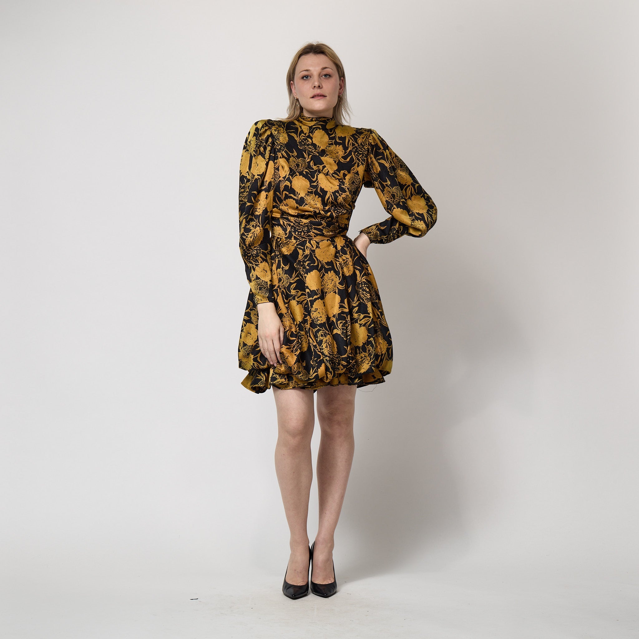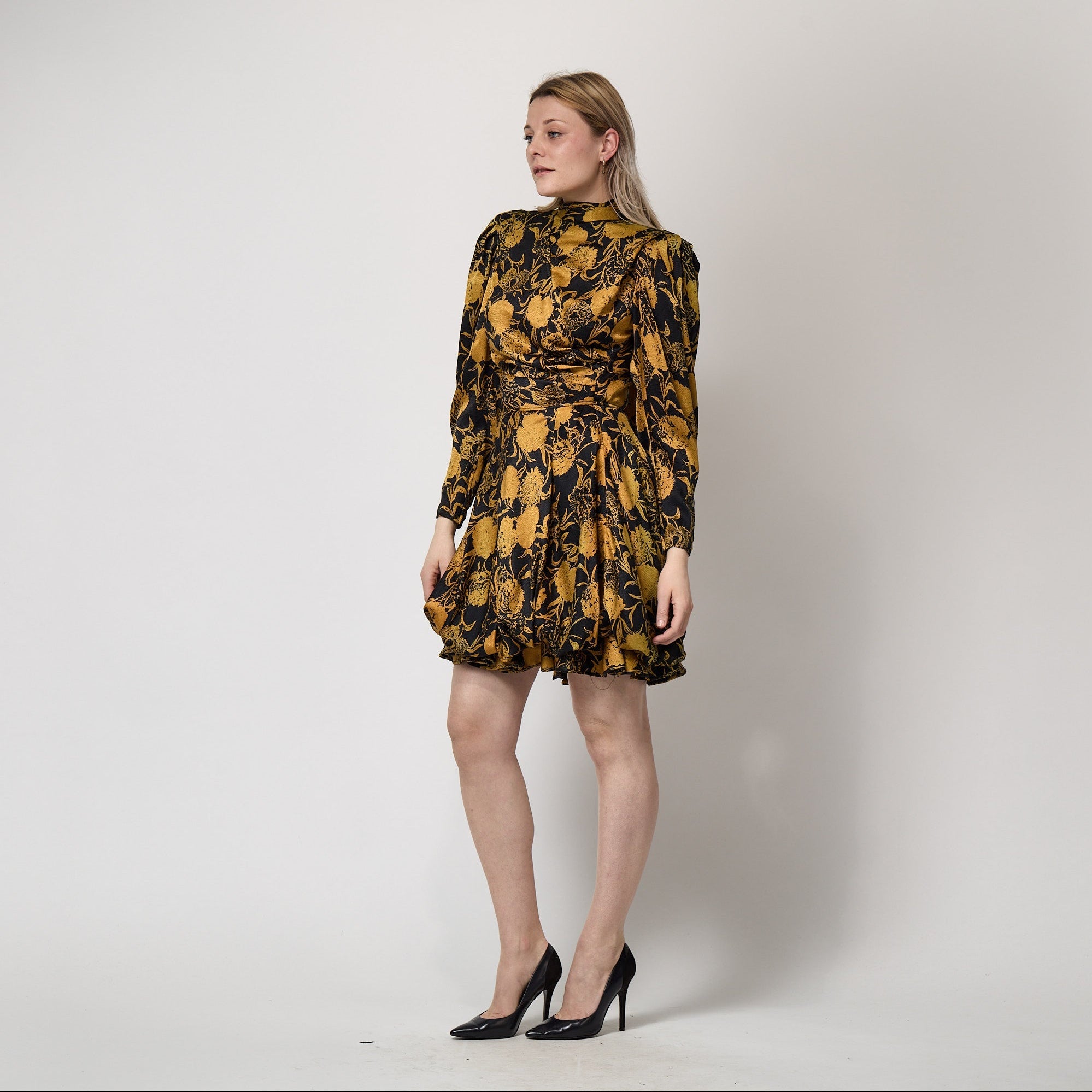 The dress showcases a classic 1980s silhouette in a now very modern and appealing way. Tailored from black silk patterned boldly all-over with painterly gold florals, the cloth is draped flatteringly across the waist. The skirt is cut to a weighty puffball style which dances around the legs as the wearer moves. The sleeves are voluminous at the shoulders and fall to a narrower wrist. There is a scarf at the neck that can be worn in an adaptable manner. It fastens at the back of the neck with a hidden black zip. The dress is fully lined in sheer black crepe.
