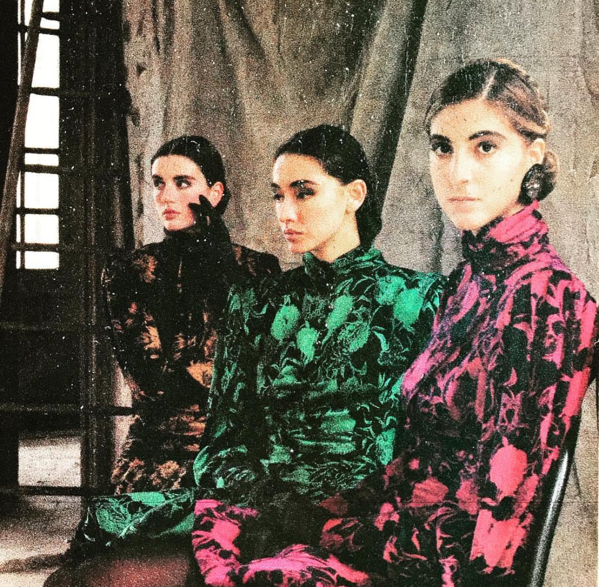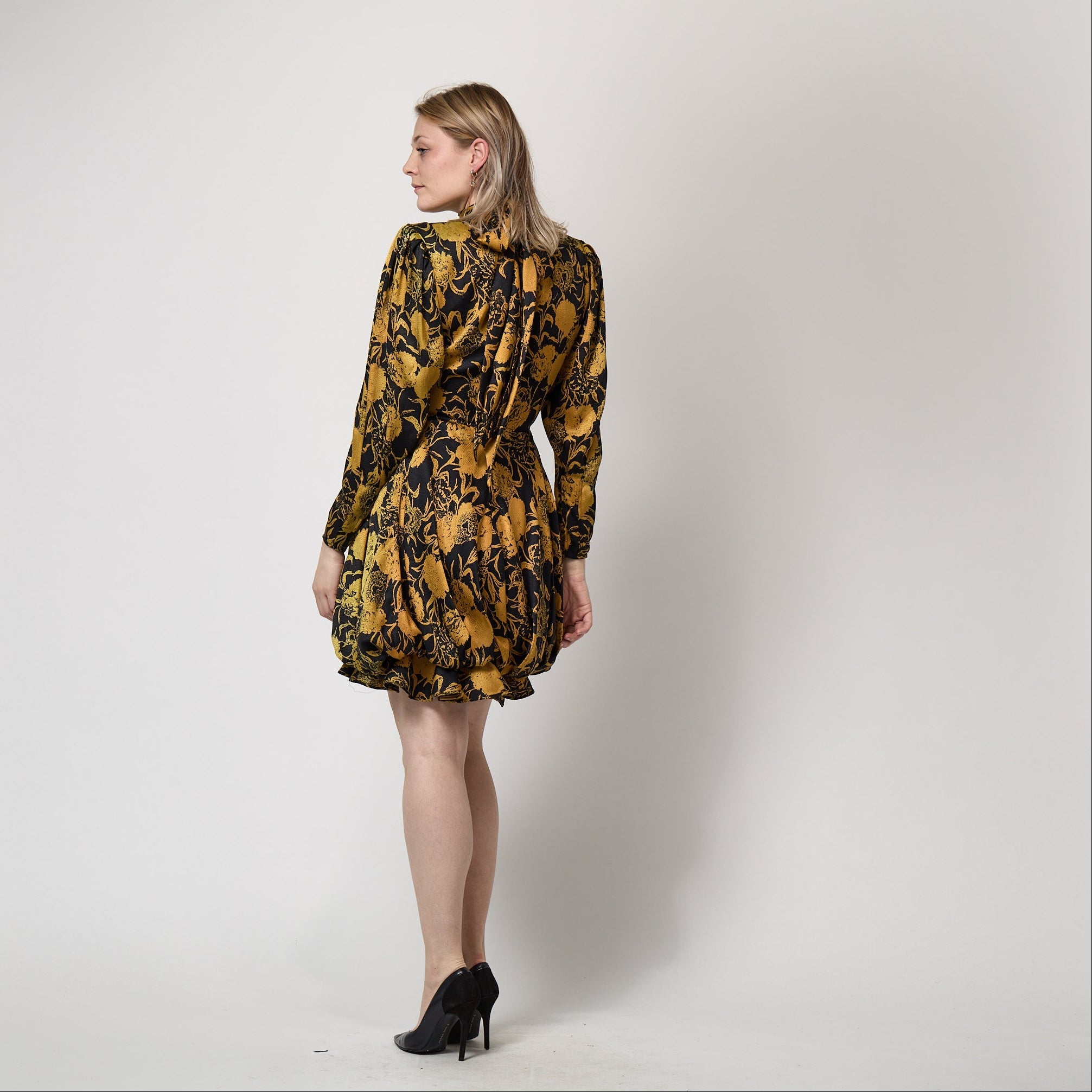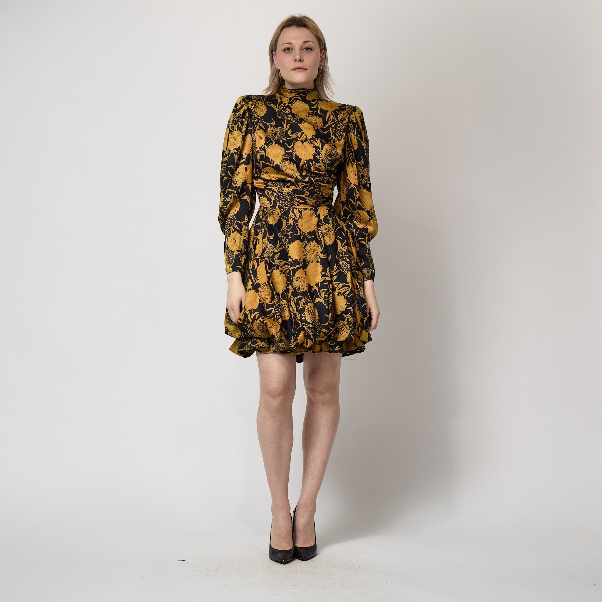 The dress showcases a classic 1980s silhouette in a now very modern and appealing way. Tailored from black silk patterned boldly all-over with painterly gold florals, the cloth is draped flatteringly across the waist. The skirt is cut to a weighty puffball style which dances around the legs as the wearer moves. The sleeves are voluminous at the shoulders and fall to a narrower wrist. There is a scarf at the neck that can be worn in an adaptable manner. It fastens at the back of the neck with a hidden black zip. The dress is fully lined in sheer black crepe.