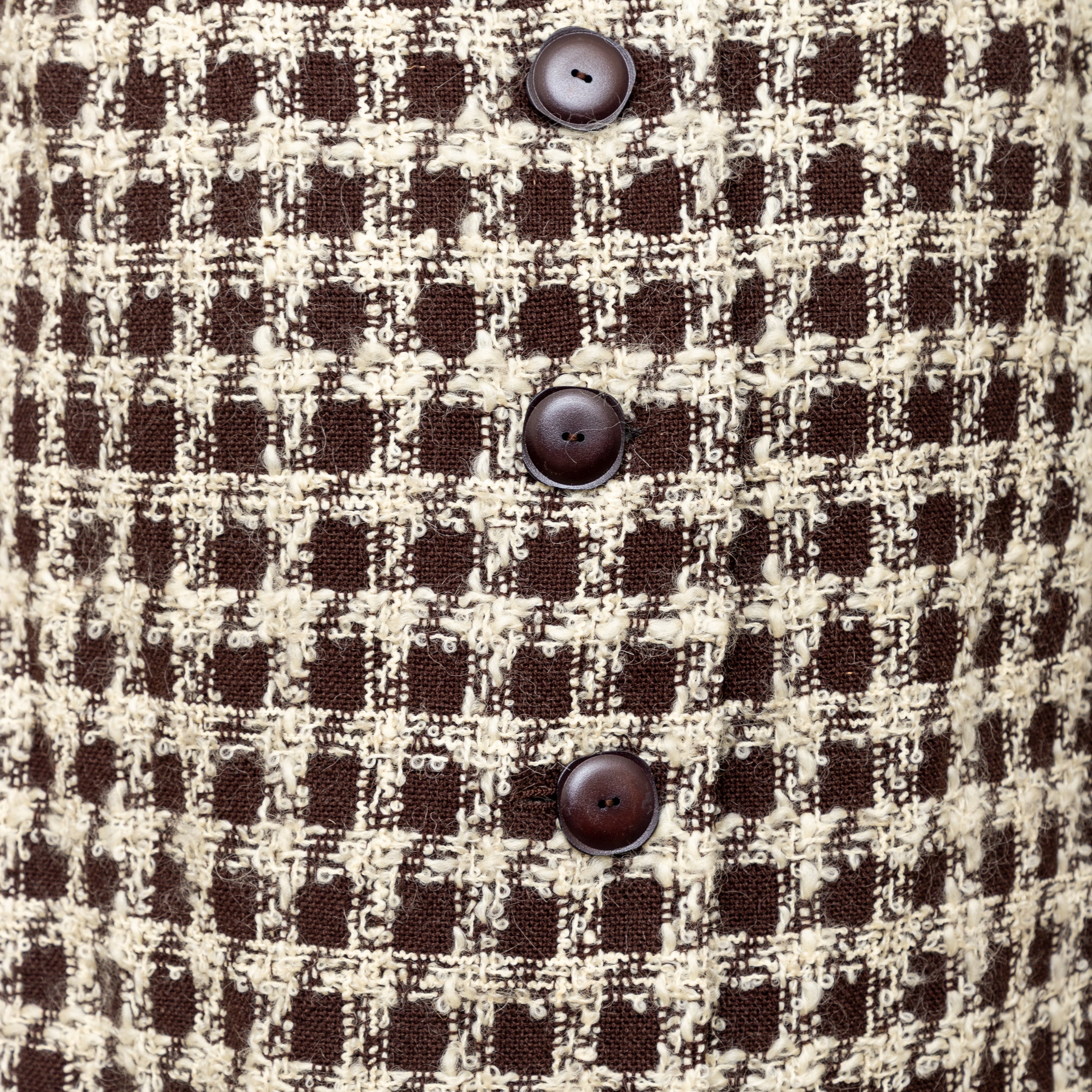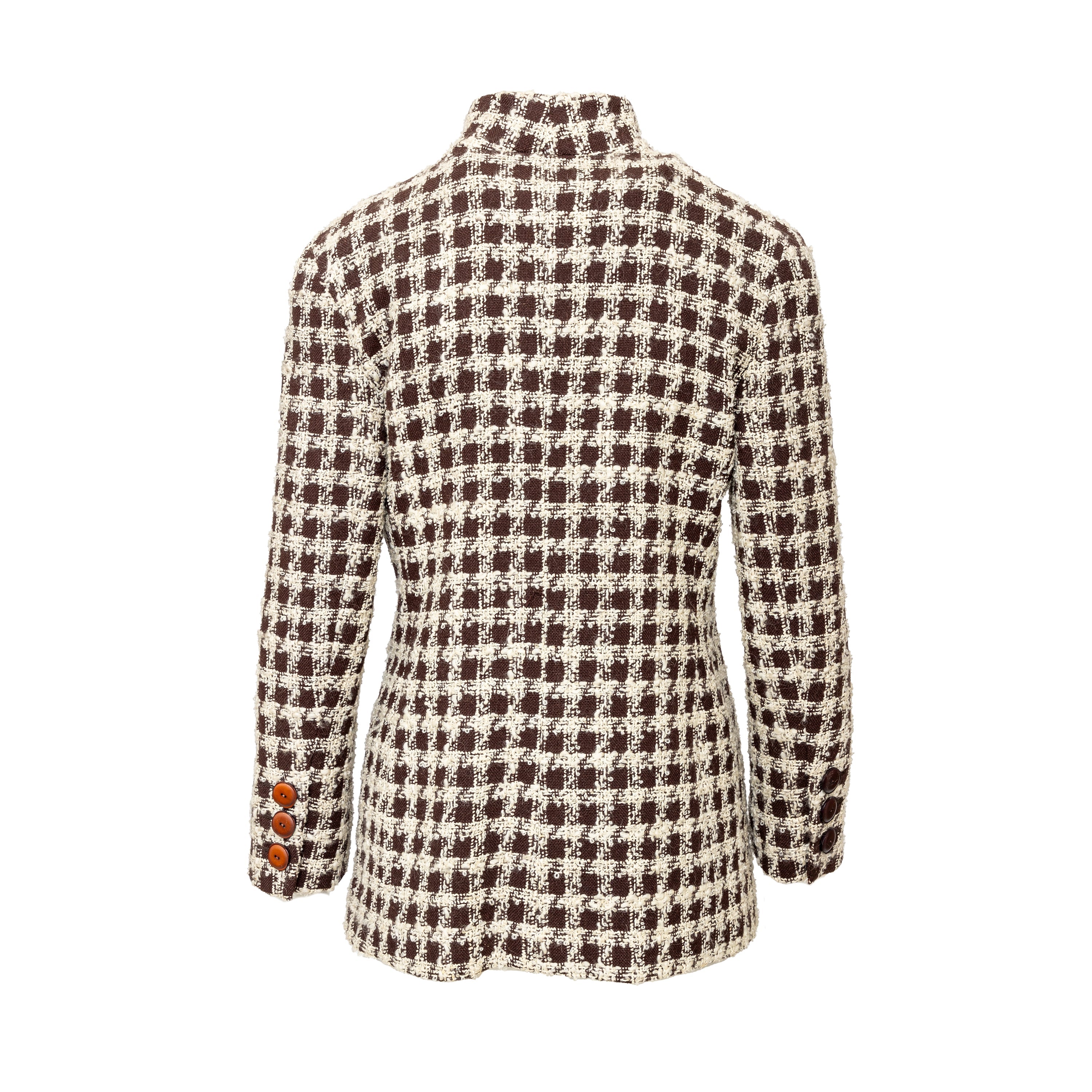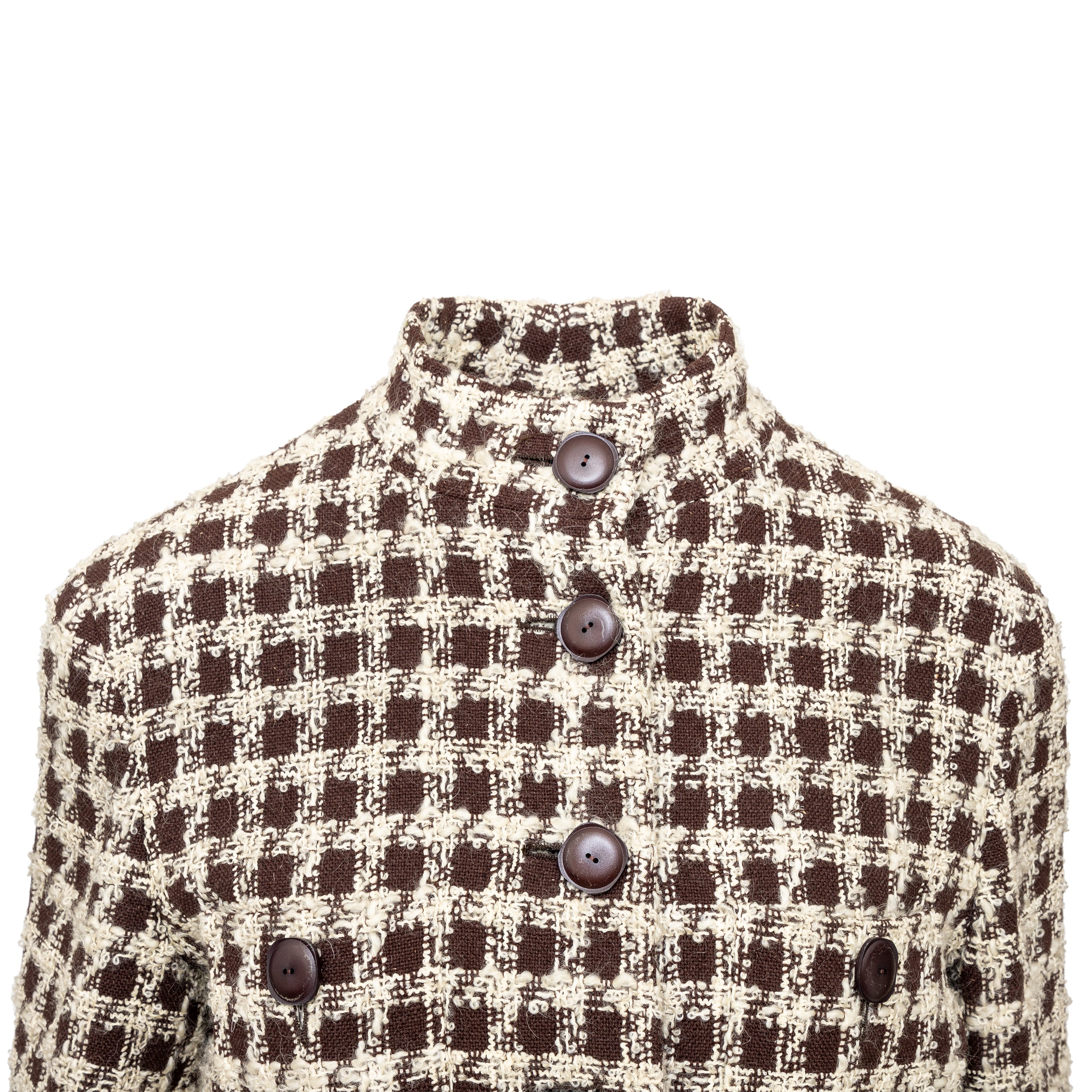 Valentino Boutique Checkered Set from the Fall 1991 collection, featuring white checkered design on brown wool. Includes a long jacket with high neck and buttoned midi skirt.