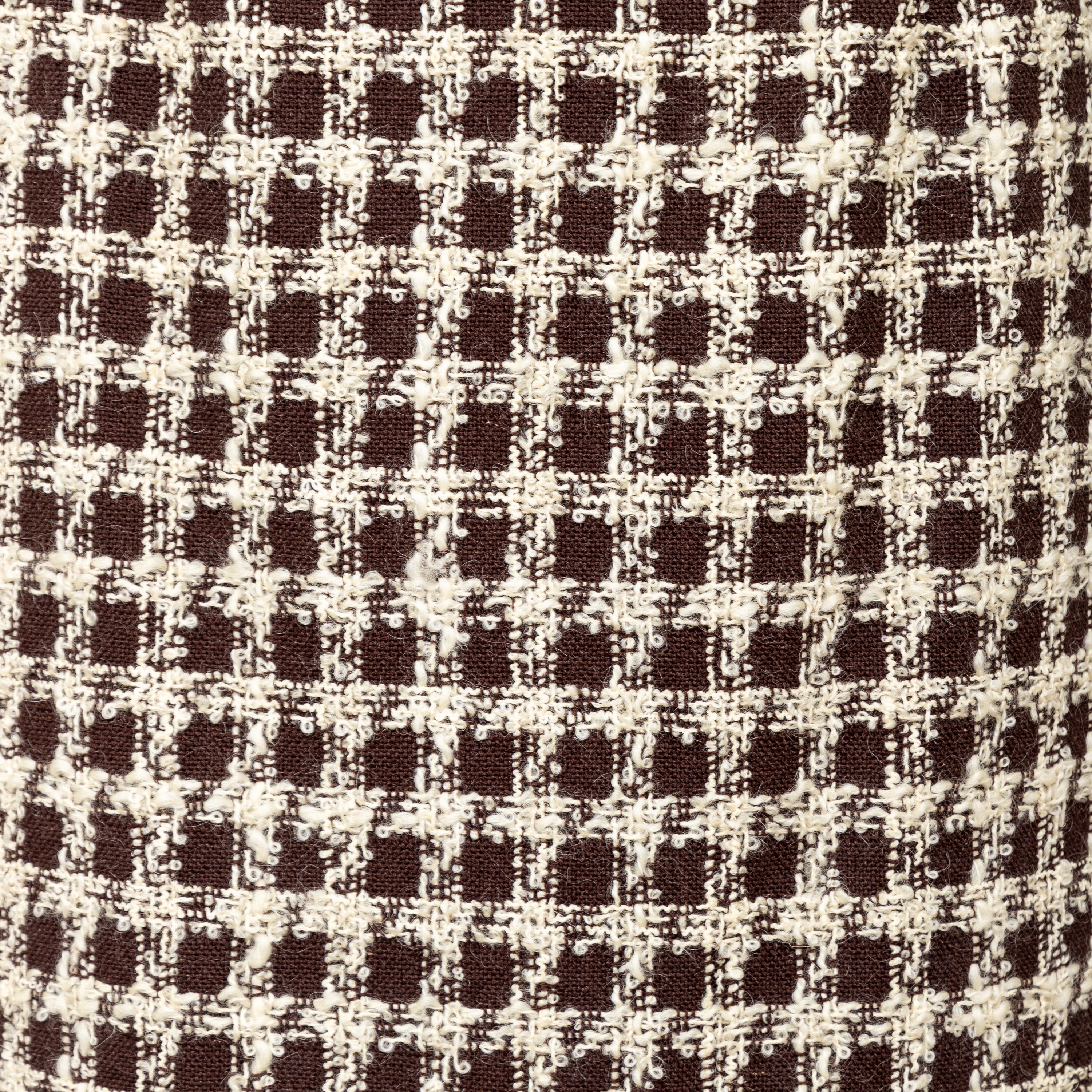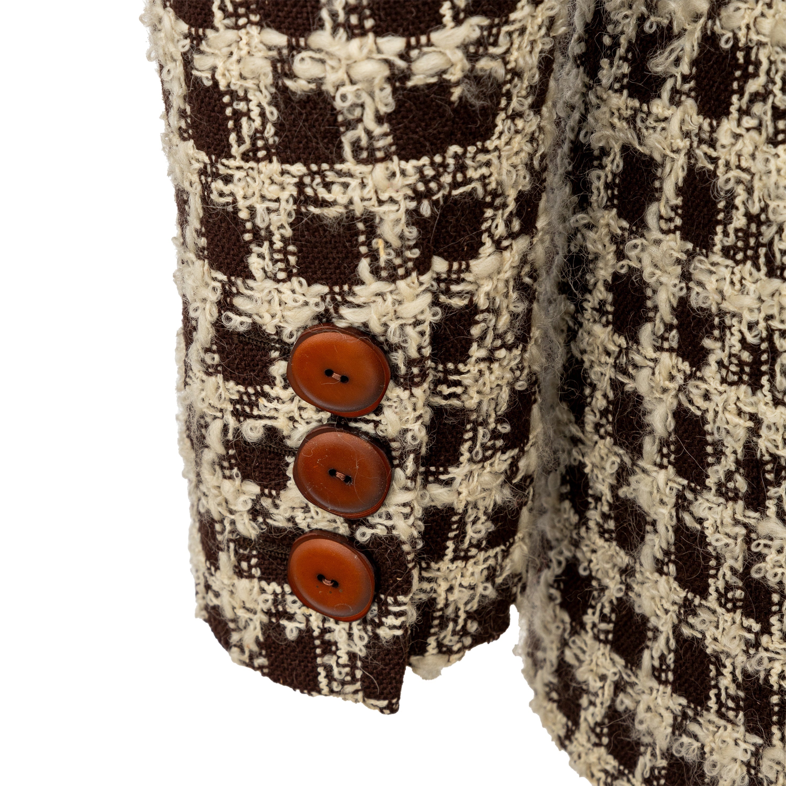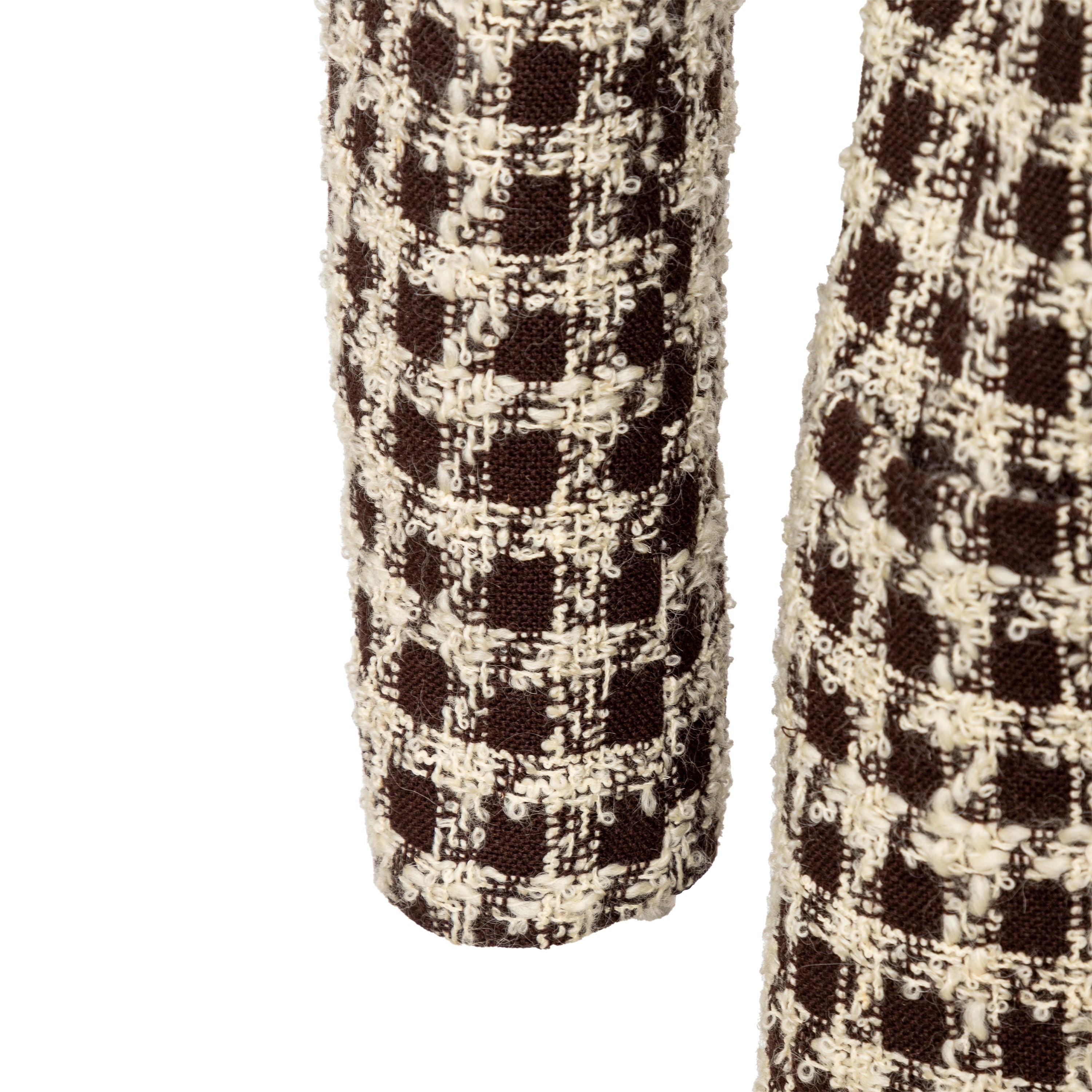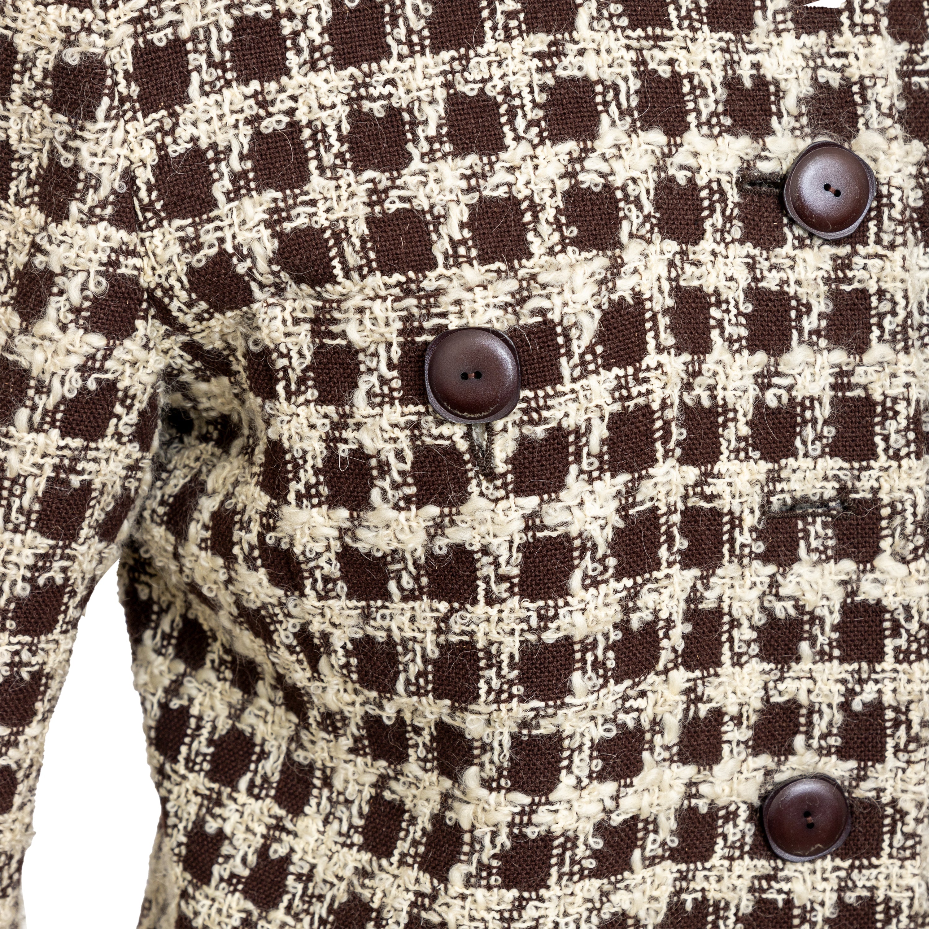 Valentino Boutique Checkered Set from the Fall 1991 collection, featuring white checkered design on brown wool. Includes a long jacket with high neck and buttoned midi skirt.