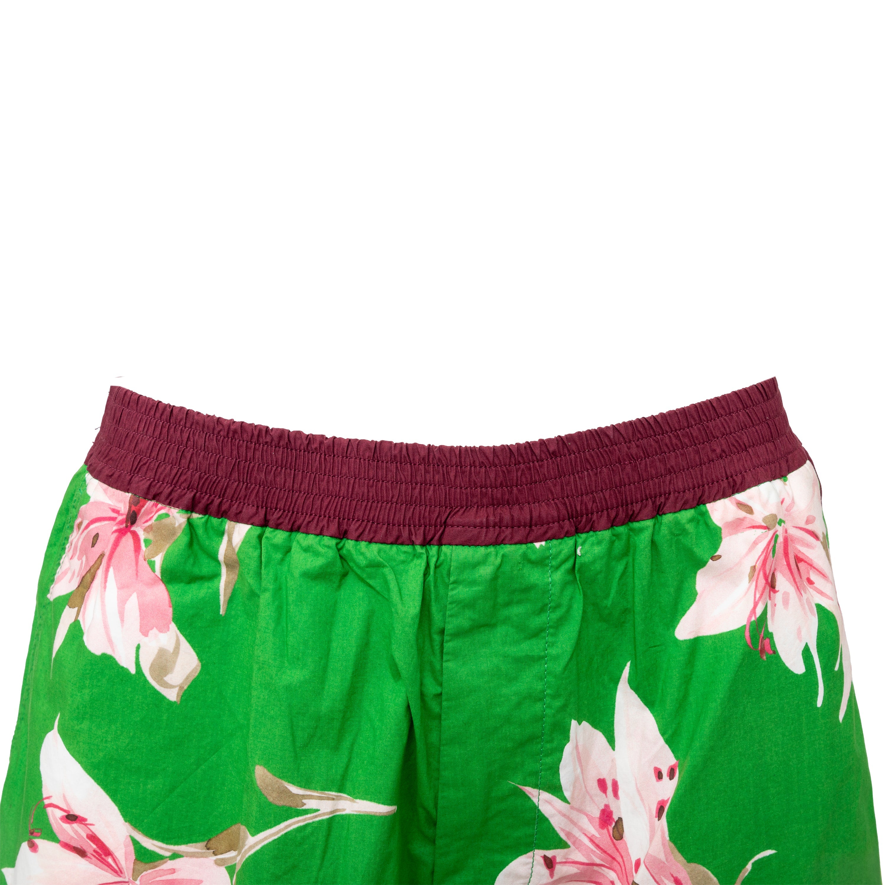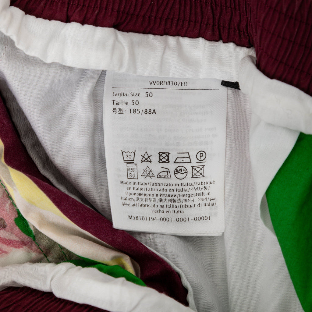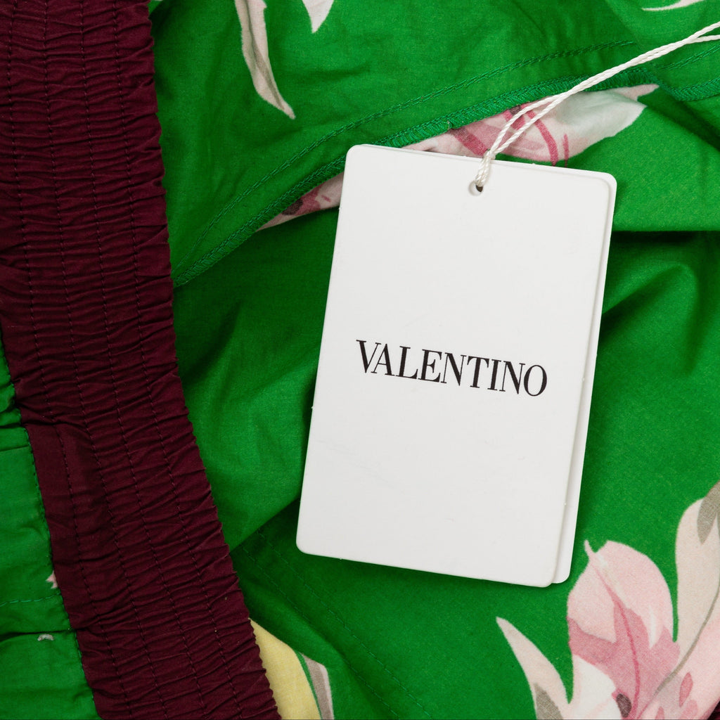 Crafted from 100% cotton, these Valentino Floral Boxer Shorts offer comfort for summer days. The green fabric features a colorful flower print, complemented by dark maroon borders and the brand's logo at the hem. With an adjustable elastic waist and pockets, these shorts offer both convenience and fashion.