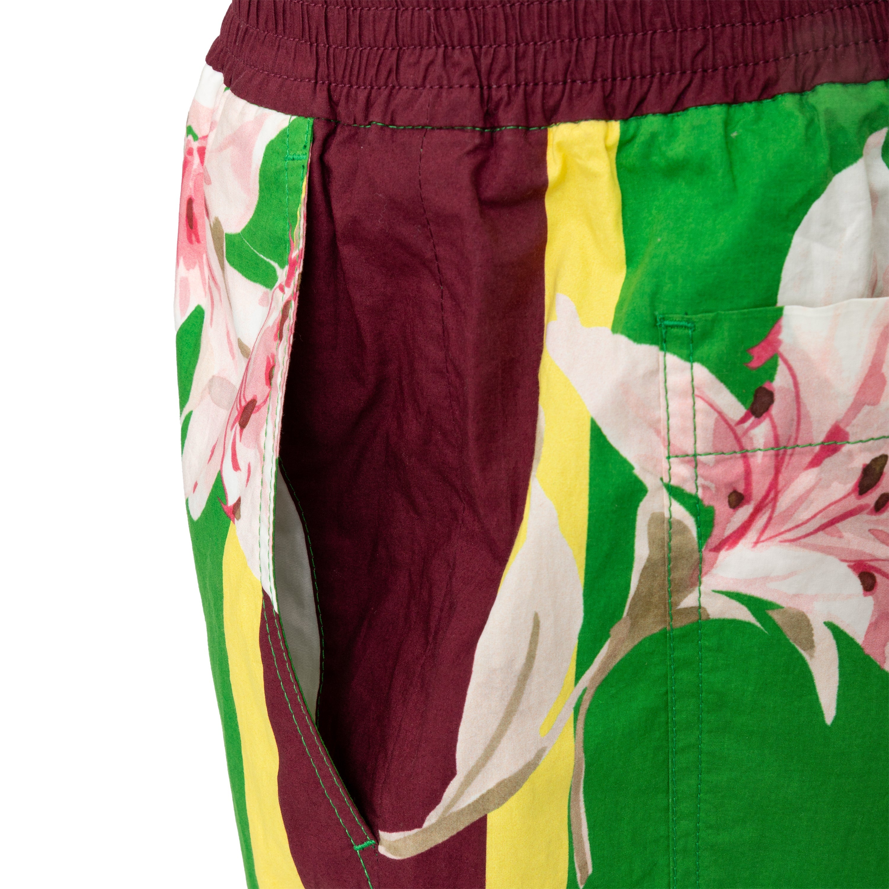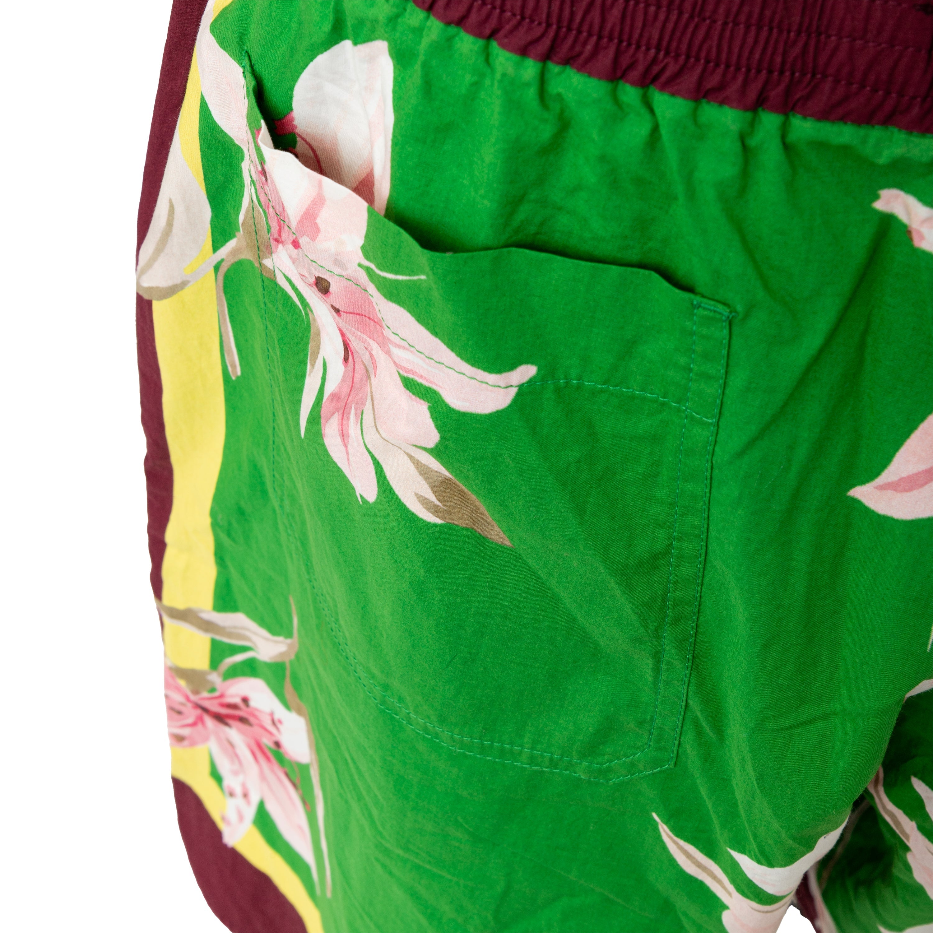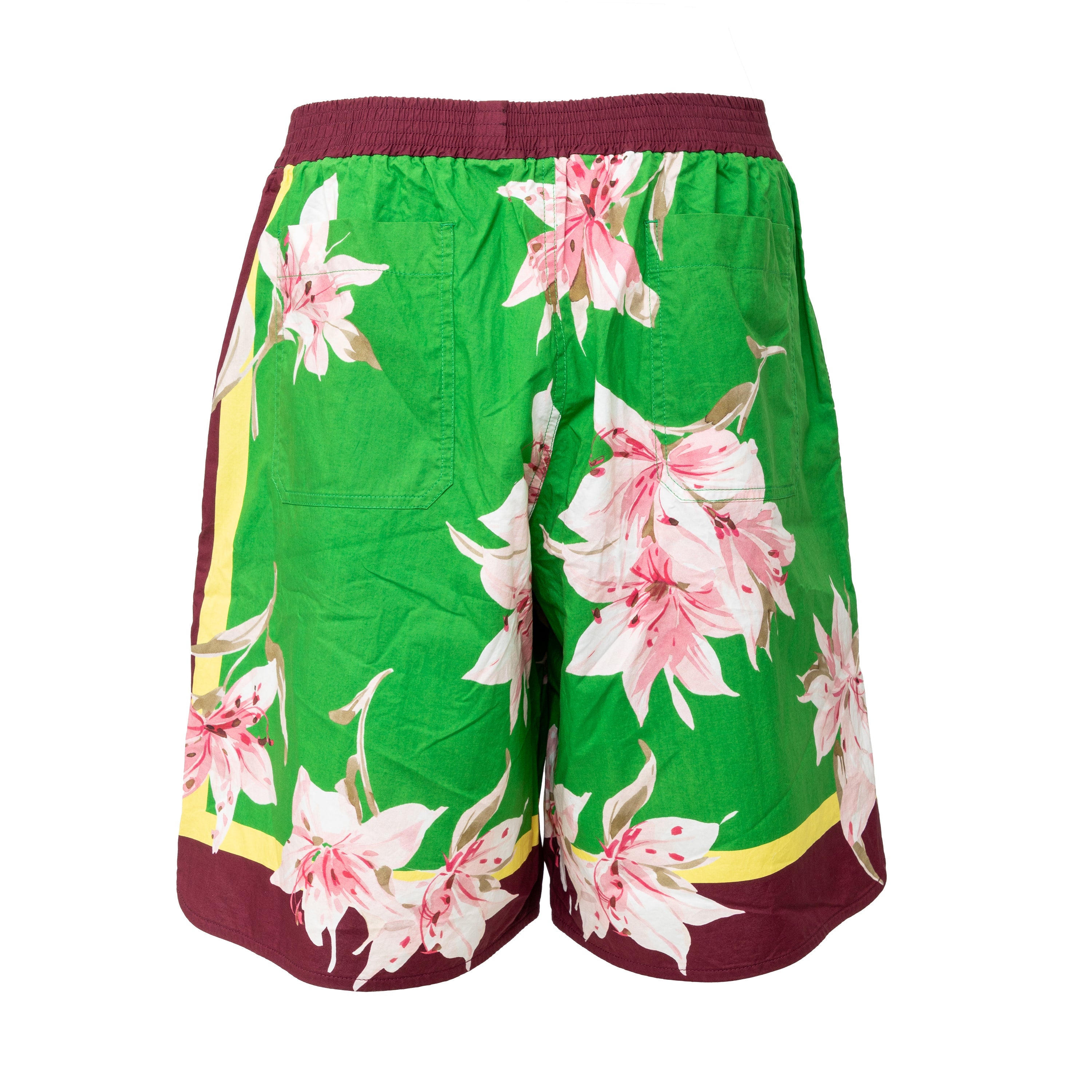 Crafted from 100% cotton, these Valentino Floral Boxer Shorts offer comfort for summer days. The green fabric features a colorful flower print, complemented by dark maroon borders and the brand's logo at the hem. With an adjustable elastic waist and pockets, these shorts offer both convenience and fashion.