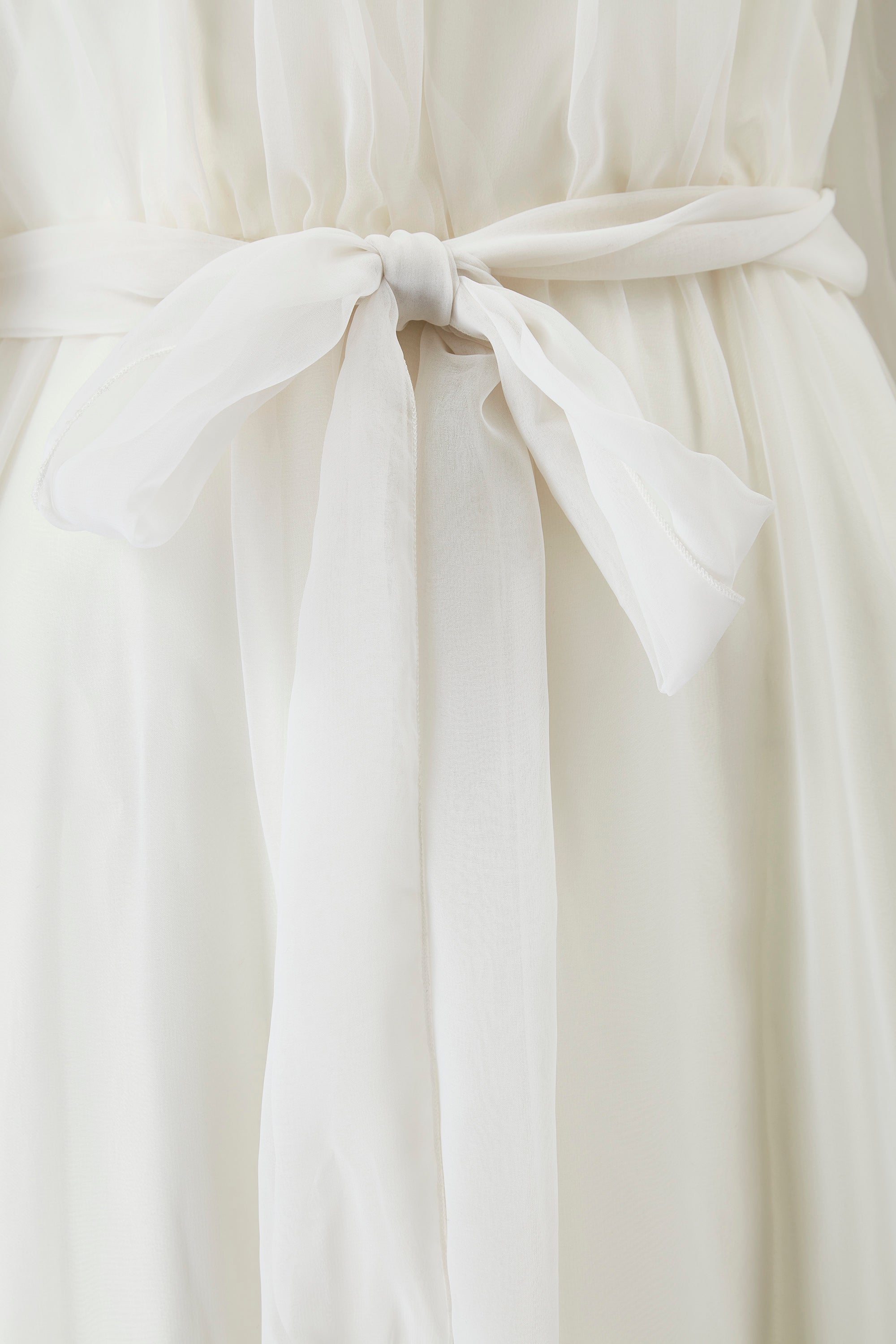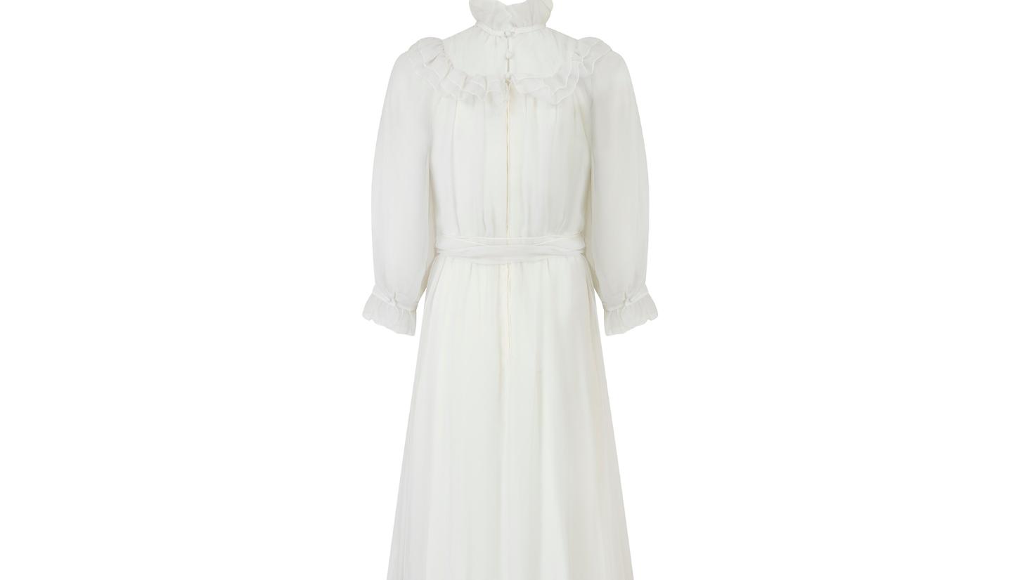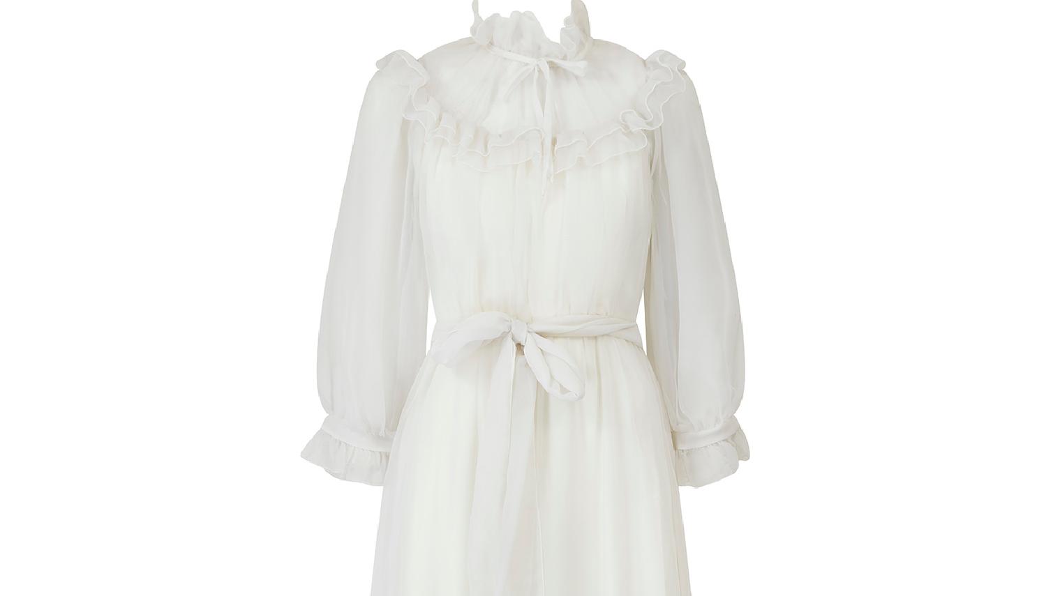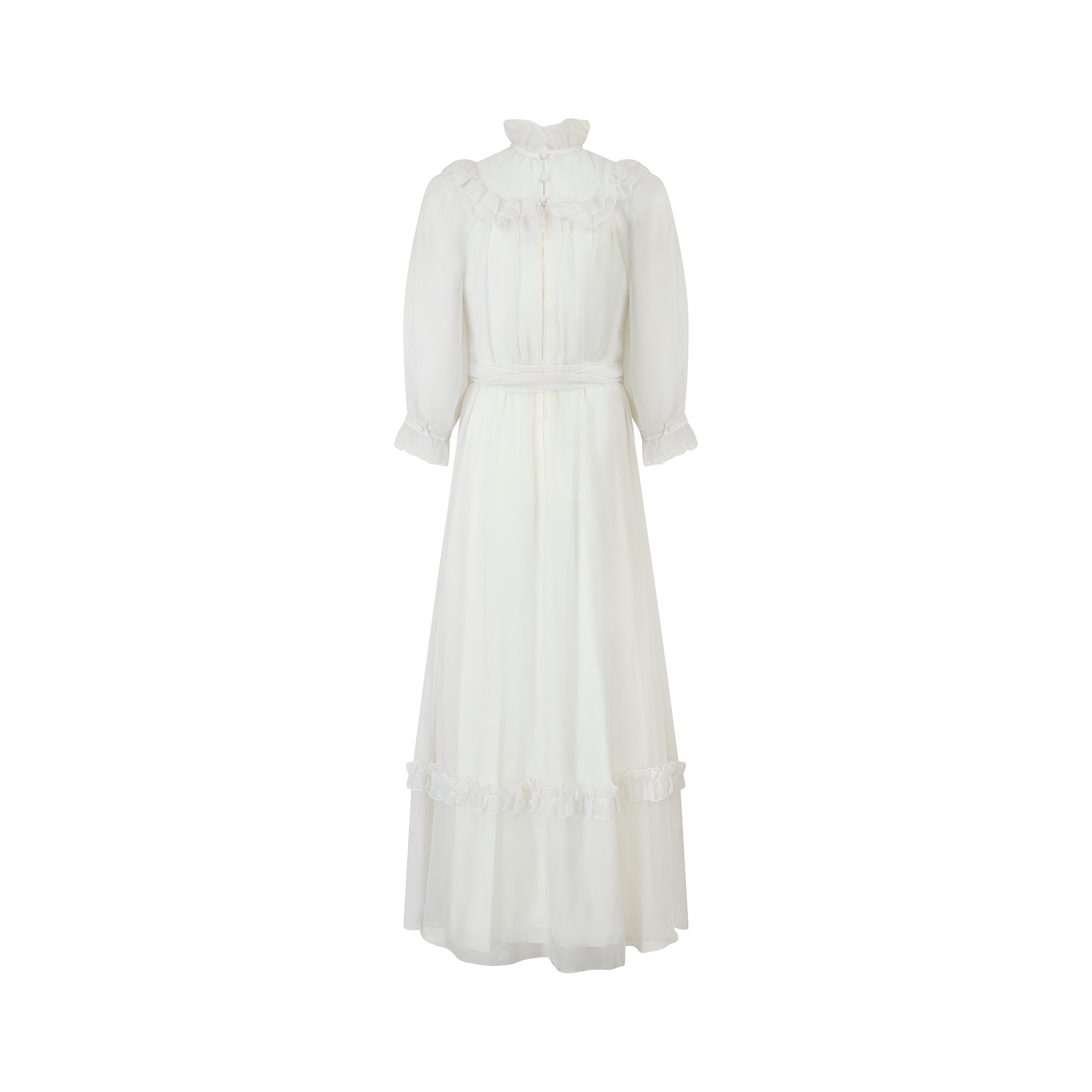 The dress has a high ruffle neckline and the decolletage is trimmed with a double row of ruffles. It has long gathered sleeves with a buttoned cuff and elasticated waistline. Its floor length, full skirt is separated with a ruffled flounce toward the bottom hem. Fastening at the back with the original zipper; thread loops to the sides hold a long sash belt which can be wrapped around several times. It has three fabric covered buttons closing the top of the neckline. The bodice is lined whilst the sleeves and neckline have been left sheer. Such is the quality of the dress, there is a double acetate lining on the skirt portion which gives a real feeling of fullness.