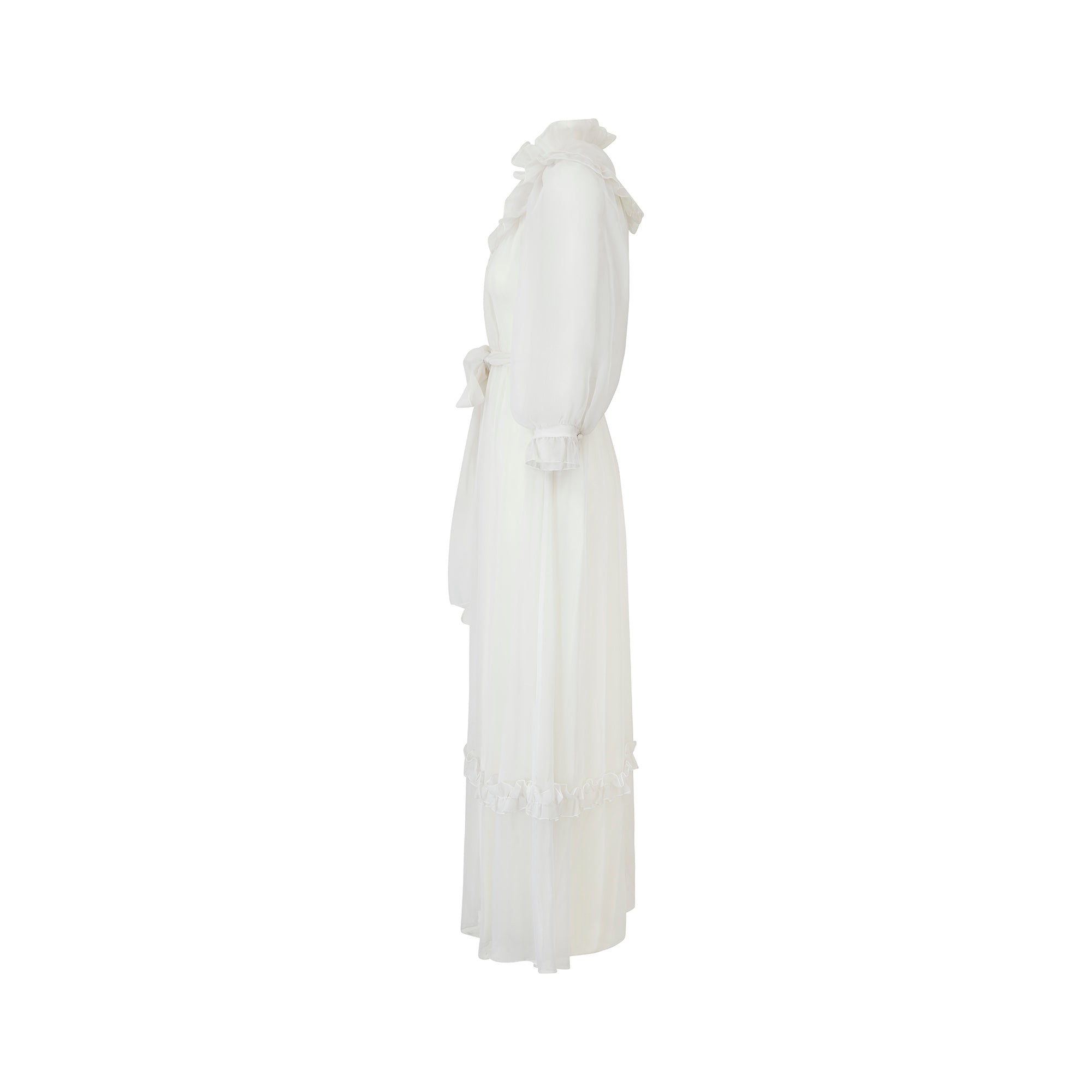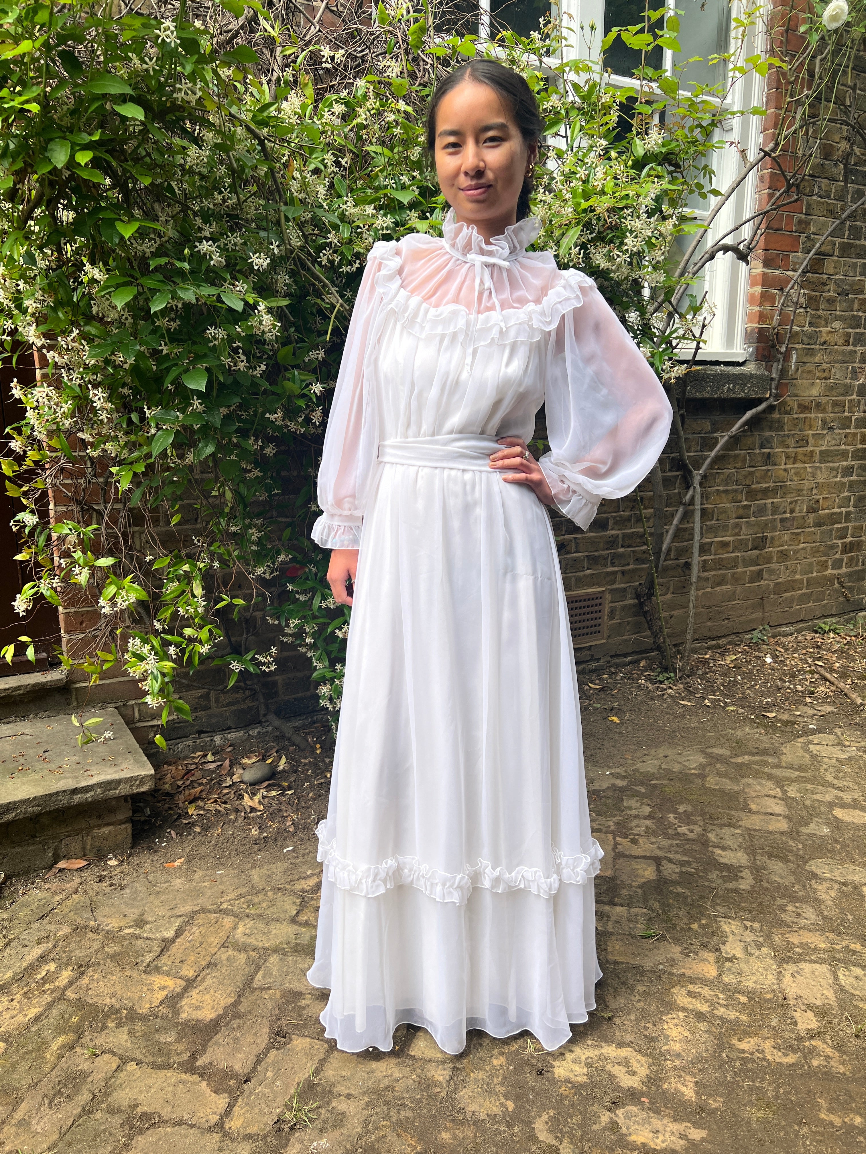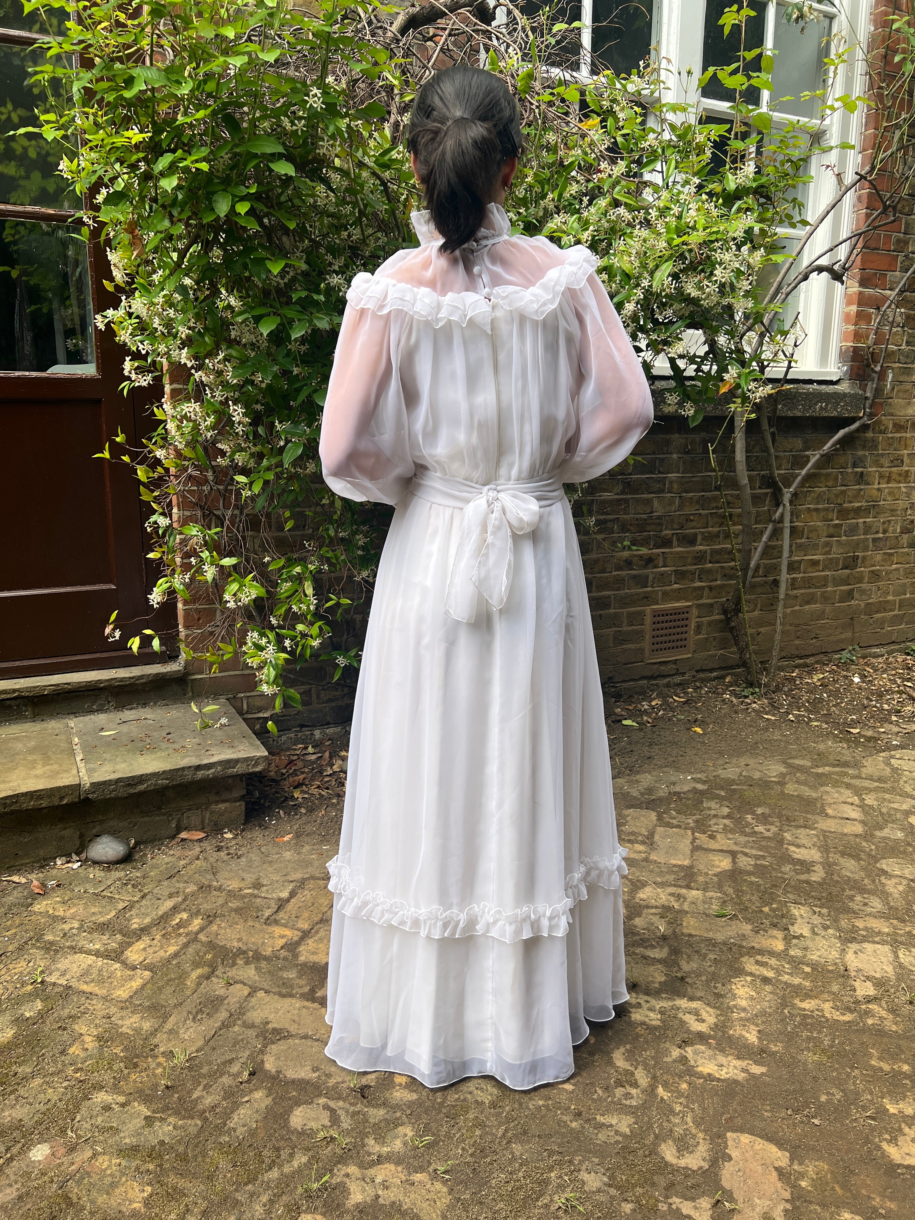 This romantic georgette bridal dress is by high-end occasion designer Vera Mont. We've had several early pieces by this designer over the years and they never fail to disappoint, they're always really well made with quality fabrics and attention to detail in the design. This is a very typical mid to late 1970s bohemian design and is loosely based on Edwardian wedding dresses which came to define this period of romanticism within fashion.