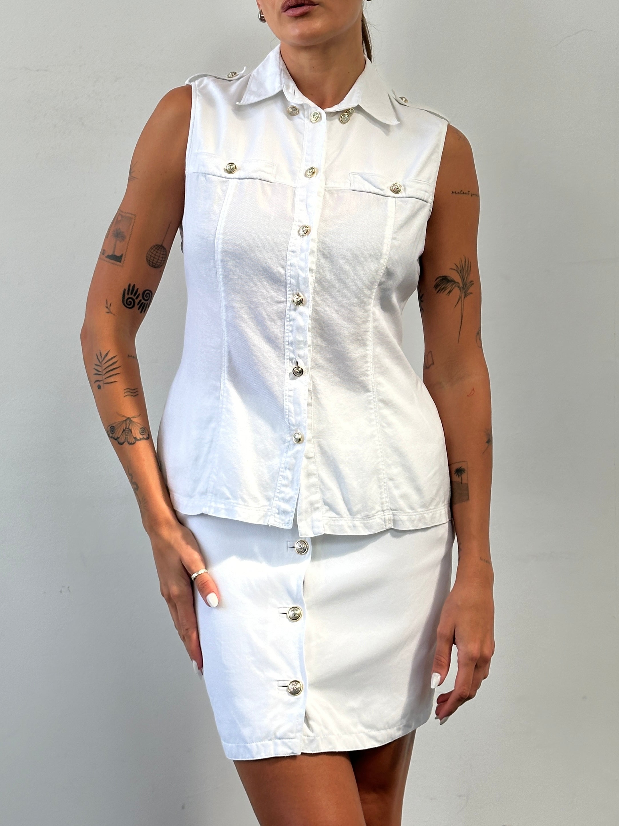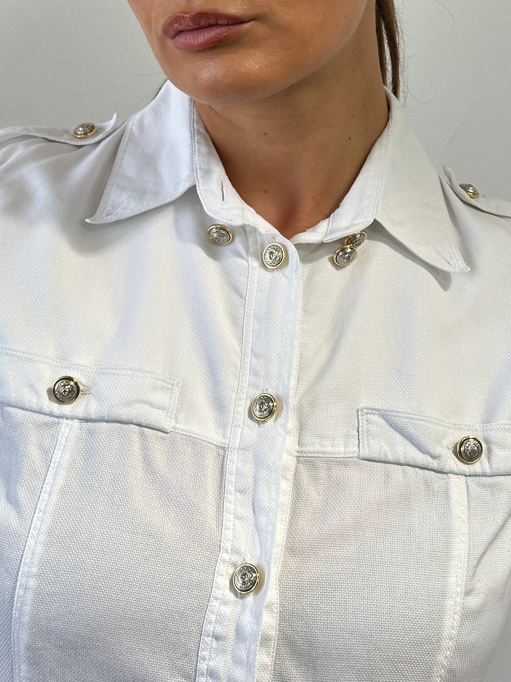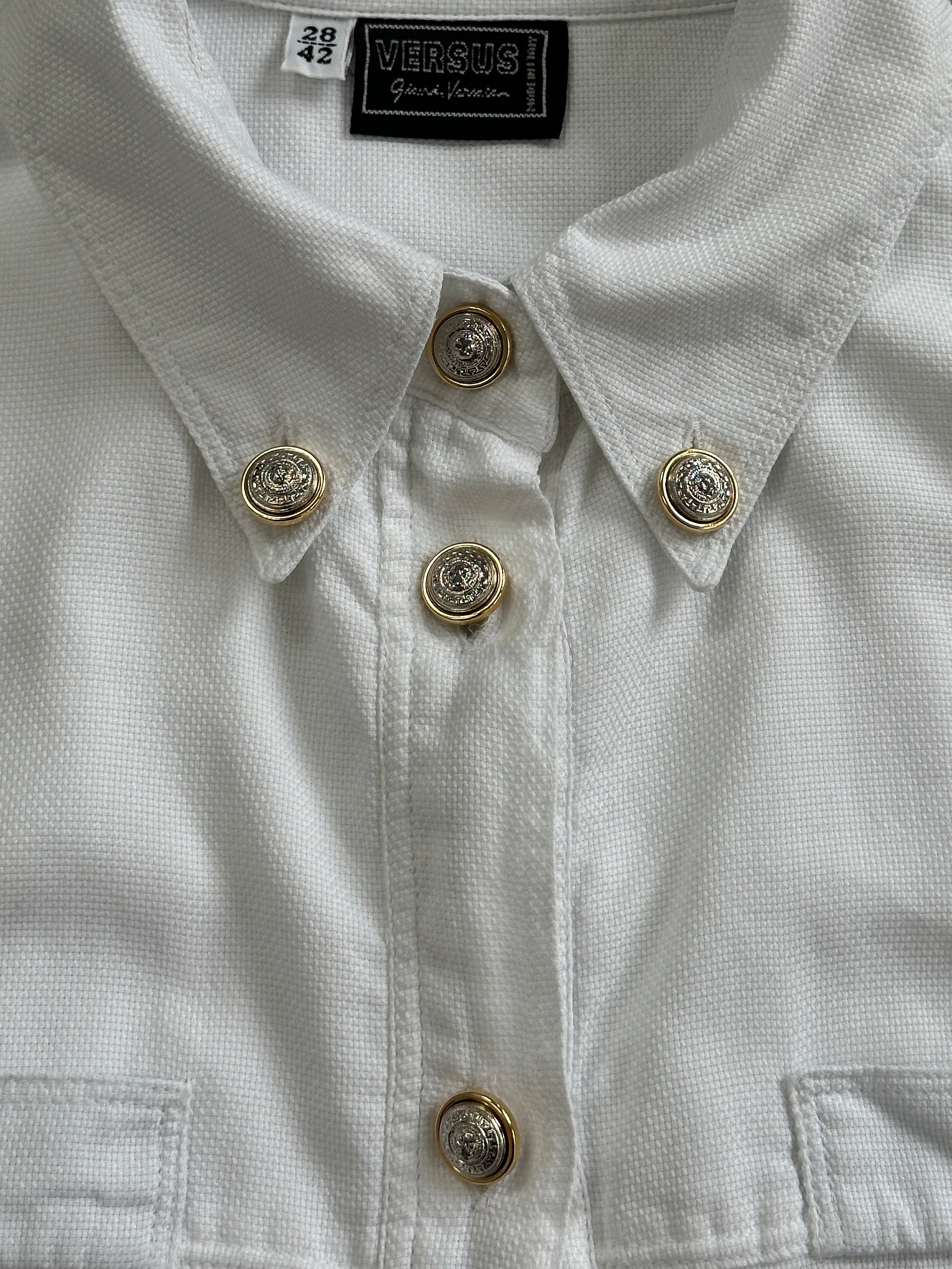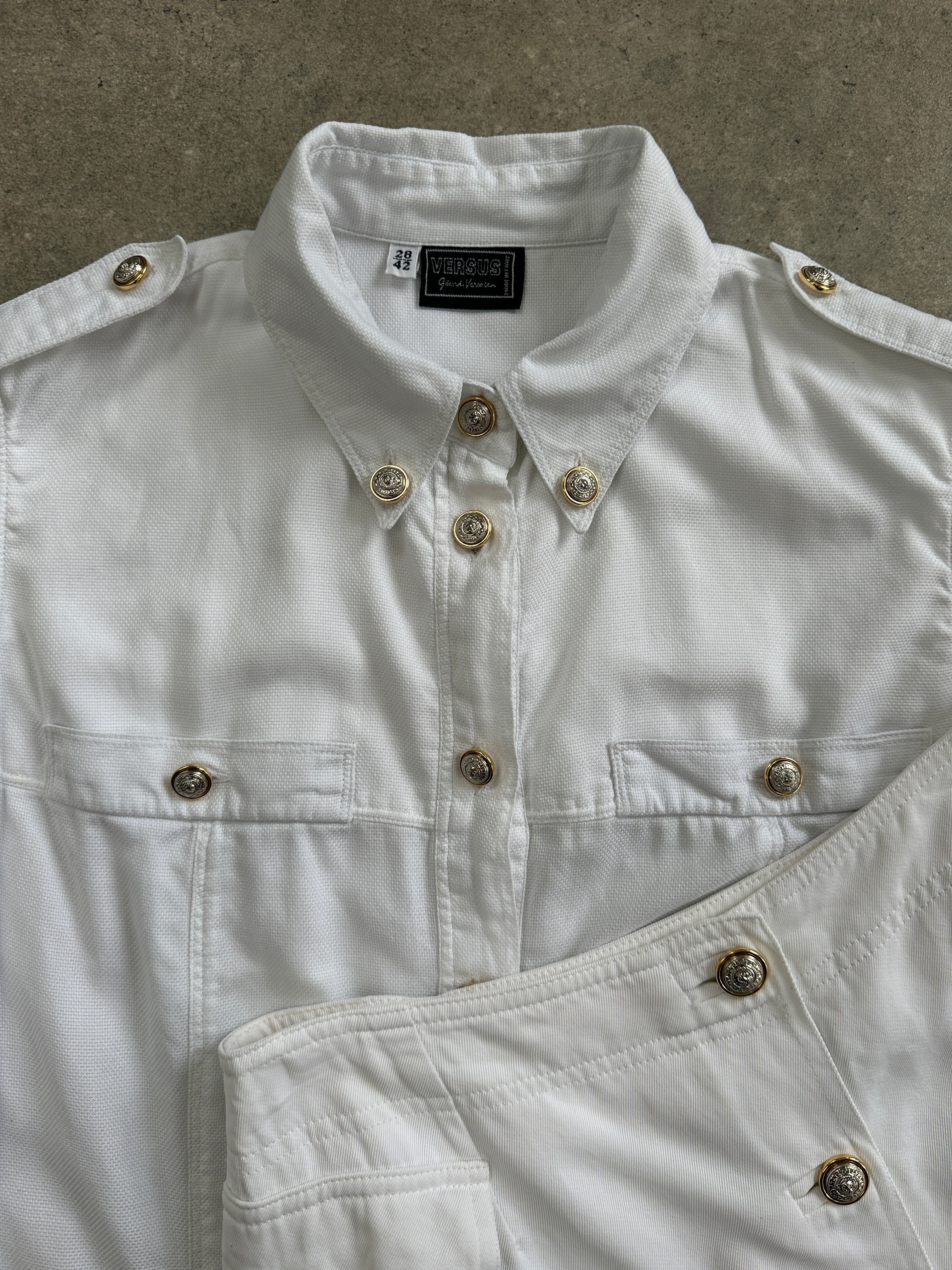 Versus by Gianni Versace 90s two-piece in crisp white cotton, detailed with gold Medusa buttons.