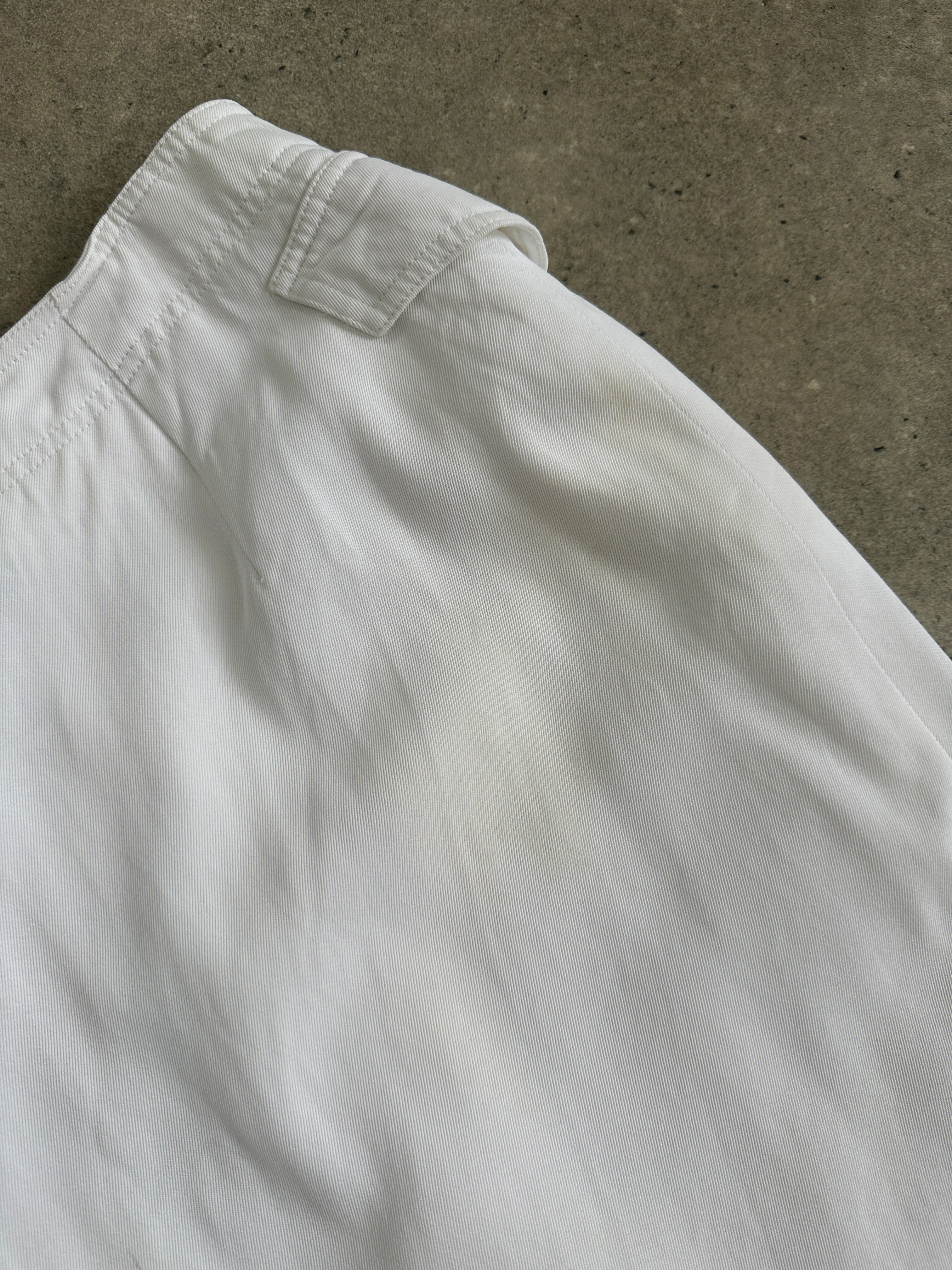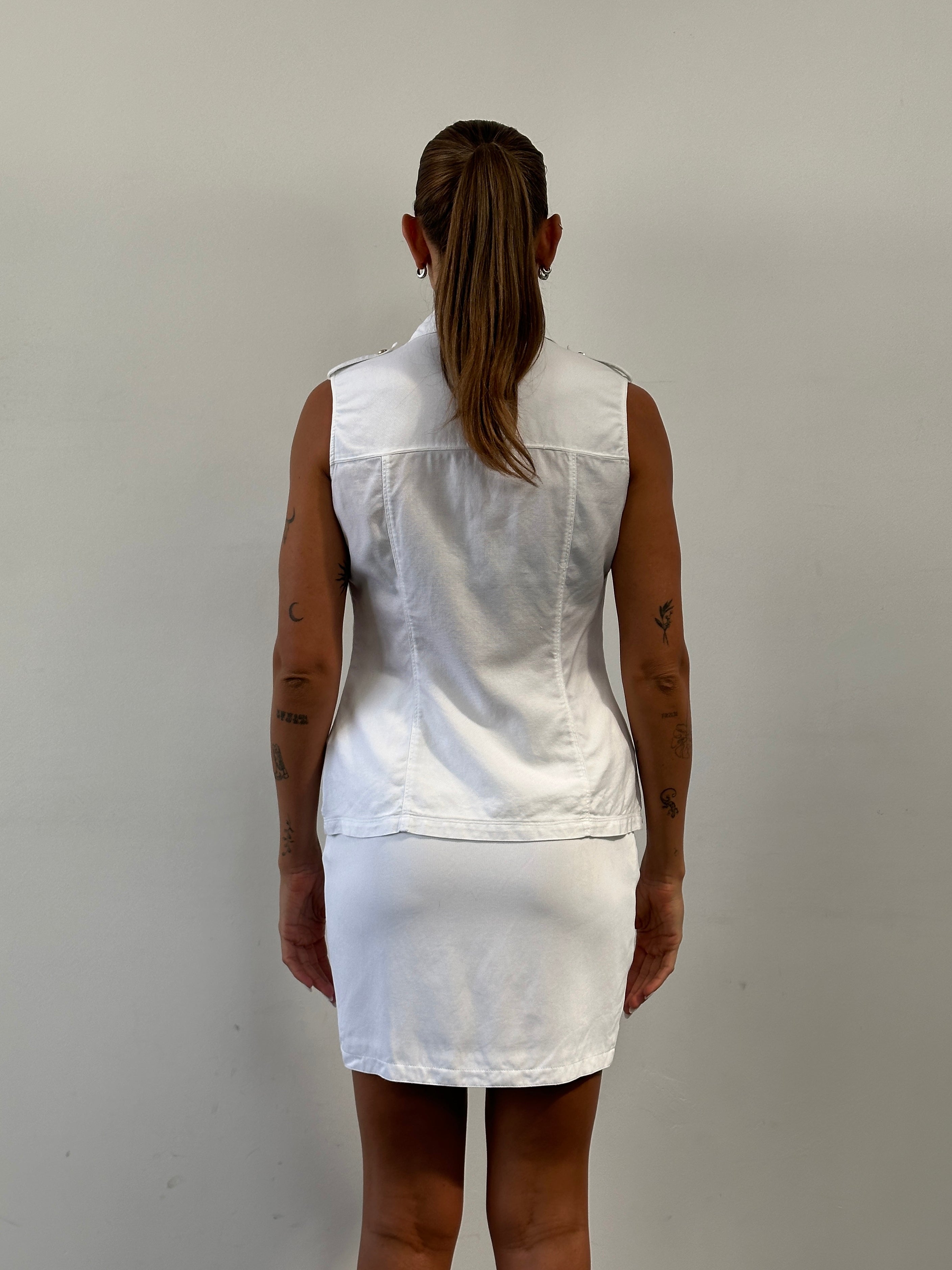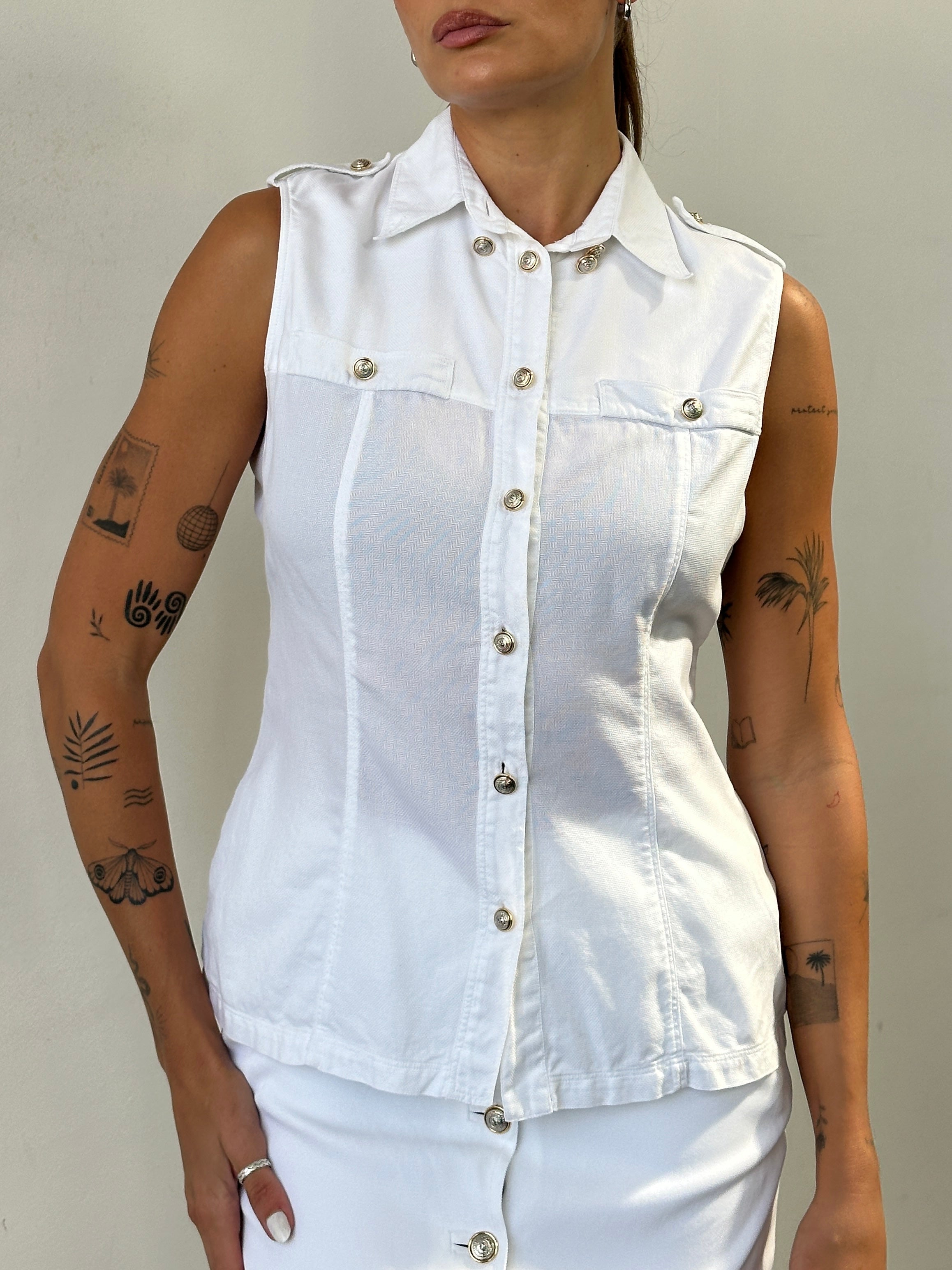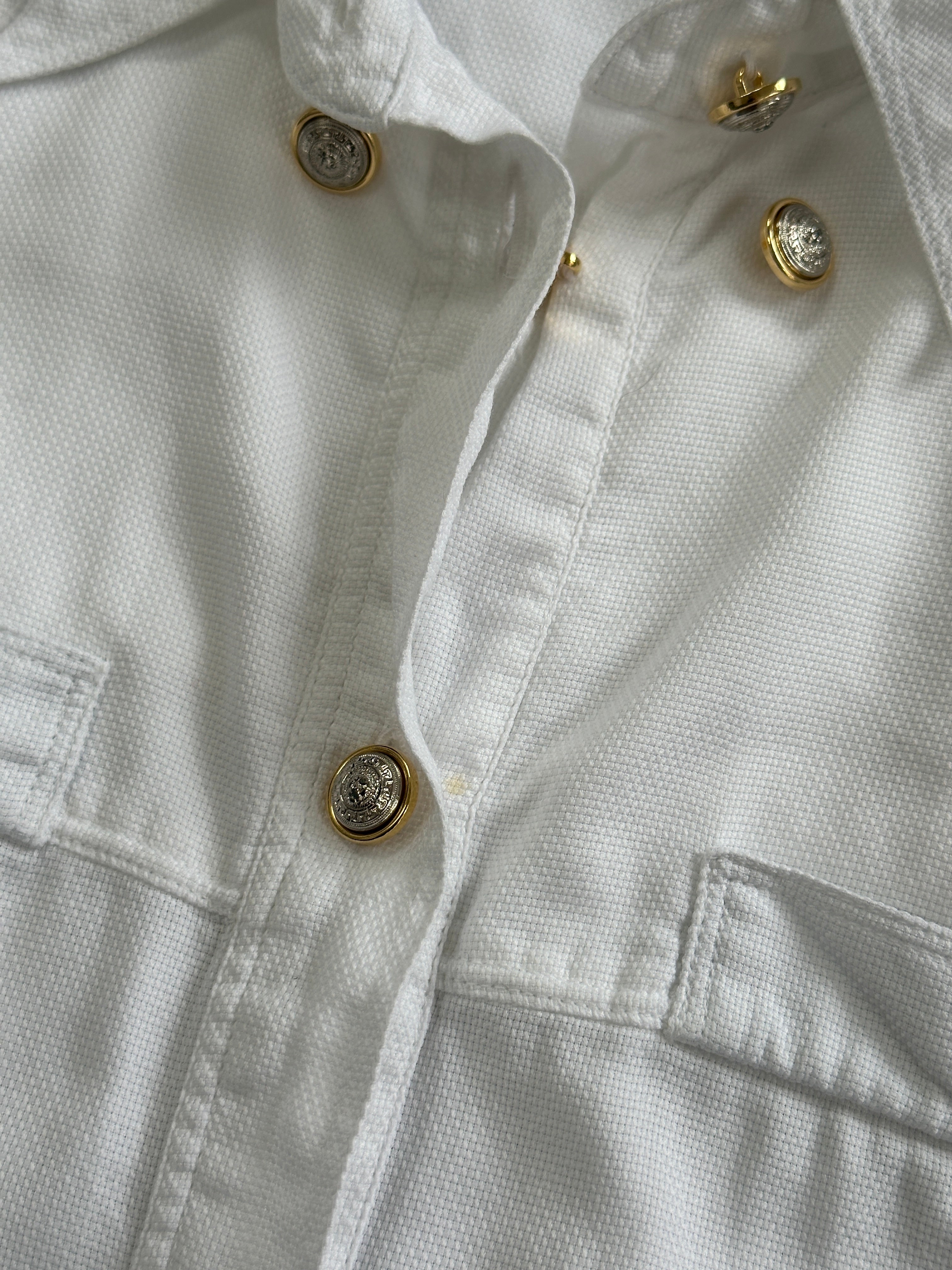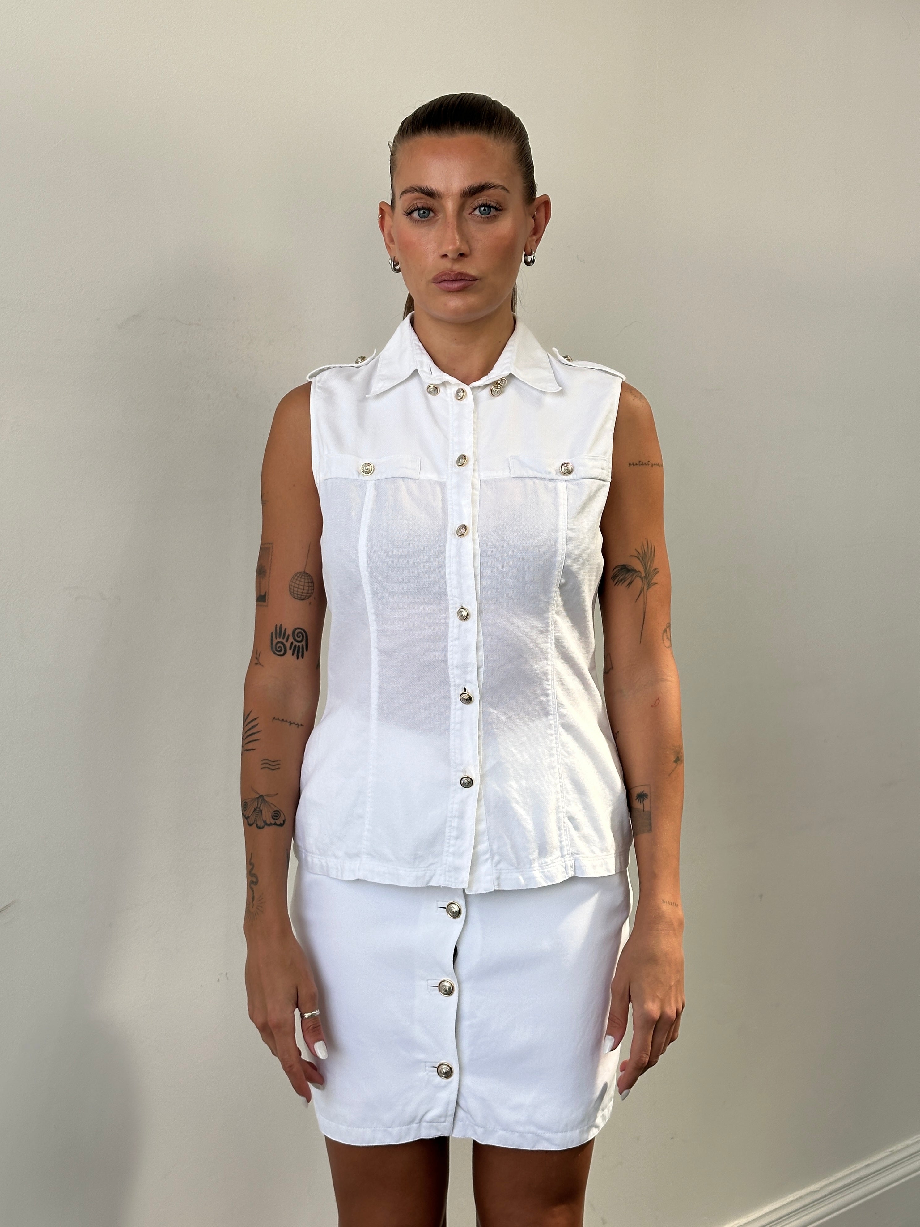 Versus by Gianni Versace 90s two-piece in crisp white cotton, detailed with gold Medusa buttons.