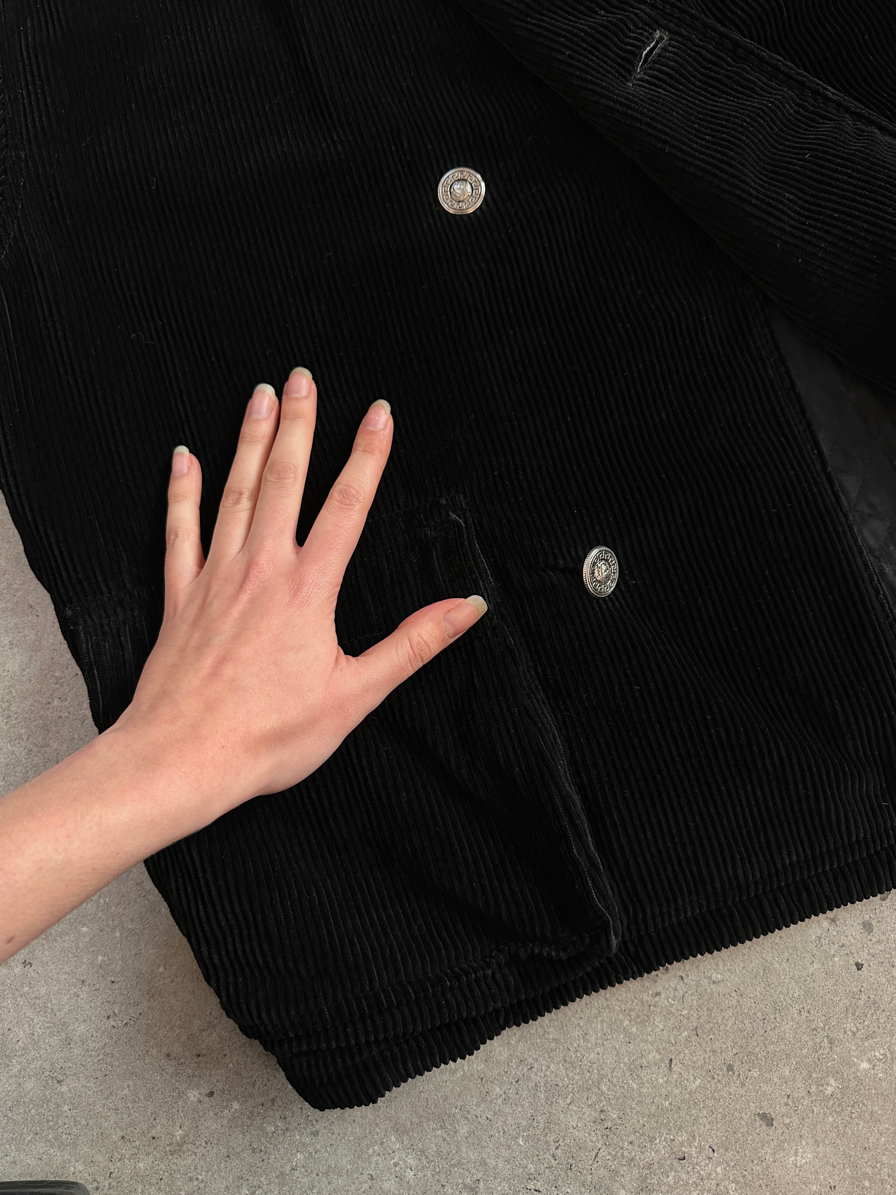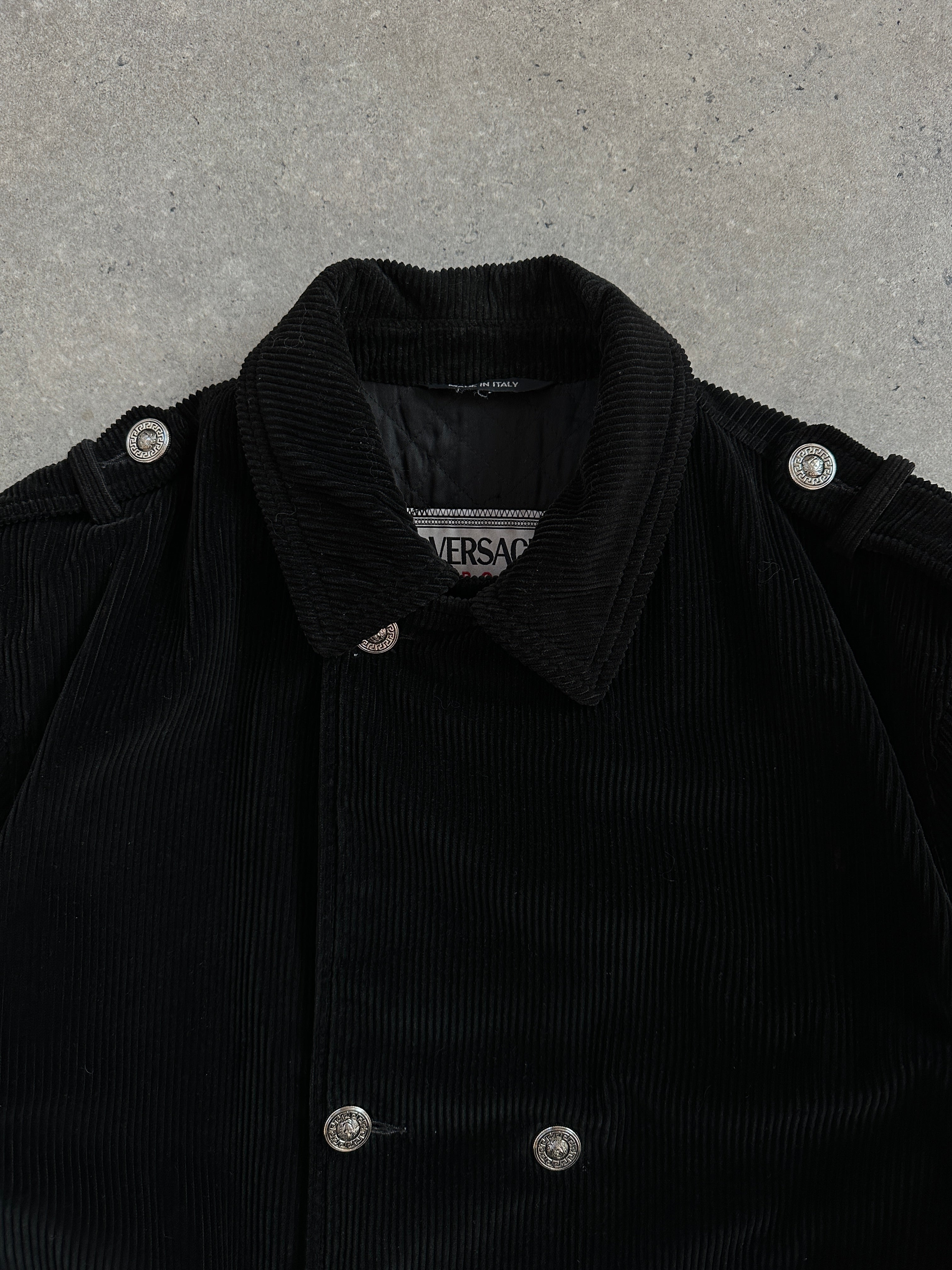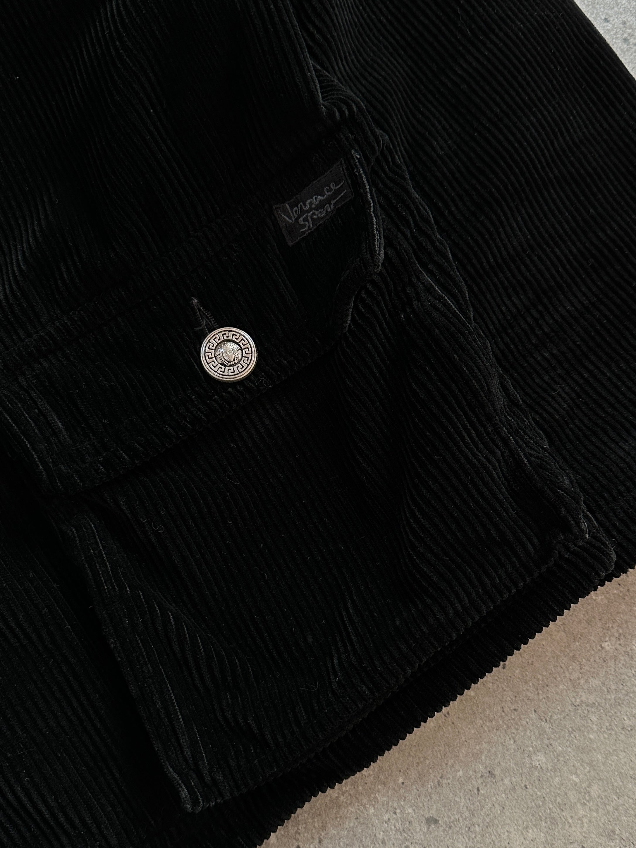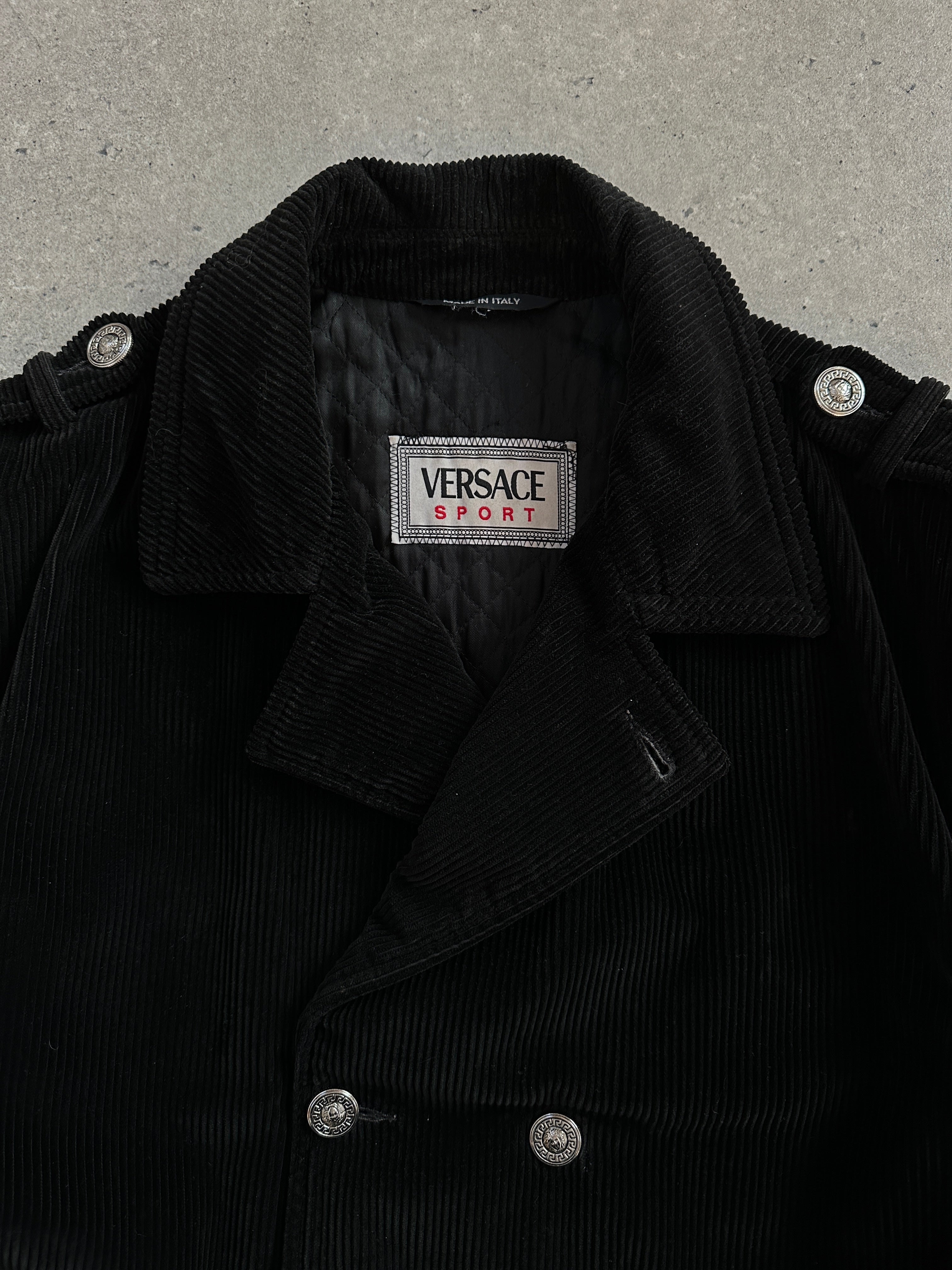 Vintage 1990s Versace Sport double breasted jacket in deep black corduroy. A structured yet relaxed silhouette with utilitarian detailing and signature bespoke Medusa buttons.