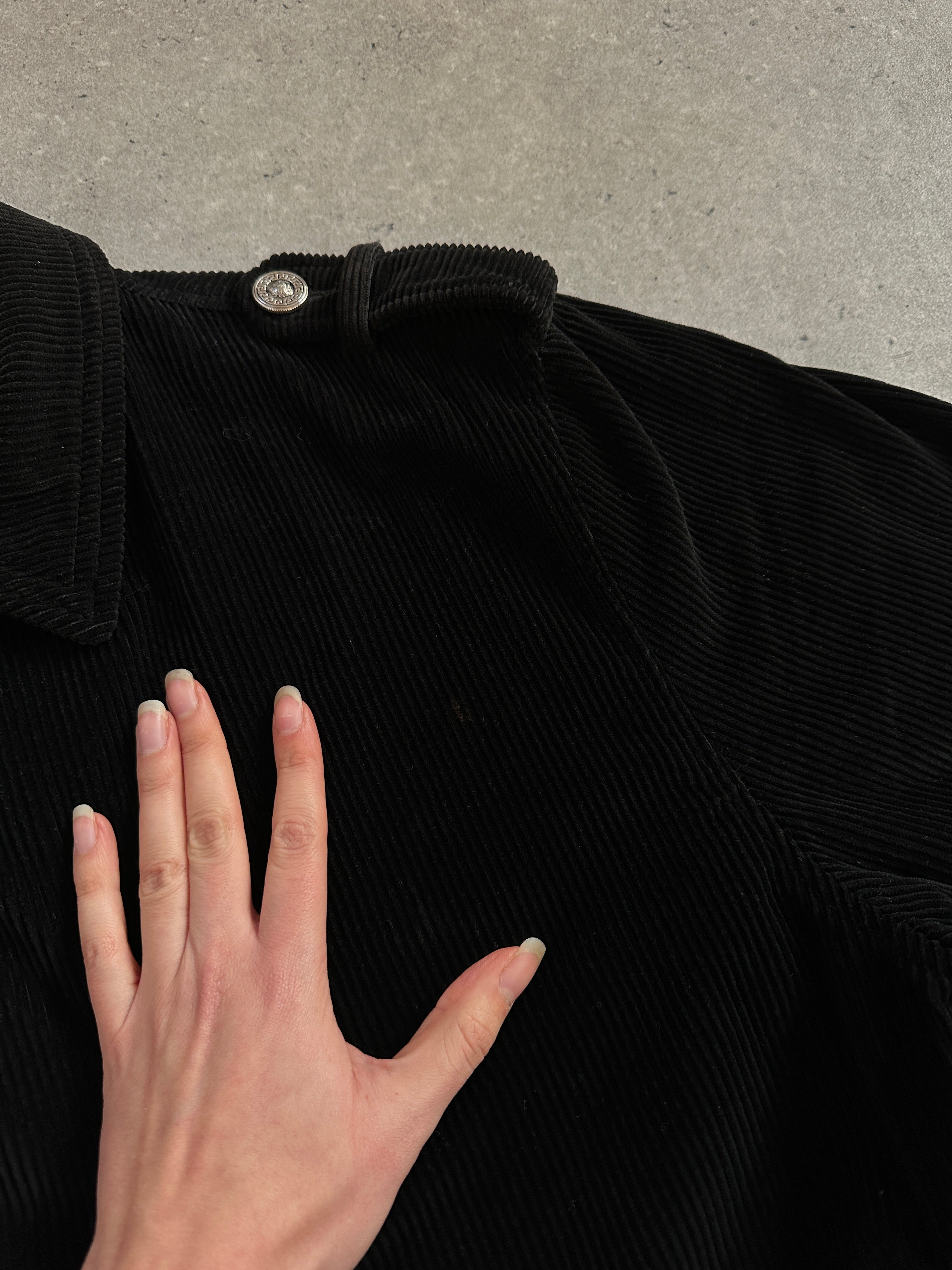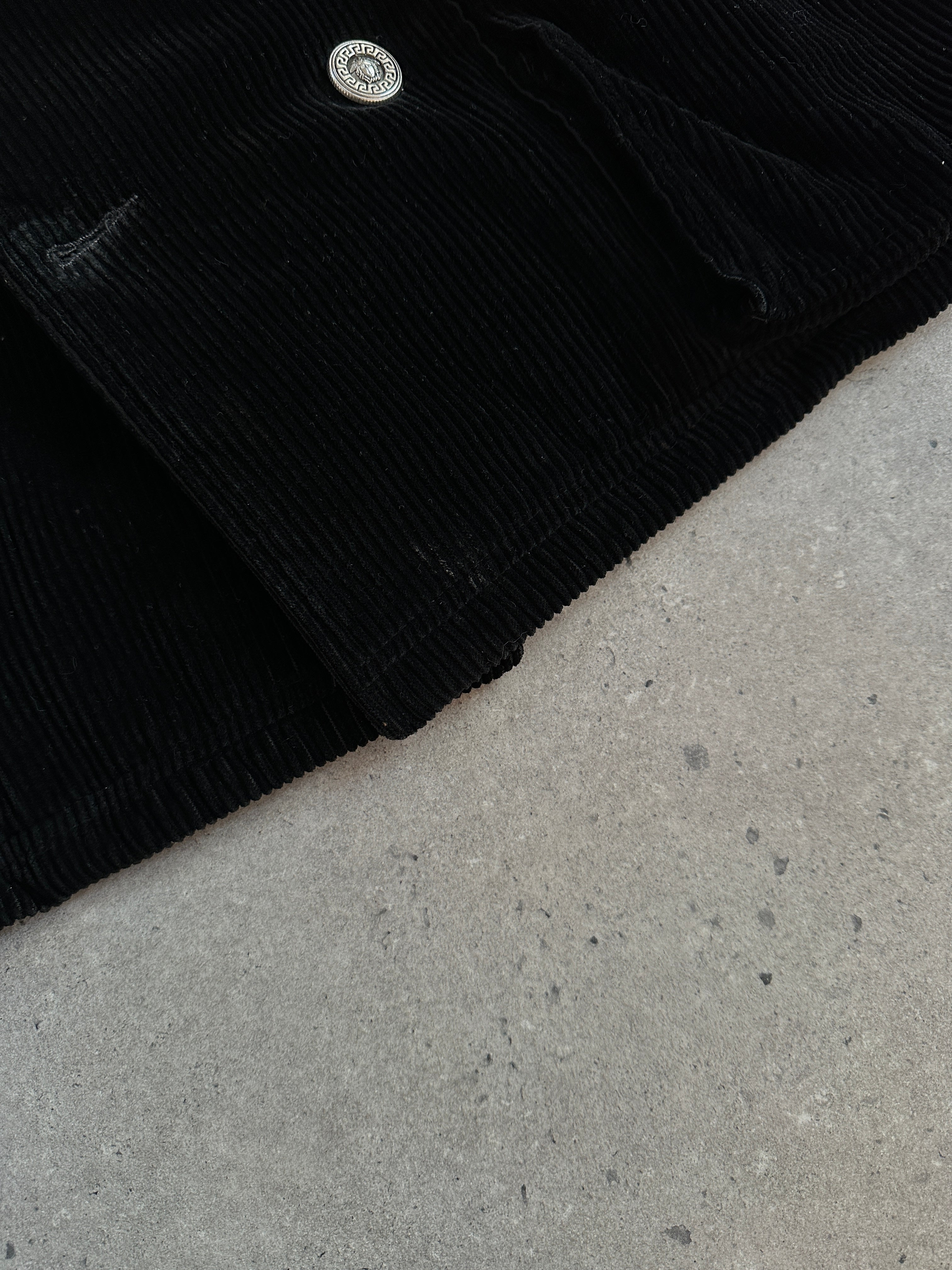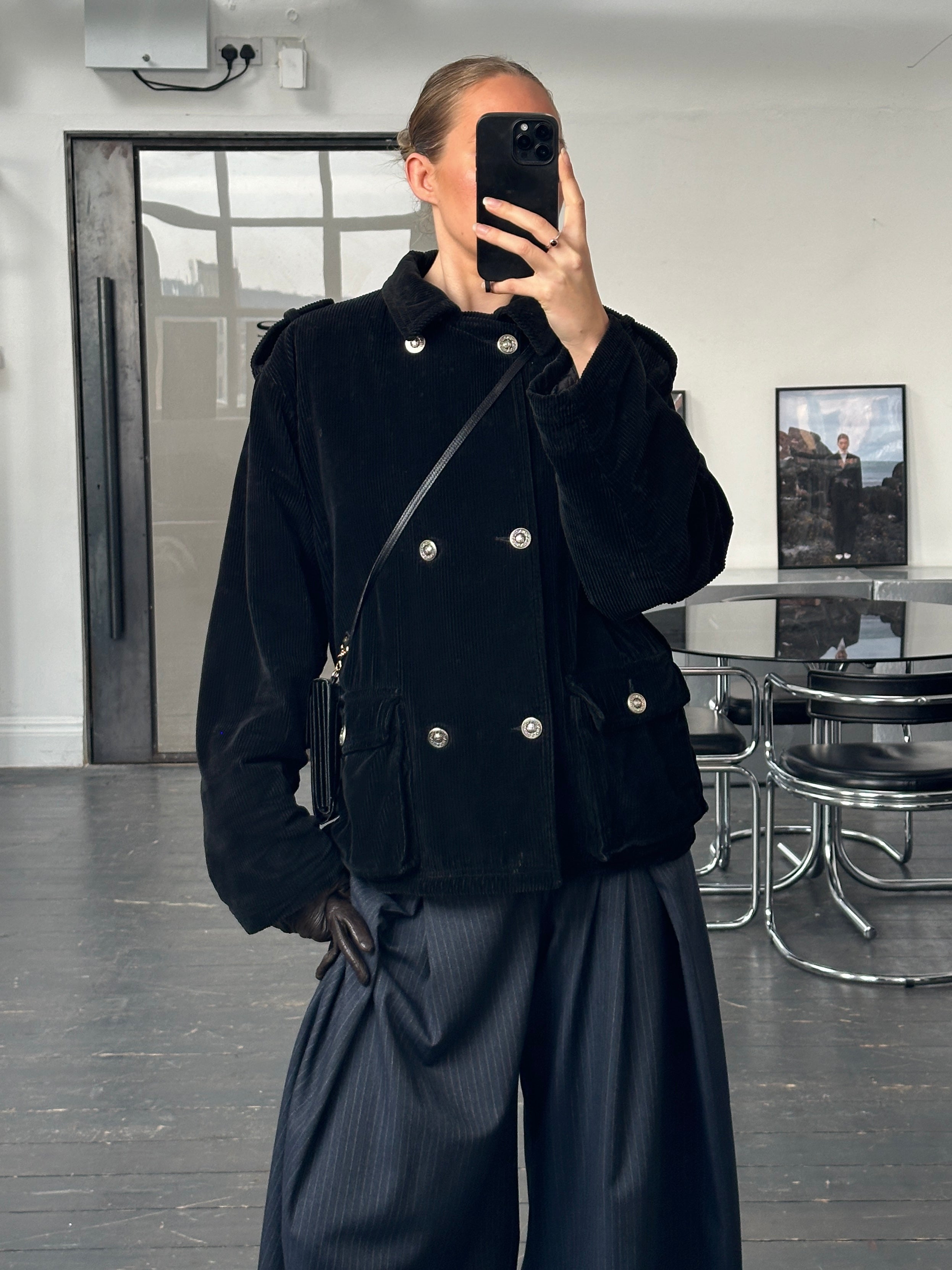 Vintage 1990s Versace Sport double breasted jacket in deep black corduroy. A structured yet relaxed silhouette with utilitarian detailing and signature bespoke Medusa buttons.